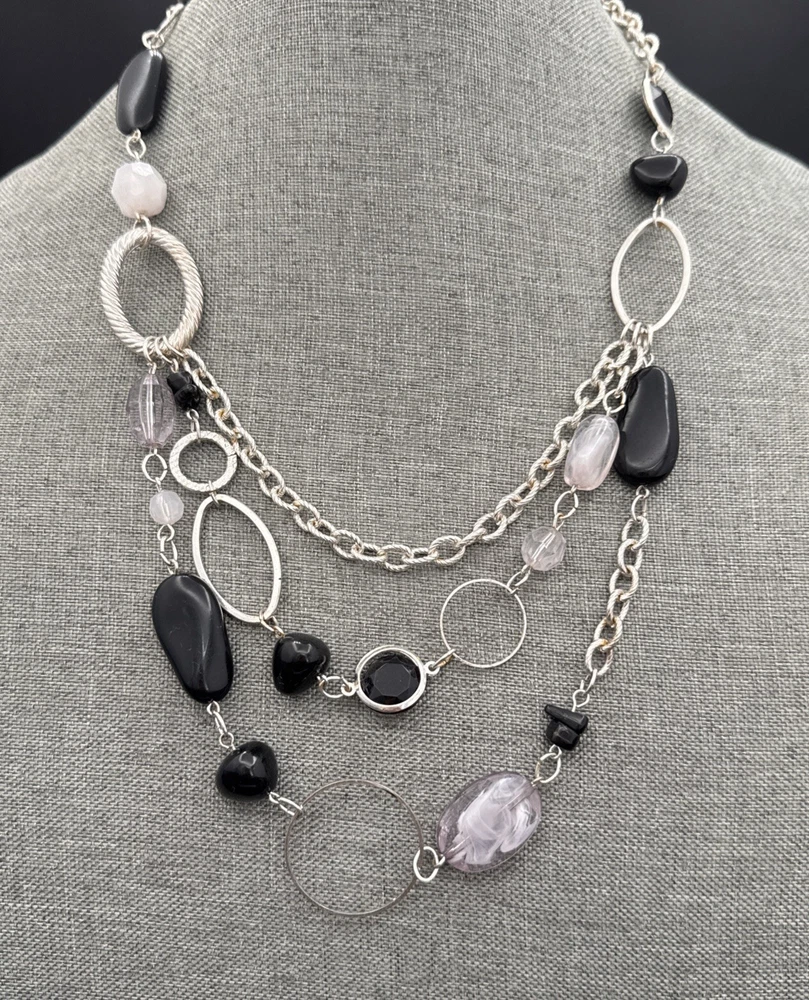 HomeNecklace Bib Style 3 Dangling Chains with Black White Beads 21 Inches See Photos