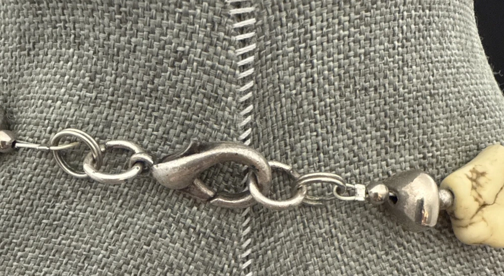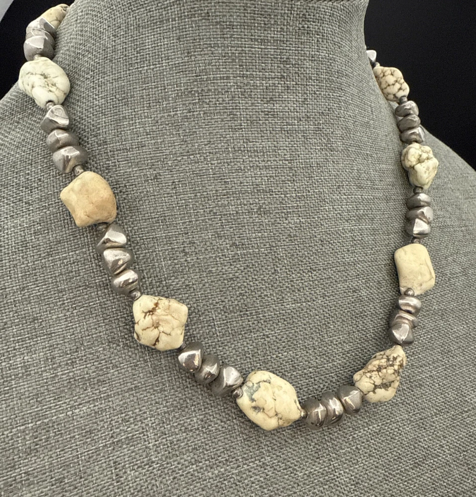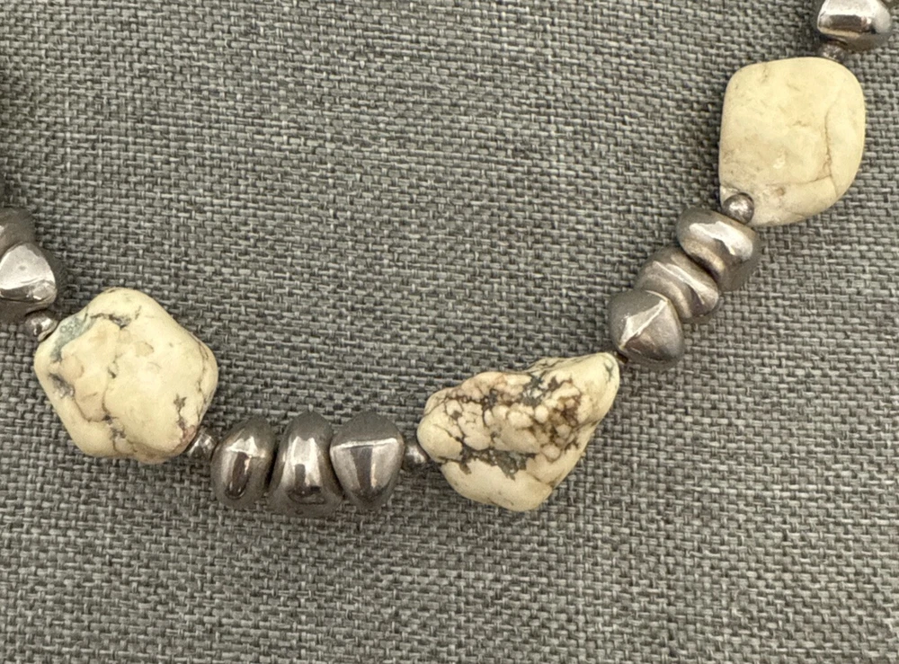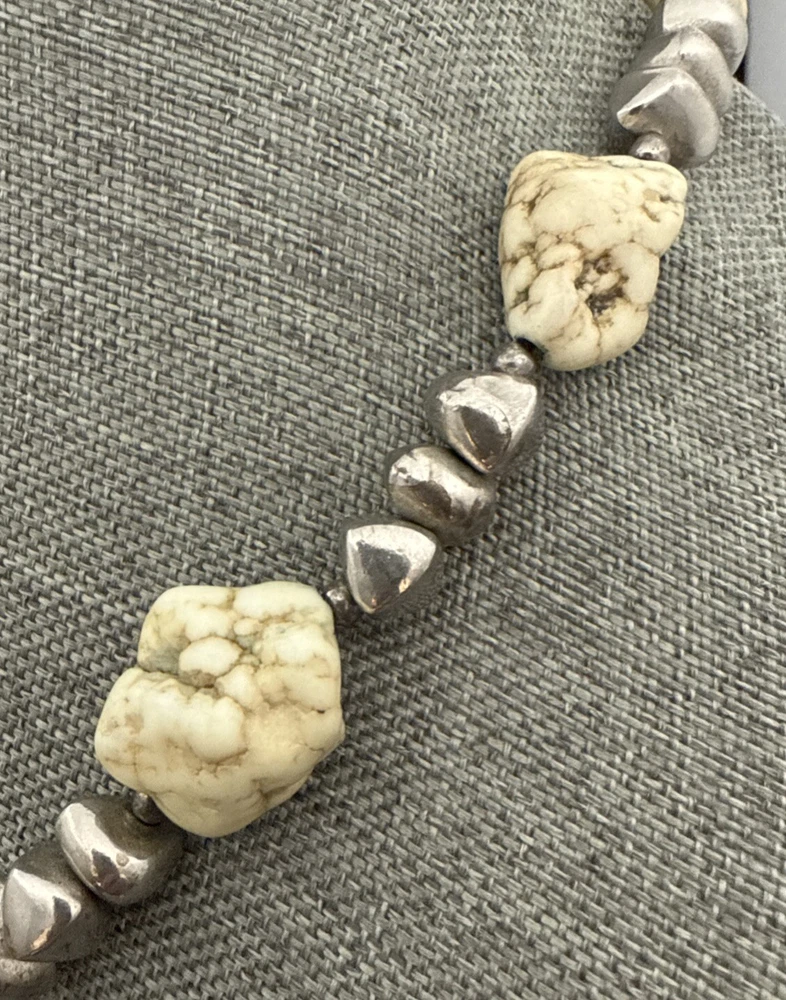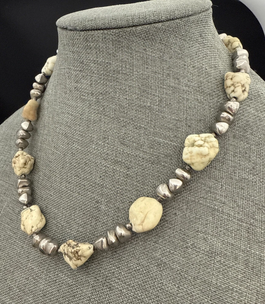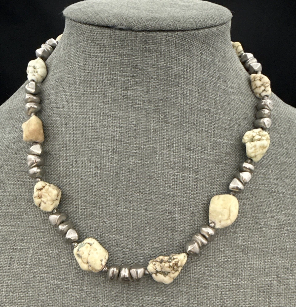 Metal Purity:UnknownMain Stone Creation:UnknownWholesale:NoAntique:NoUPC:Does not applySeller Warranty:YesColor:Off White Green Veins, SilverMPN:UnknownCountry of Origin:UnknownMaterial:Stone, Beads, MetalMain Stone Depth:MultipleVintage:YesPendant/Locket Type:NoneMetal:UnknownEra:UnknownSetting Style:NaturalMain Stone Treatment:UnknownMain Stone Length:MultipleMain Stone Color:Off White Green VeinsSigned:NoNecklace Length:19 inChain Type:Unknowngtin13:Does not applyMain Stone Shape:Chunky RoundishNumber of Gemstones:NumerousMain Stone:MagnesiteHandmade:NoBase Metal:UnknownMain Stone Width:MultipleStyle:BeadedTheme:BeautyPendant Shape:NoneLength (inches):19 InBrand:UnbrandedCountry/Region of Manufacture:UnknownType:NecklaceClosure:LobsterOccasion:AllCustomized:NoPersonalize:No