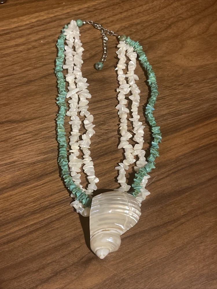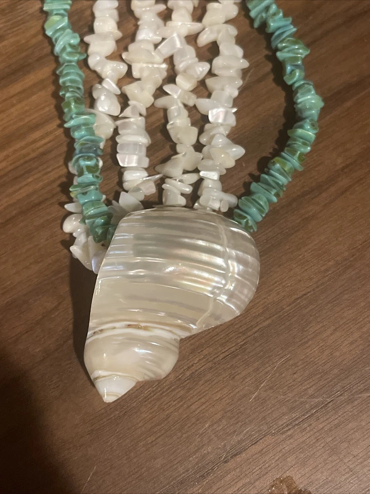 This vintage necklace is a stunning piece of jewelry that features a beautiful white mother of pearl shell and tumbled puka shells. The necklace is 18 inches long and has a large shell pendant with white and blue beaded style that adds to its overall elegance. The shell material gives the necklace a unique and organic feel that is sure to catch the eye of anyone who sees it. This necklace is perfect for those who appreciate vintage and antique jewelry and want to add a touch of nature to their style. I don’t believe the blue is turquoise.