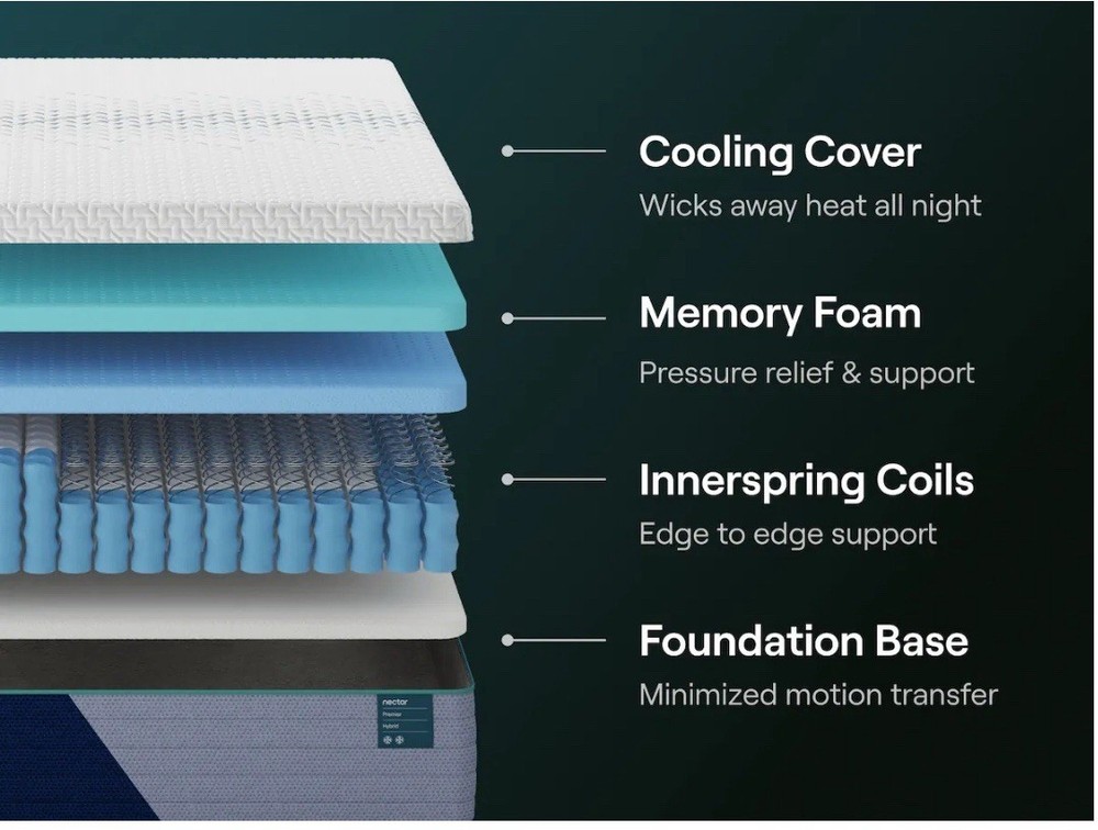 The Nectar Premier Hybrid King Mattress is a luxurious and supportive mattress designed for ultimate comfort. With a thickness of 13 inches and a medium firmness level, this mattress offers the perfect balance of softness and support for a restful night's sleep. The hybrid design combines the best of both worlds, with cooling technology and a breathable fabric cover for a comfortable and cool sleeping experience. This mattress is an excellent choice for any bedroom setting.