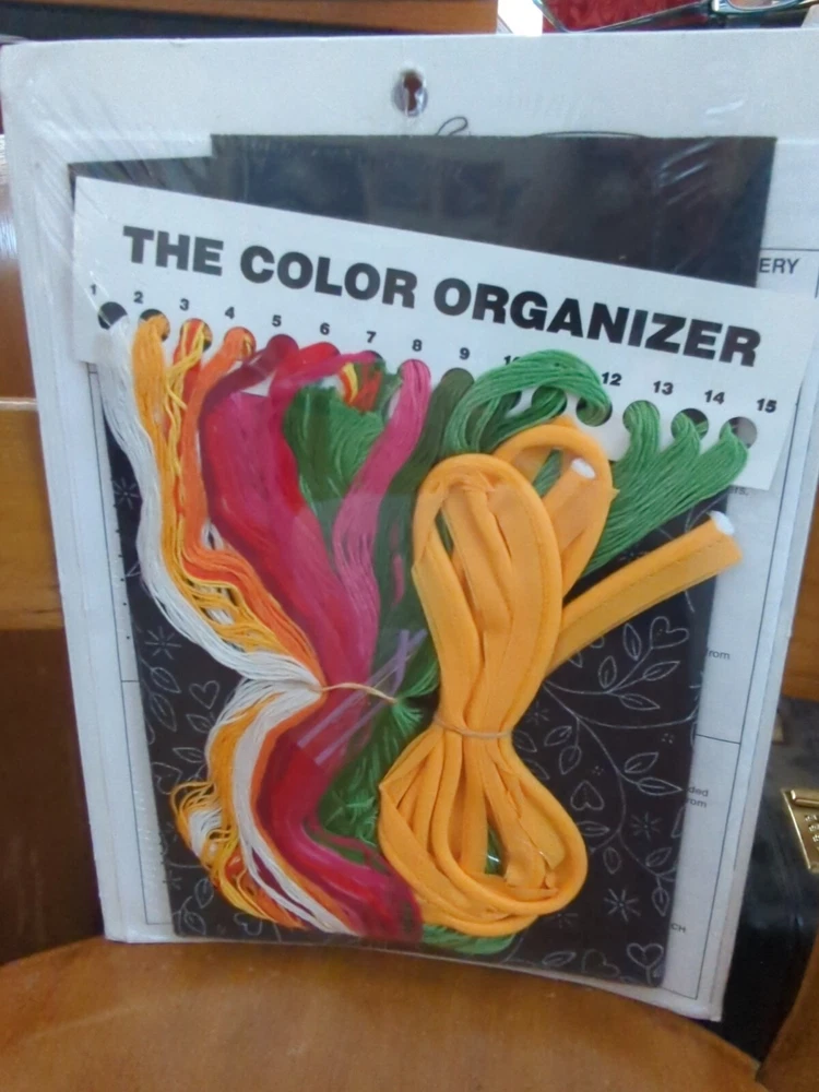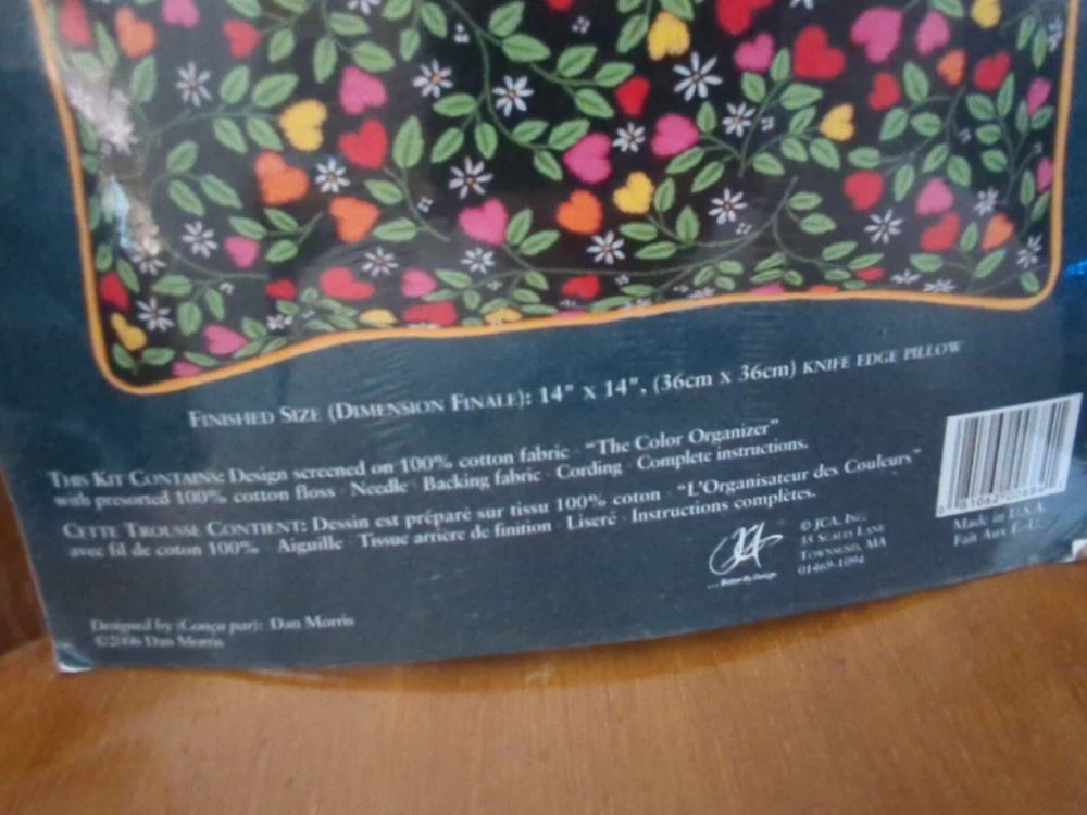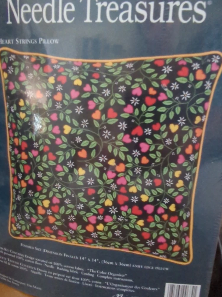 Needle Treasures Heart Strings Pillow Kit Designed by Dan Morris Striking black background with bright hearts and vines. Finished size 14 x 14" Perfect for St. Valentine Day - or any day to show someone you care! Kit includes: Design screened on 100 percent cotton fabric, color organizer with presorted cotton floss, needle, backing fabric, cording, instructions. Made in USA, 2006