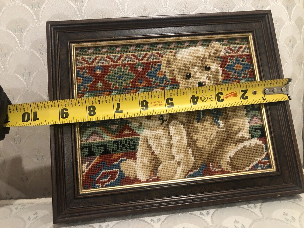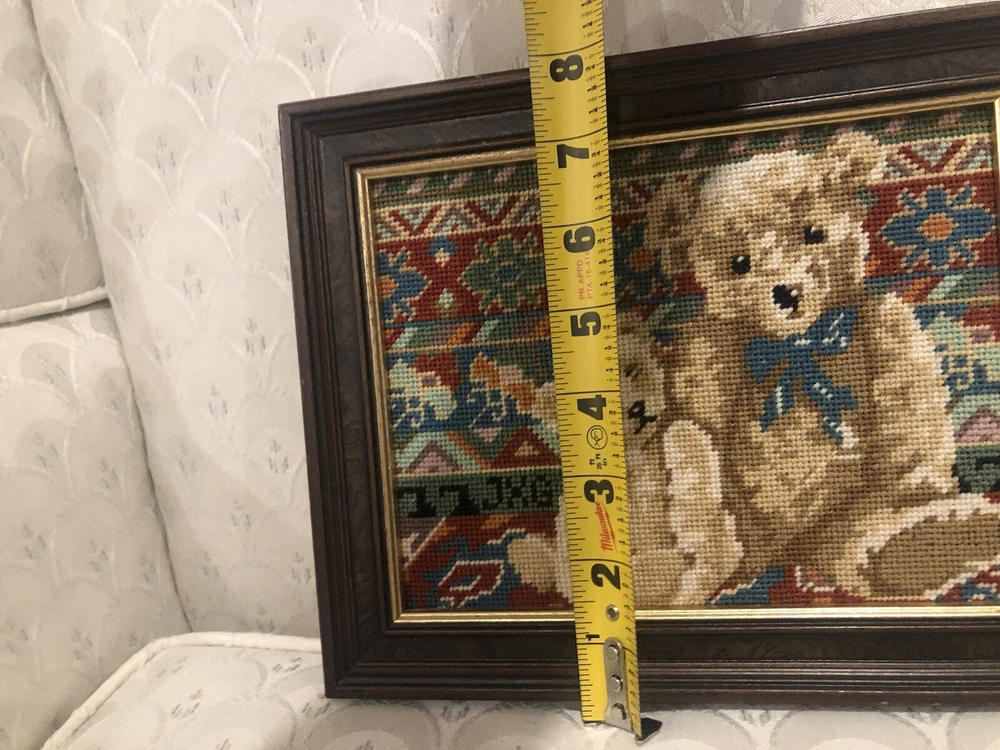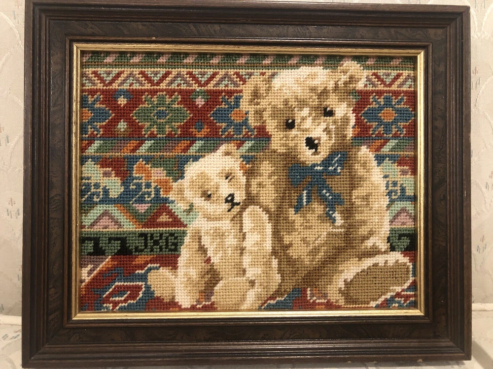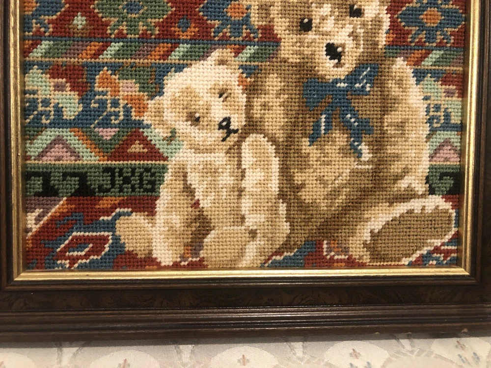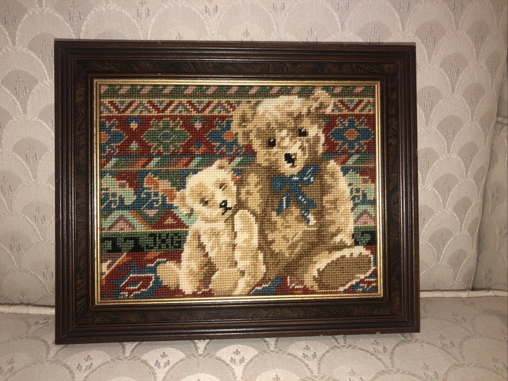 Needlepoint Hand Done Teddy bear Picture Nicely Framed Professionally Would be really cute in nursery or child’s bedroom. Very nicely done artist initials in needlepoint.
