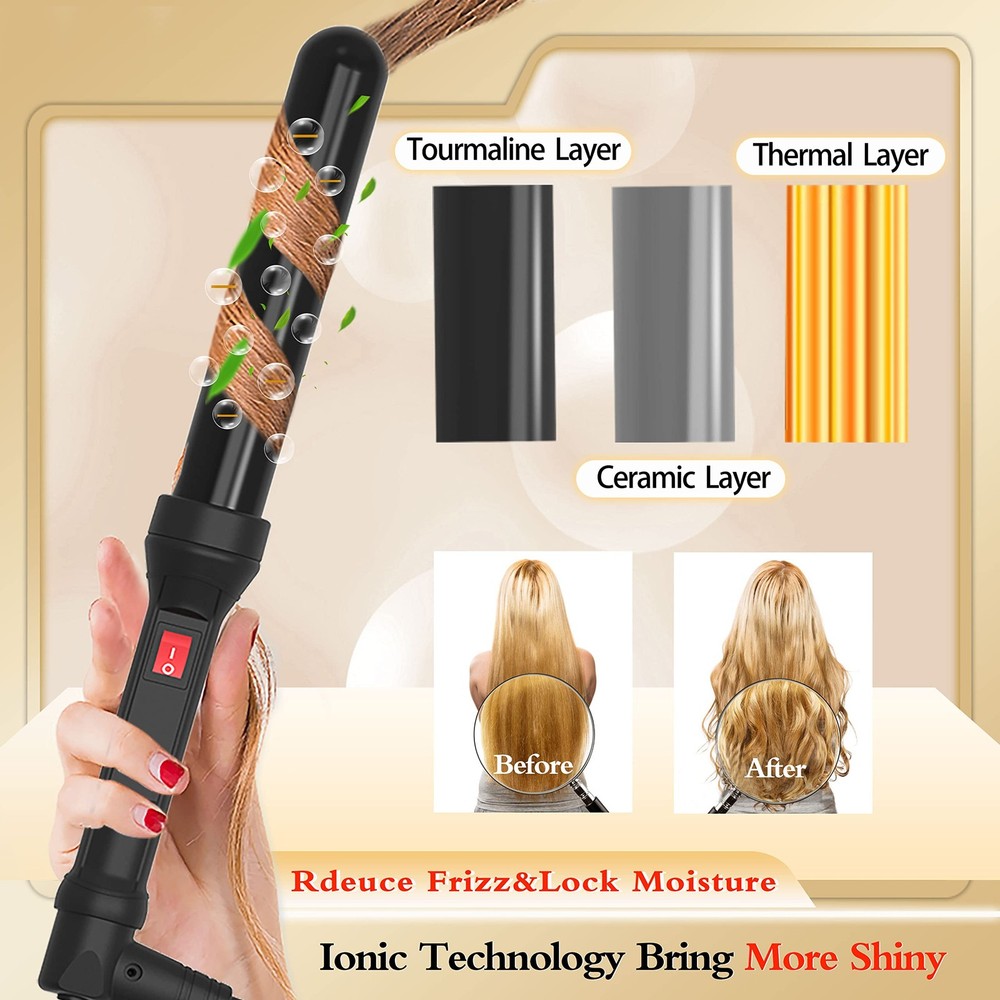 ceramic Argan oil coated barrel curling irons create smooth,soft and fashion salon glamorously shining curling hair for you. 1.Ceramic Keratin and Argan oil coating: Our ceramic Keratin and Argan oil coating effectively minimizes heat damage by providing a protective barrier between the hair and the iron.It eliminates residue build up and clean for mess-free styling.Create desirable silky smooth,and frizz-free locks effortlessly. 2.Negative ions technology: Advanced ceramic glaze technology,release a large number of negative irons and small molecules minerals directly penetrate into the hair,promote the formation of amino acid and protein,make hair strong luster,curling hair does not hurt at the same time. 3.Heats up fast: High heat combined with ceramic coated barrel curling iron ultra-fast heat up,the curling iron gives you a professional-quality styler with a ceramic heater.Reach temperatures up to 450 degrees(F) in just 30 seconds and you can style quickly and efficiently. 4.Ergonomic design: Our smooth,revolving handle,made of quality lightweight and heat-resistant materials,maximizes turning control to cuil effortless around hair.Our 360 degree swivel connection prevents tangling. 5.Universal design: Worldwide dual voltage 110v-240v,you are able to use it anywhere.(The electrical plug is designed for US and you just need a correct plug adapter when travel other countries.) WHAT YOU GET 1 hair curler 1 safety glove 1 safety mat 1 instruction and