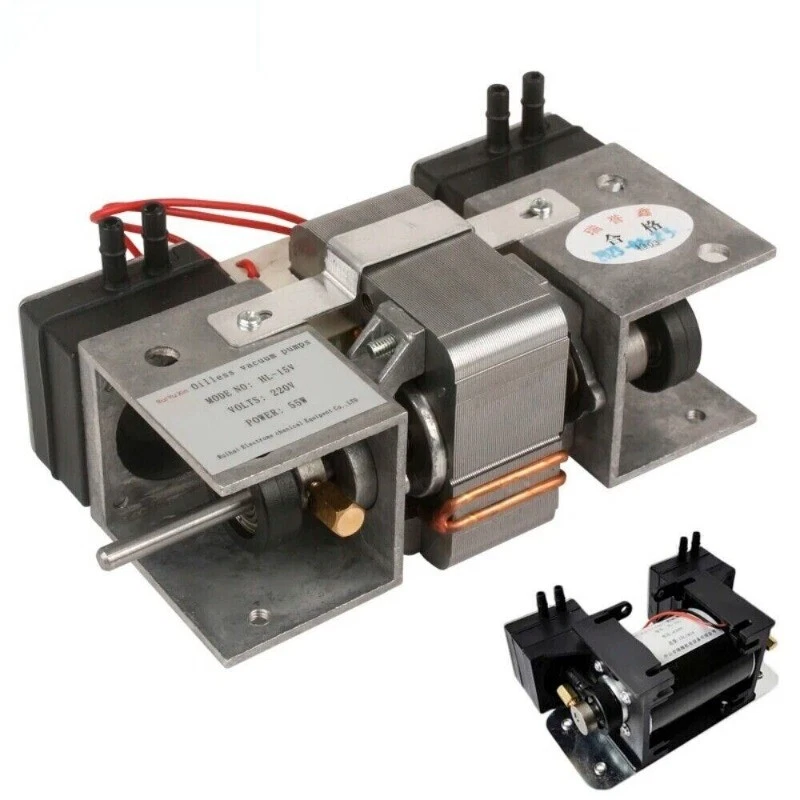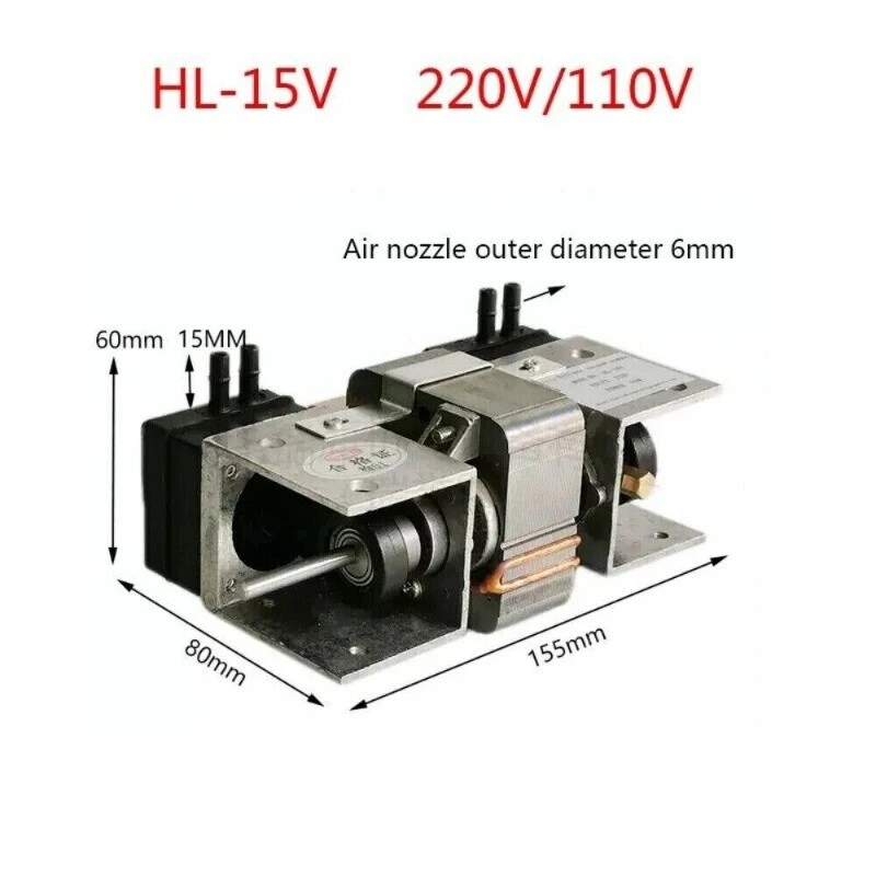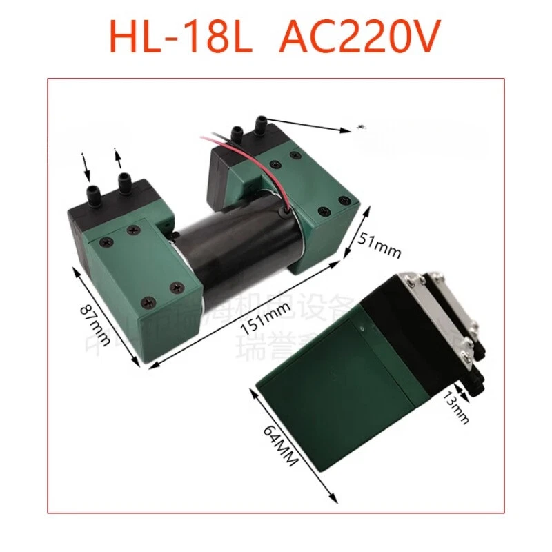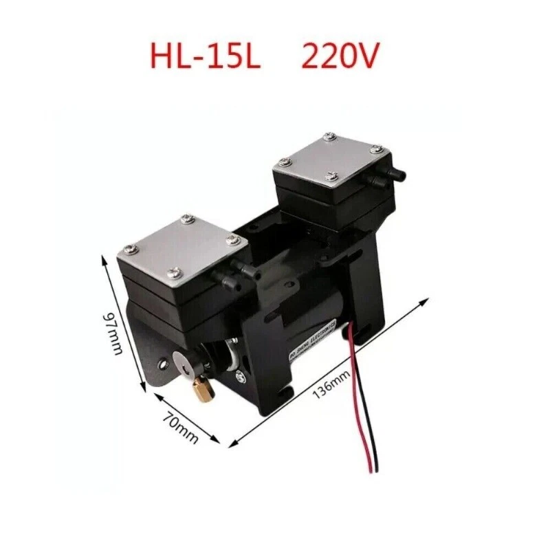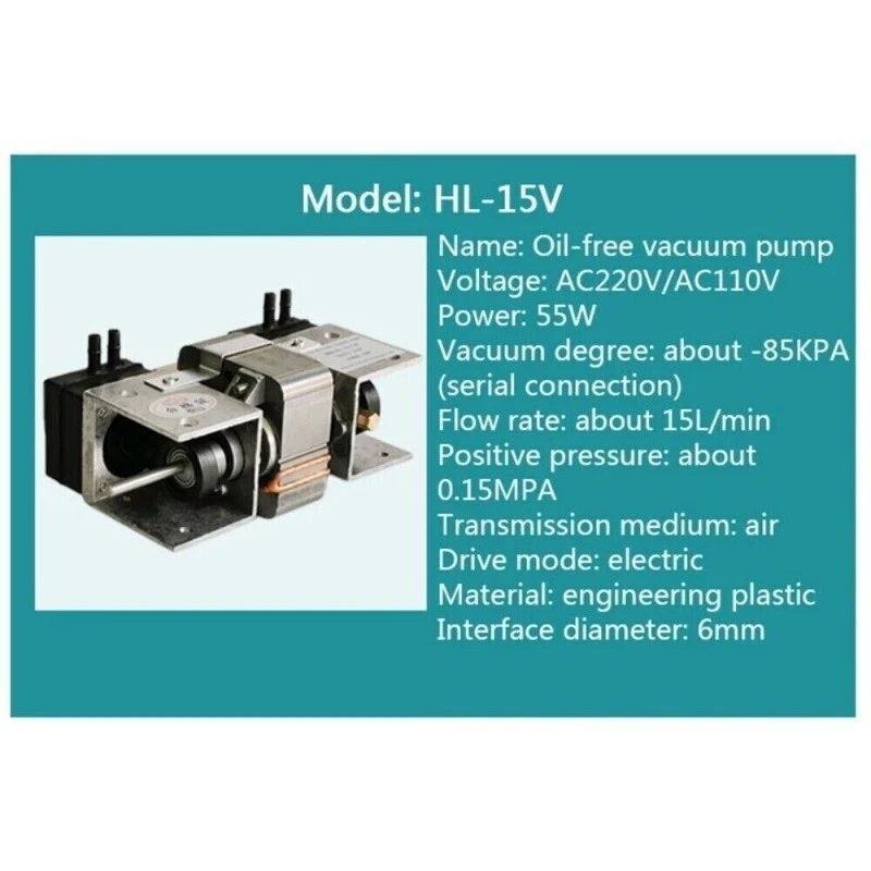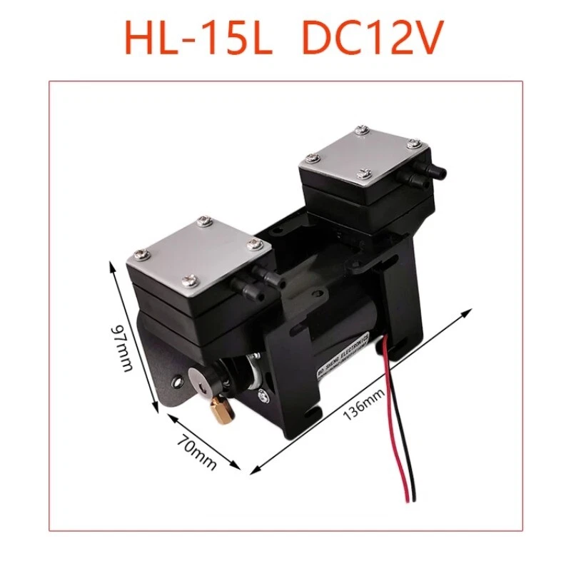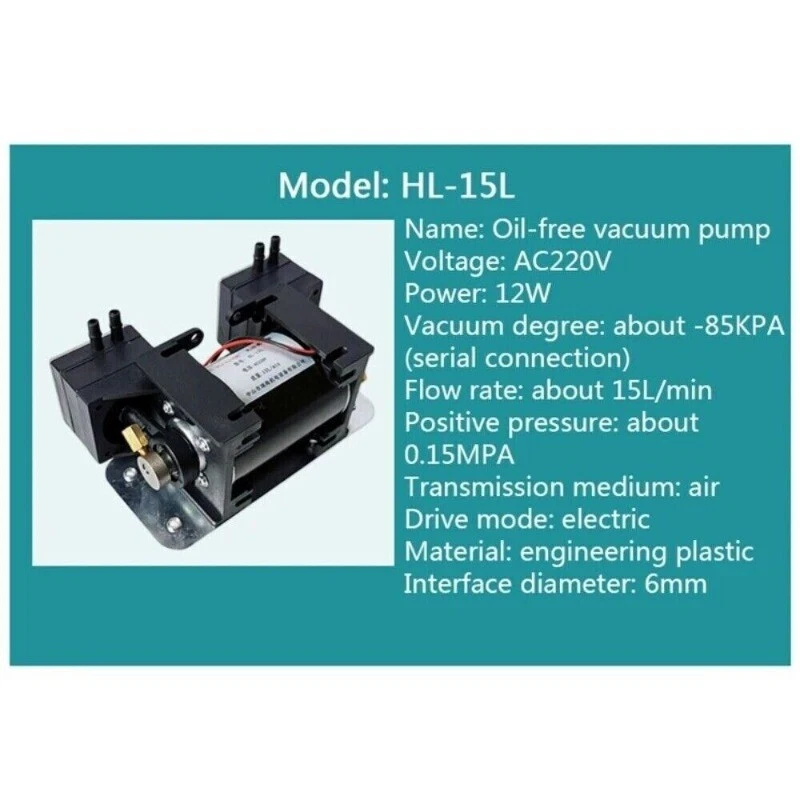 Vacuum pump small pumping beauty instrument pump mini DC 12V220 mute oil-free hygiene mute high negative pressure Model:HL-15L Name:Oil-free vacuum pump Voltage:AC220V/DC12V Power:12W Vacuum:about -85KPA (series connection) Flow rate:about 15L/min Positive pressure: about 0.15MPA Conveying medium: air Driving method: electric Material: engineering plastic Interface caliber: 6mm