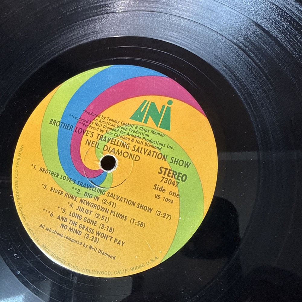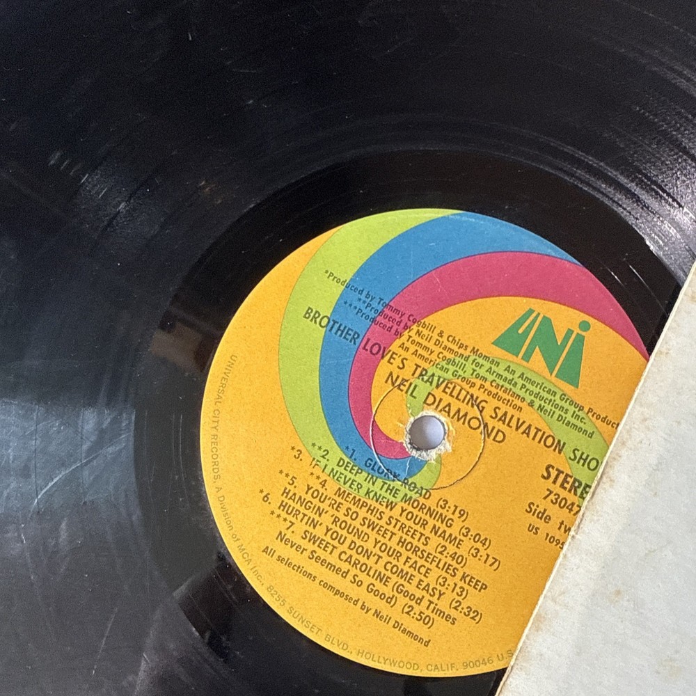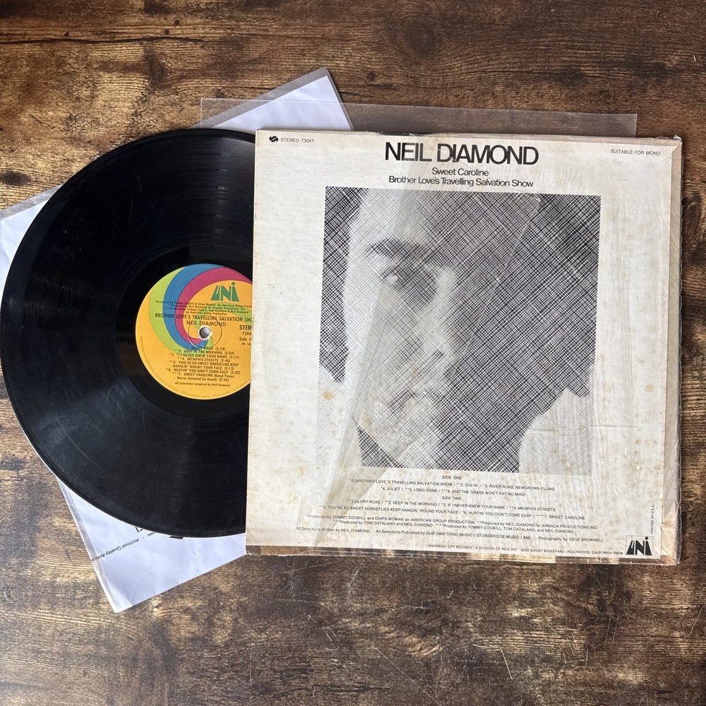 Fast same-day business shipping. Thank you so much for your interest. If you have any questions, please feel free to ask. The product is a first edition reissue of Neil Diamond's 1969 Uni LP titled "Brother Love's Travelling Salvation Show/Sweet Caroline." This vinyl record features a mix of pop, soft rock, and pop rock music in English. Produced by Tommy Coghill and Chips Moman, the album is in good condition and comes in a cardboard sleeve. The 12" record is in stereo format and is a must-have for fans of Neil Diamond and 1960s pop music.