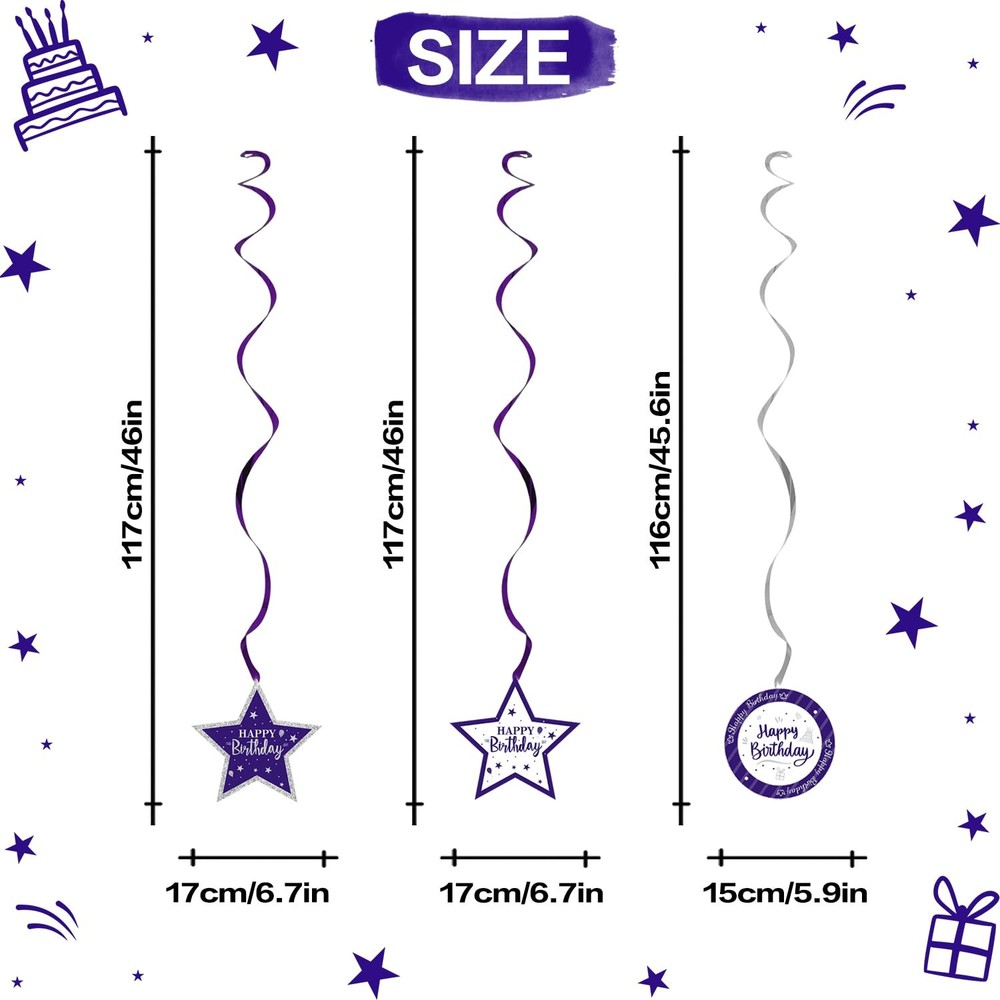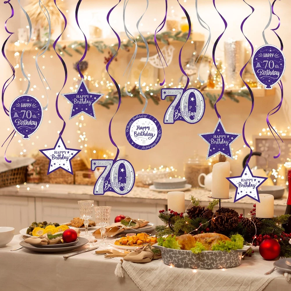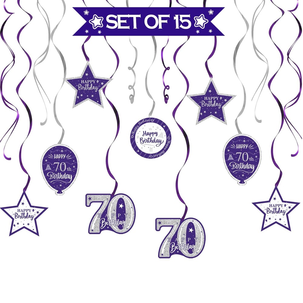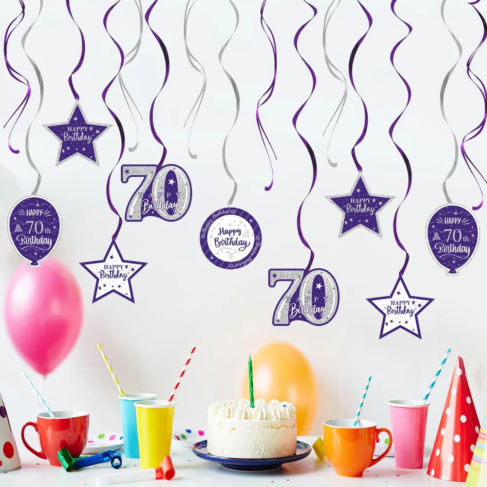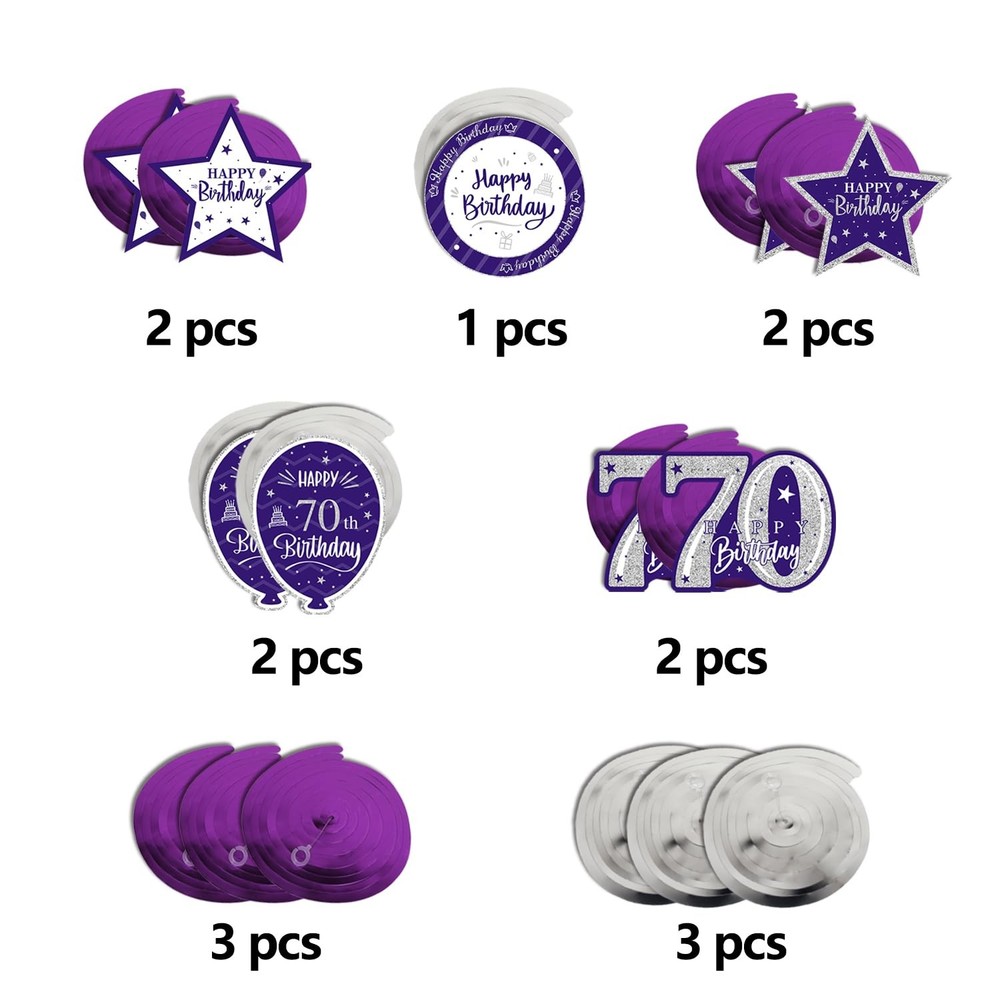 1 [WAHT YOU GET]:🎁You Will Get 15 pcs “Happy 70th Birthday" Swirls Streamers - Purple & Silver Glitter Detail, It Will be a Good Helper to Light Up Your Theme Birthday Party by Decorating with These Colorful Streamers Decorations, Easily Create a Strong Birthday Atmosphere in Your House. [SIZE]:🎈The Swirls Streamers Size about 110'' Long- These Purple & Silver Streamers Birthday Decorations can be a Right Choice if You Want to Make Your Theme Birthday Party More Unforgettable, They can also Become a Suitable Background for You to Take Photos Together with Your Family and Partners while Decorating Your House, You can Decorate Anywhere You Like, Add Joy and Creativity. [MATERIAL]:🎉Streamers is made of Thick Paper and Glitter Details.Sturdy and Durable,Lightweight, Foldable, Not Easy to be Torn,It can Last for a Long Time after Being Decorated. [HAPPY BDAY]:🎊The Streamers No Assembly Required, Just Open the Packaging and Make it Longer to Decorate Your Party. You can Easily Hang Wherever You Like.Let Your Guests Enjoy a Party Visual Feast WhenThey Step Into Your Lovely Party House. [QUESTION]:🎈We suggest that you check for any quality damage upon receiving the goods. If so, you can contact us as soon as possible to resend the new product to you, so as not to miss your precious party.