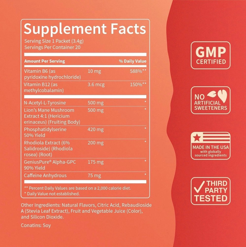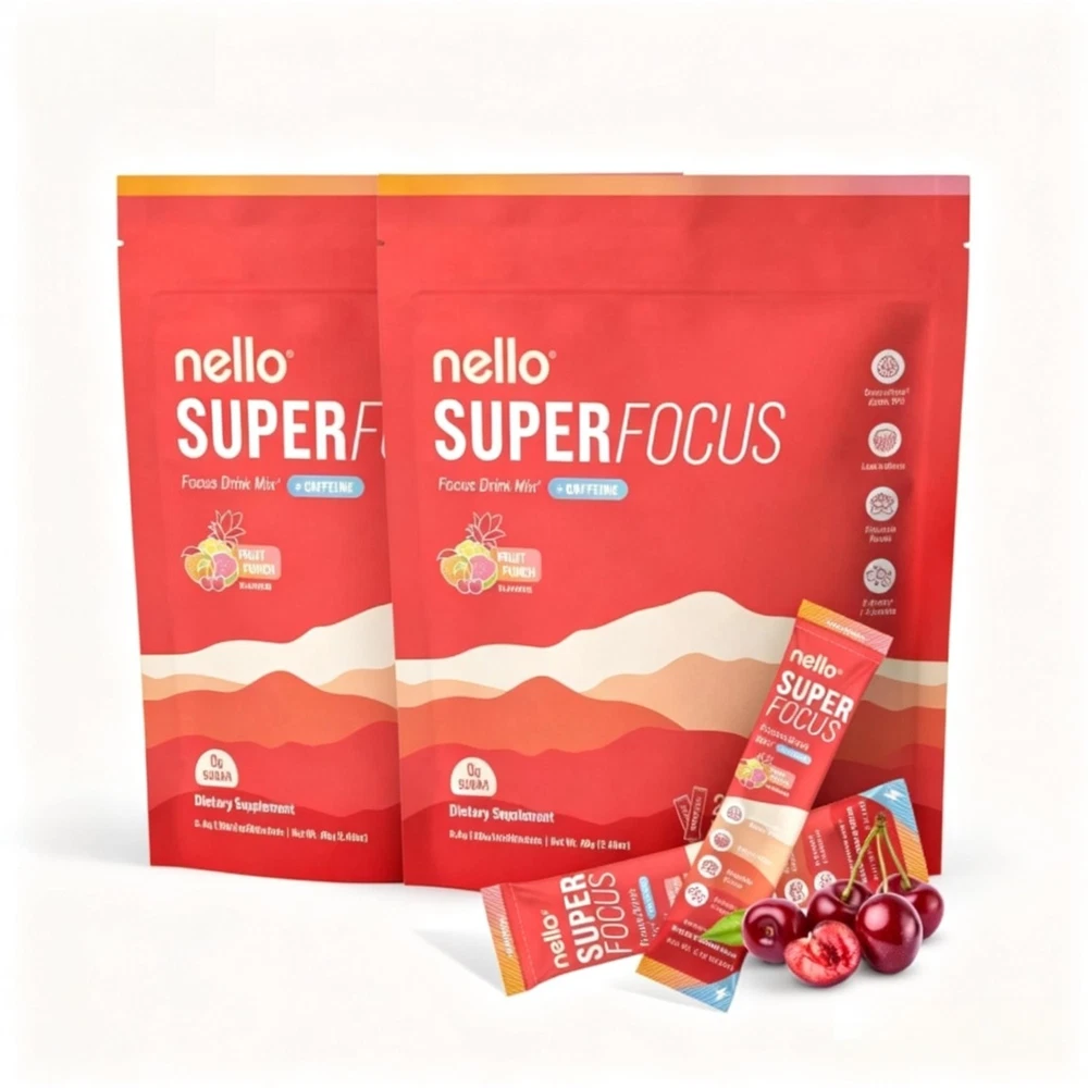 Unlock razor-sharp mental performance with SuperFocus. Our scientifically-crafted nootropic blend pairs the power of Alpha GPC, Lion’s Mane, Rhodiola Rosea, and N-Acetyl L-Tyrosine to actively support cognitive function, enhance memory, and deliver the precision of thought needed for your most demanding days. Sustain your momentum with 75mg of clean caffeine , carefully calibrated to deliver a smooth, focused energy lift without jitters or the dreaded afternoon crash—ideal for powering through long workdays, intense study sessions, or any deep-focus pursuit. Never sacrifice taste for function. We’ve perfected a bright, refreshing Fruit Punch flavor , entirely guilt-free with zero added sugar . It’s the delicious, energizing treat that fits seamlessly into your wellness-focused routine. Designed for the driven, our on-the-go stick packs make excellence portable. Each box contains 20 single-serve sticks, ready to deliver enhanced clarity anytime, anywhere. The perfect tool for busy professionals, dedicated students, competitive gamers, and peak-performance athletes . We believe in clean fuel for your mind. SuperFocus is made from premium, purposeful ingredients and is free from added sugars, artificial flavors, and unnecessary fillers . This is pure, focused energy—no compromises.
