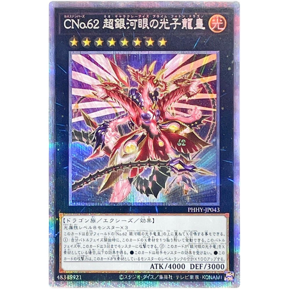 Set: Photon Hypernova Card Number: PHHY-JP043 Language: Japanese Character: Number C62: Neo Galaxy-Eyes Prime Photon Dragon Card Type: Effect Xyz Monster Rarity: Prismatic Secret Rare Card Name: Number C62: Neo Galaxy-Eyes Prime Photon Dragon Game: Yu-Gi-Oh! TCG Vintage: No Country/Region of Manufacture: Japan Material: Paper Manufacturer: Konami Custom Bundle: No Age Level: 6+ Card Size: Standard California Prop 65 Warning: No Problem Finish: Foil