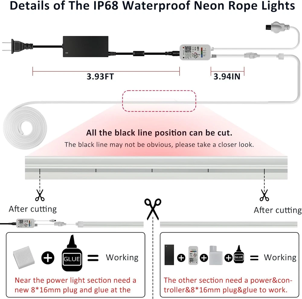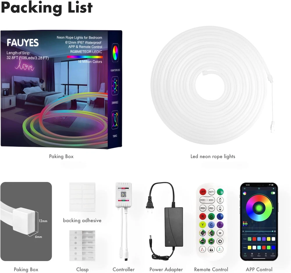 Store New Arrivals Add to Favorite View Feedback Contact Neon Rope Light,16.4Ft ICRGB LED Strip Lights,Ip67 Waterproof Flexible LED Lights,Control with App/Remote,Music Sync Game LED Neon Strip Lights,For Gaming Room Living Outdoors Decor Description Item model number YYKJ-612HCNHLY5M Light Source Type LED Style Modern Number of Items 1 Power Source Corded Electric Number of Light Sources 150 Control Method App Theme Music Batteries Included? No Controller Type Remote Control Connectivity Protocol Bluetooth Wireless Communication Technology Bluetooth Material Copper Package Dimensions 8.46 x 8.19 x 2.05 inches Included Components 1 x Remote Control, 1 x User Manual Indoor/Outdoor Usage Indoor Light Color Neon Water Resistance Level Waterproof Batteries Required? No Item Weight 1.34 pounds Connectivity Technology Bluetooth Special Features Timer Special Feature Timer Part Number YYKJ-612HCNHLY01 Color Neon Wattage 5 watts Voltage 110 Volts Product Description Product Details Smart home light,make life more colorful Over 16 million colors provide endless decor options,Multifunctional ICRGB led strip lights for whole household will look more stunning to decorate your vibrant life. sfG PACKAGE INCLUDED 1 x 32.8FT ICRGB LED Neon 1 x 24V power supply 1*controllers 1* Remote Control with Timer Function 1*retaining buckle 1*user manual Product Specifications led rope lights Type:3535SMD 108Leds/3.28FT Life Expectancy:10000 Hours Input: AC100-240V Output:DC 24V Beam Angle:120 Working Temperature:-20℃~+45℃ Remote Distance: within 5M Our neon light strips use high-quality LED light sources, which are energy-efficient and have a long lifespan. The IP67waterproof design effectively prevents short circuits or moisture damage caused by rainwater, extending their service life. Moreover, our neon light strips have excellent durability and shock resistance, withstanding the challenges of external environments. light strips can meet your needs Timing Setting Lights for bedroom can auto open/close at set time Music sync You can watch your music spill over from your speakers into the room around you in colorful, dynamic light. Immersive Lighting Effects Personalized vibrant lighting for larger spaces ABOUT US We offer the best prices around on high quality products. Our E-store includes media such as books, movies, music and games while offering electronics, toys, sporting apparel, clothing, tools, general home, garden items and more. SHIPPING We are always working hard to ensure your package arrives as soon as possible. Please understand that some factors like weather, high postal traffic, and the performance of shipping companies are outside of our control. We offer free shipping to the lower 48 states and ship within 2 business days of payment, usually sooner. We do not accept P.O. Boxes. Please provide a physical address. RETURNS We offer a 30-Day Return Policy on items which you are not completely satisfied with. You have the option for a full-refund or an exchange of the item. No returns are available on items shipped outside of the USA. PAYMENT We accept PayPal. CONTACT US This page content is yet to come Please ad us to your favorite seller and visit again later Thank You CUSTOMER SATISFACTION We try our very best to make sure every customer is completely satisfied. If there's a problem, message us! We're happy to help