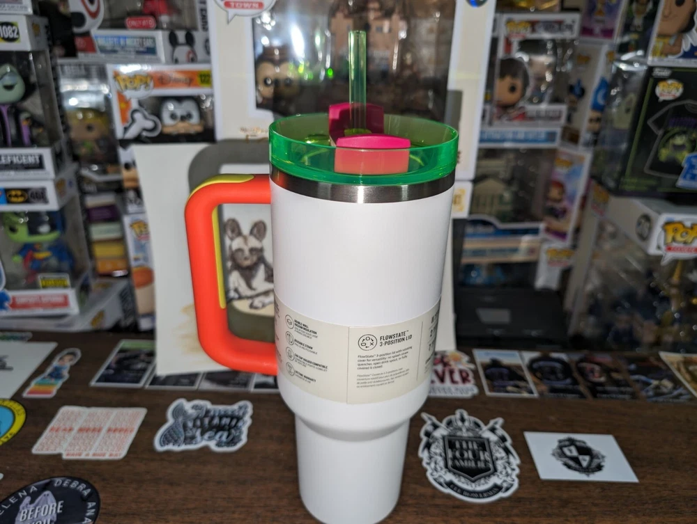 Brand new and ready to ship! A white, with neon accents, 40 oz, Stanley