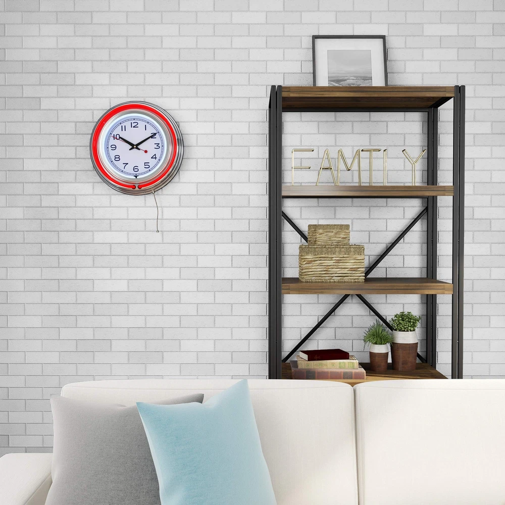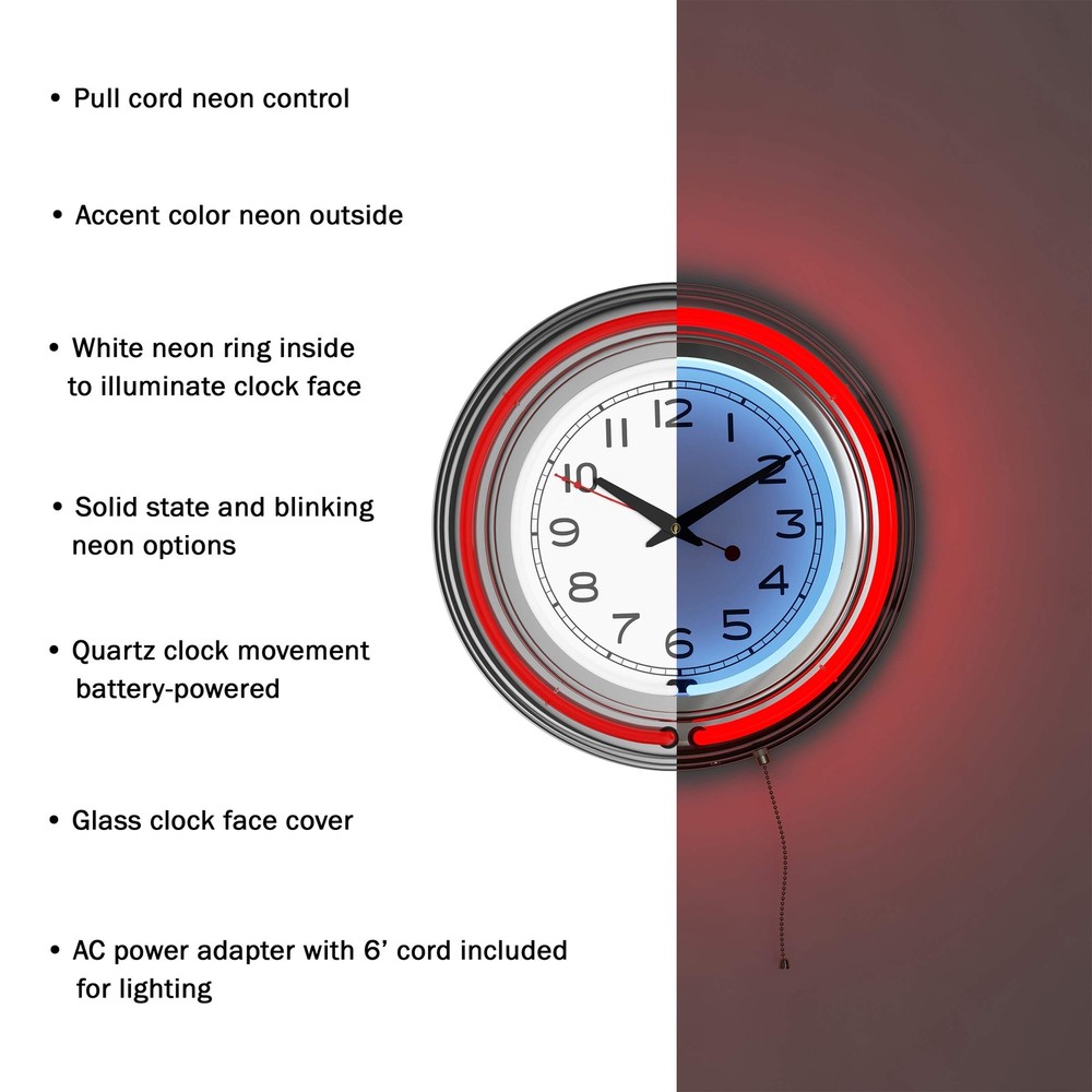 Kick it old school in your bar or game room with this nostalgic Neon Wall Clock by . The perfect clock for bedroom display or use in your entertainment space, this chrome-finished wall clock boasts double neon rings - one vibrant neon blue one around the exterior and one white band that illuminates the clock face on the interior, creating an eye-catching glow that's simple to spot from across the room for easy timekeeping. The battery-operated design makes this large wall clock ideal for use in areas without access to electrical outlets, such as on covered porches, and mounts on the back enable easy display as a hanging kitchen wall clock or retro wall clock for the bedroom. IMPORTANT: is committed to providing the consumer with the absolute best price and value on our entire line of products. NOTE: This is an exclusive product of and ONLY Neon Wall Clocks by are GUARANTEED to be genuine. Avoid buying counterfeit products and transacting with unauthorized sellers. BATTERY-OPERATED WALL CLOCK - Give your entertainment space a 1950's-era feel when classic cars and cherry sodas were all the rage. Retro design features like a white neon inner band and blue neon outer band brighten the room and your mood. VERSATILE POWER - Plug this wall clock in via the 6-foot cord or pop in 2AA batteries for a cordless way to keep the time. This large wall clock comes with a 110-volt AC adapter for easy views of the brilliantly colored lights right out of the box. EASY SETUP AND USE - Depend on this garage and game room wall clock for easy setup and use. Pull the chain on the bottom to toggle between the solid-state and blinking neon light display modes, and mount this wall clock simply via the hole on the back. FLEXIBLE PLACEMENT - Showcase this nostalgic wall clock inside your home or put it to work on your porch or patio. Outdoor spaces like three-season rooms or covered patios and decks make a great space for this round analog clock. PRODUCT DETAILS - Materials: Quartz Mechanism, High-Grade Glass, Chrome, and Molded Resin. Dimensions: (L) 14.5" x (W) 3". Includes: 110V AC Power Supply with 6' Cord and Works with 2AA Batteries (not included). Color: Blue.