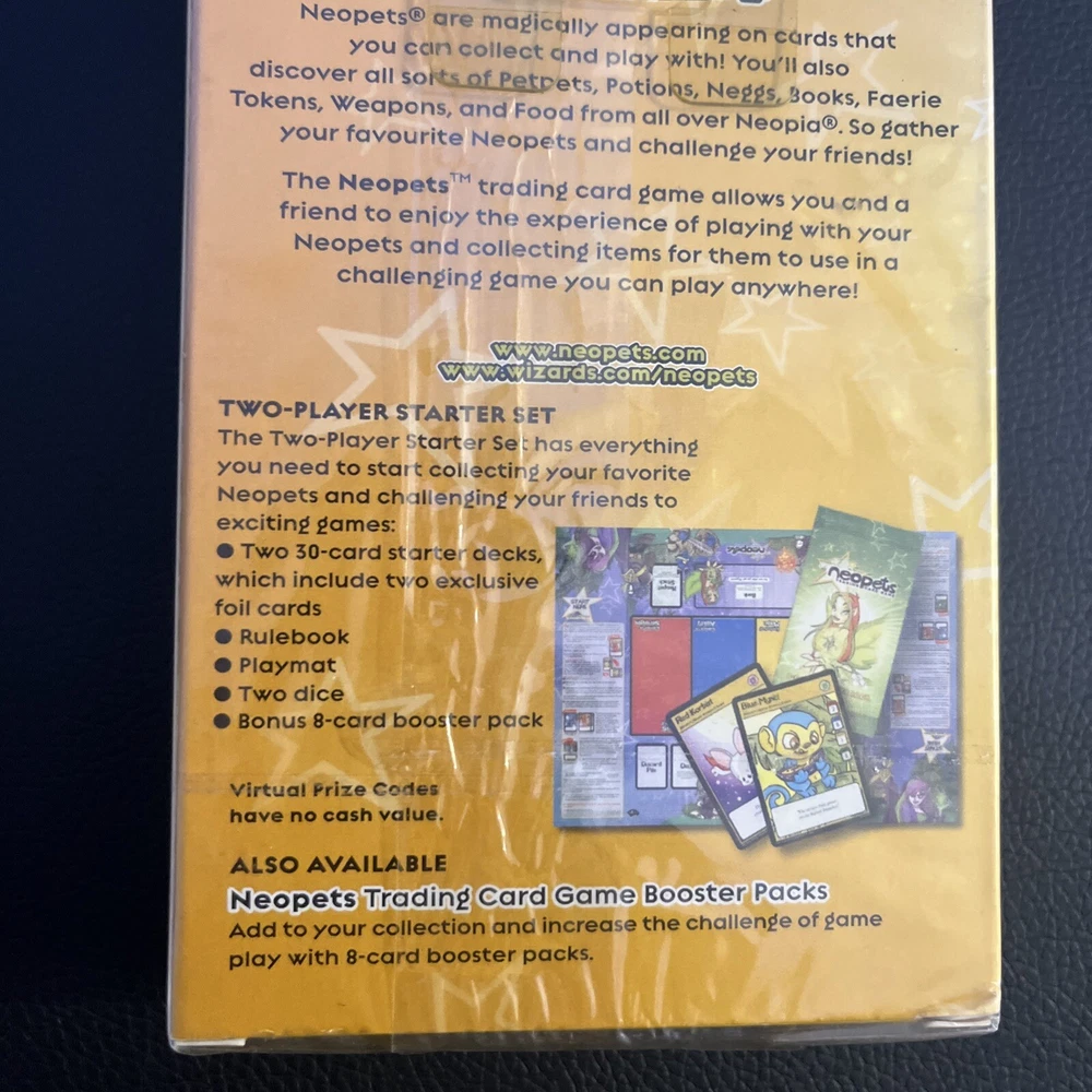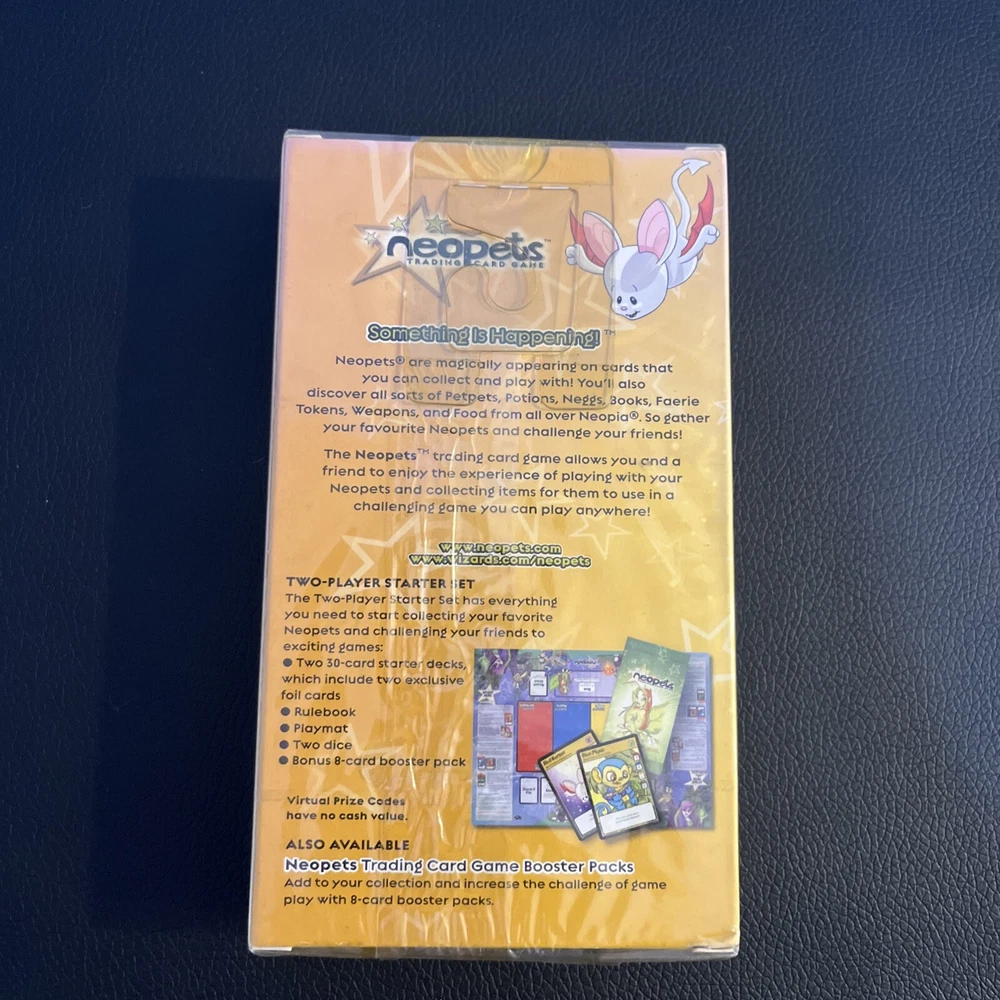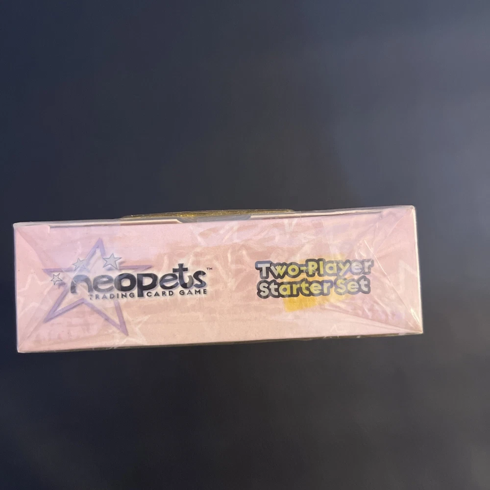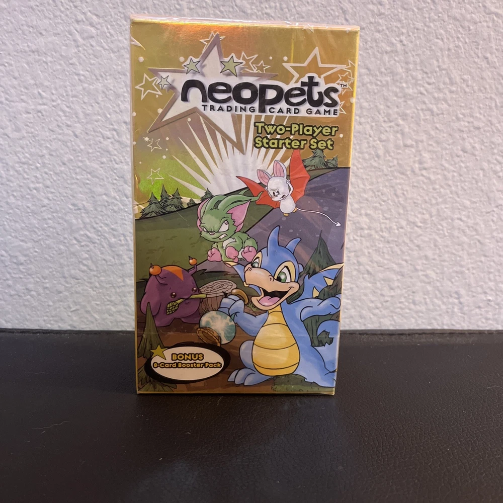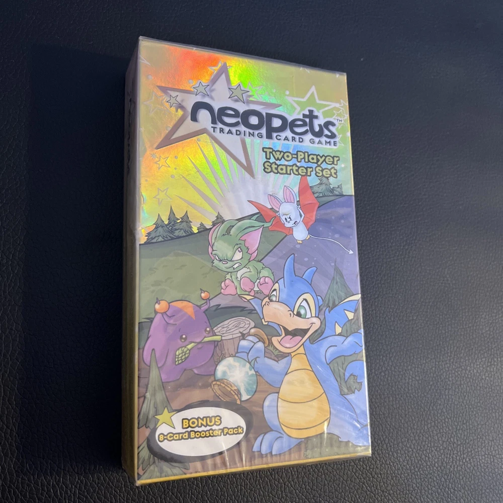 Neopets Trading Card Game Two-Player Starter Set. New box sealed. Includes a bonus 8-card booster pack. Let us know if you have any questions! Please see the pictures for additional details. Note: There is a plastic hanger on the back of the box as the pictures show. Please see the pictures for exactly what you will receive. There are some dents, marks, and other imperfections on the box and outer plastic seal including discoloration . This is unopened and sealed.