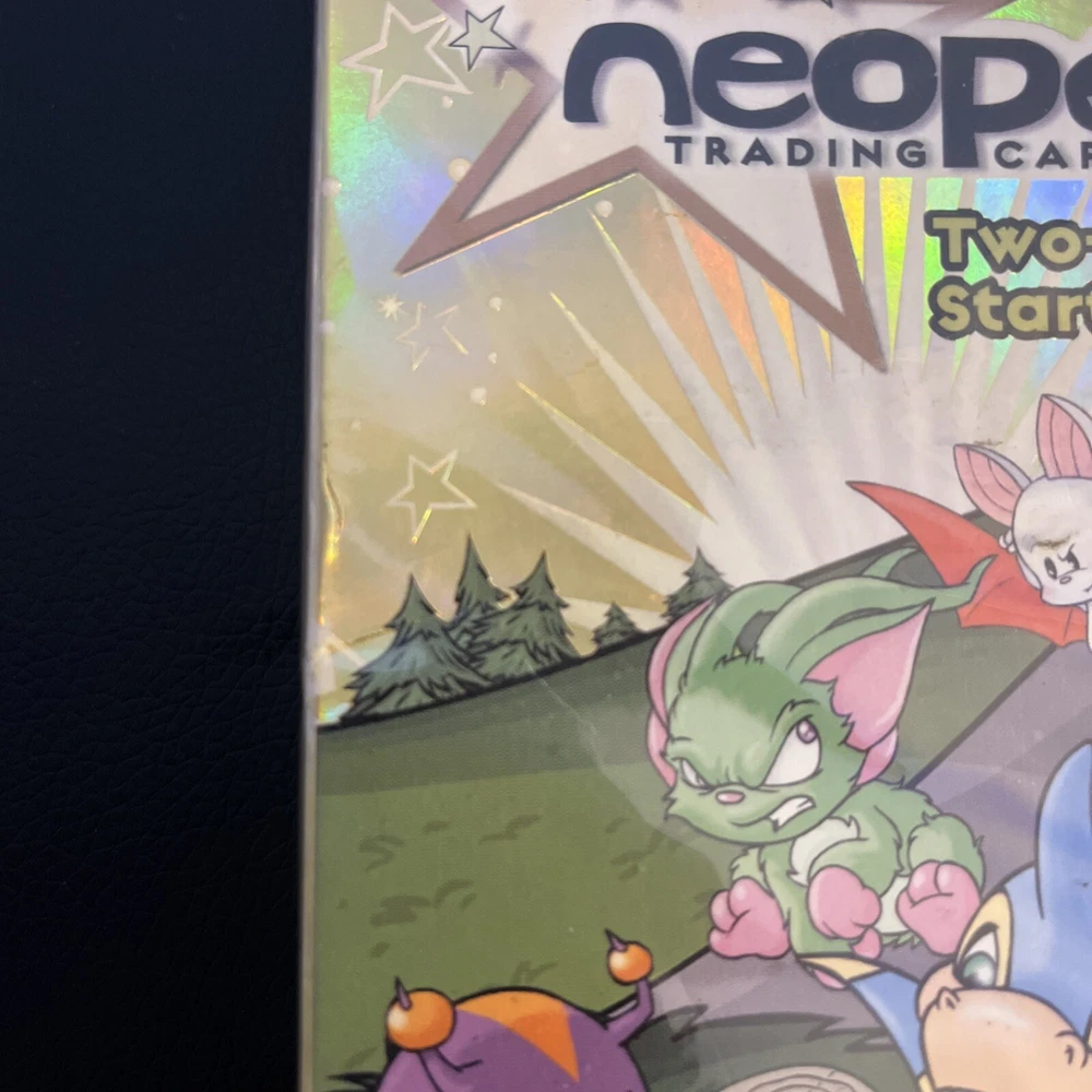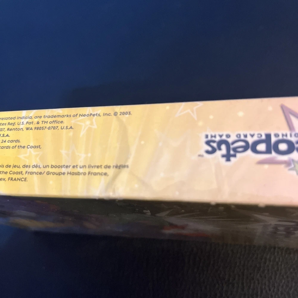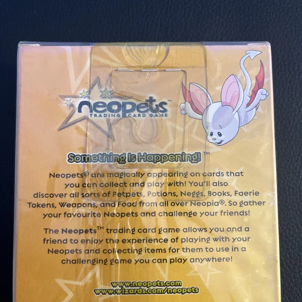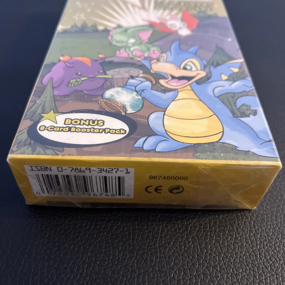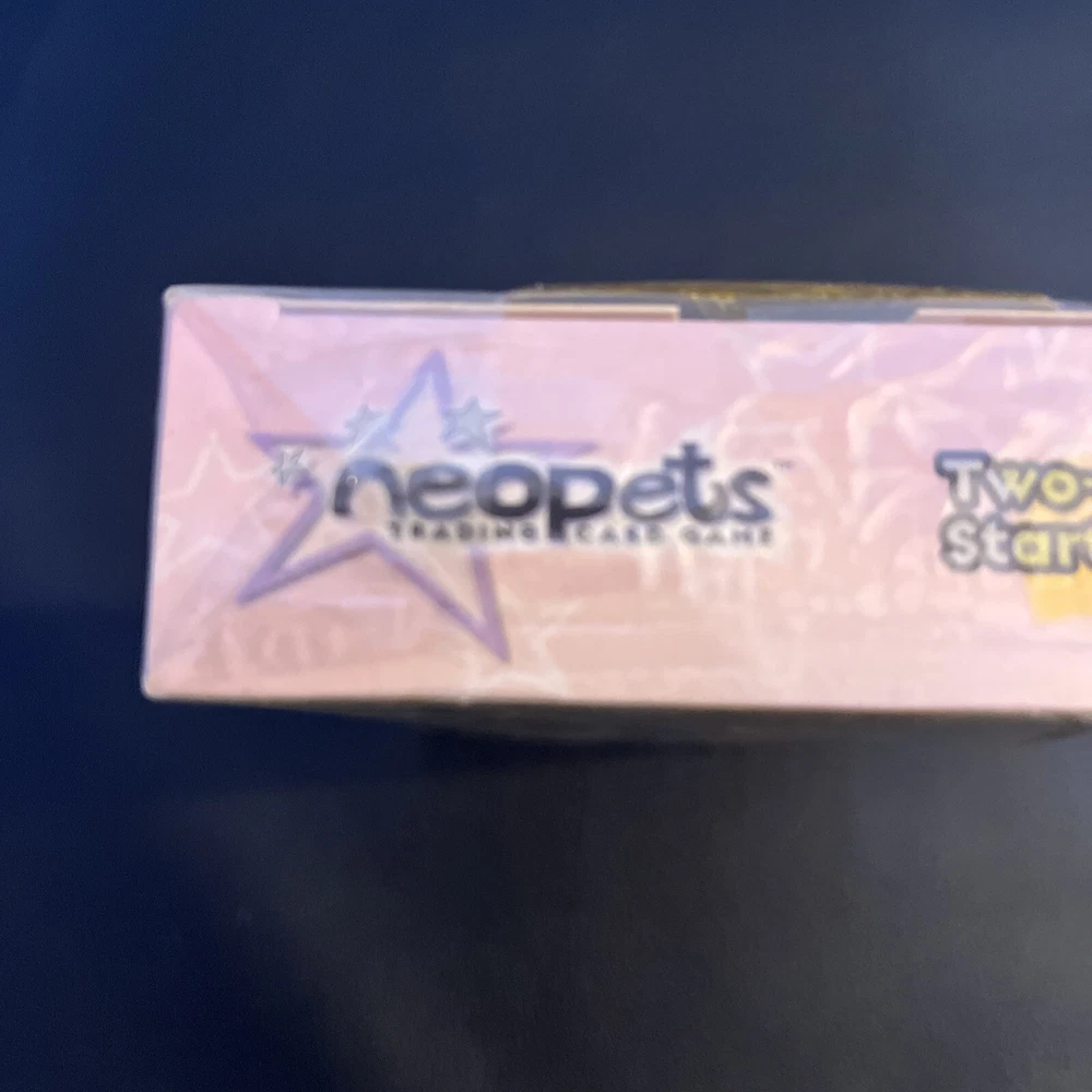 Neopets Trading Card Game Two-Player Starter Set. New box sealed. Includes a bonus 8-card booster pack. Let us know if you have any questions! Please see the pictures for additional details. Note: There is a plastic hanger on the back of the box as the pictures show. Please see the pictures for exactly what you will receive. There are some dents, marks, and other imperfections on the box and outer plastic seal including discoloration . This is unopened and sealed.