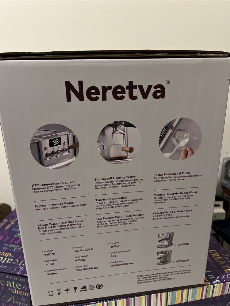 Neretva Espresso Machine with Milk Frother, Medium, Stainless-CP6100U/GR (New). Condition is New. Shipped with USPS Ground Advantage.