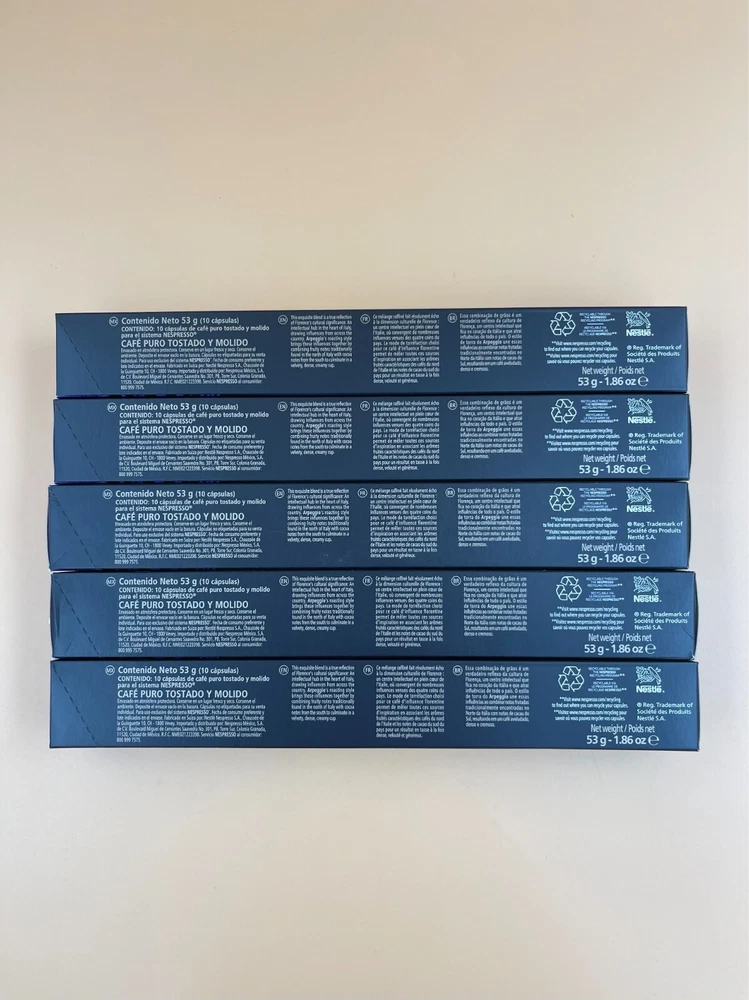COFFEE BLEND:;Arpeggio is a;long roasted Central and South American Arabica;;dense and creamy with bold roasty and cocoa notes. The crema gives it a creamy, velvety texture that is irresistible.;Long roasted – Nespresso Intensity 9.; DARK ROAST: An intense roast of the coffee beans develops the distinct characteristics of each of Arpeggio’s coffees. It may be a blend, but it seeks to let each coffee shine.; SAVOR WITH MILK:;Arpeggio’s potent character can push through milk. It’s an intense coffee, but the sweet notes of Arabica mix well with milk froth to make this homage to Florence a characterful Latte Macchiato.; CONTENTS: 50 capsules – 10 capsules per box. Each capsule brews Ristretto 0.845 OZ and Espresso 1.35 OZ SUSTAINABILITY FIRST:;As a certified B Corporation,;Nespresso;meets the highest standards of verified social and environmental performance, joining a global movement using business as a force for good.;;Nespresso aluminum capsules are fully recyclable and guarantee coffee freshness - we provide different options for recycling your used aluminum coffee pods to fulfill our collective commitment to protecting the environment. Expires: 12/31/2024