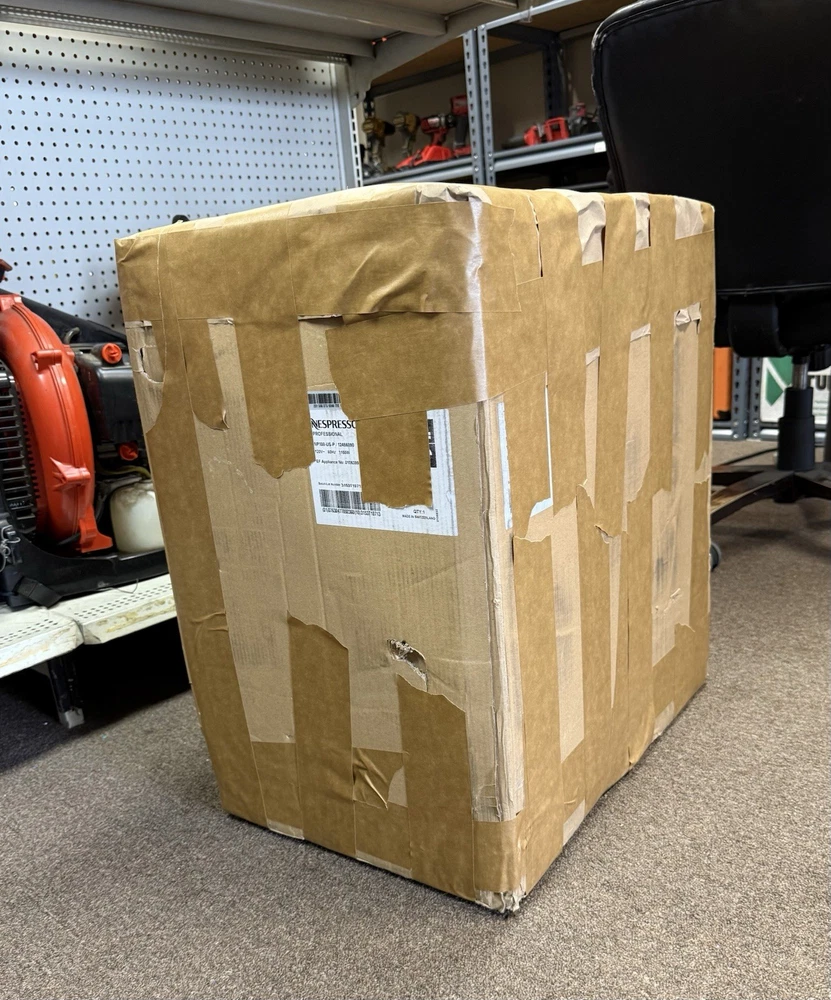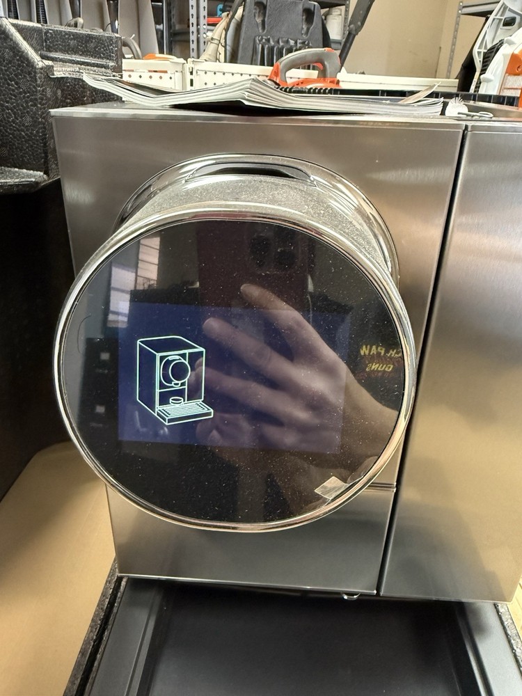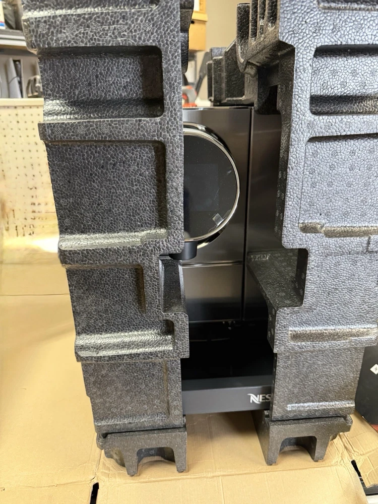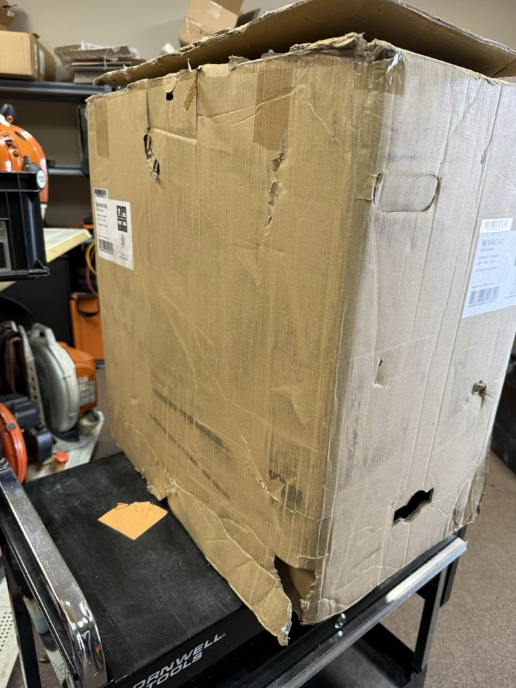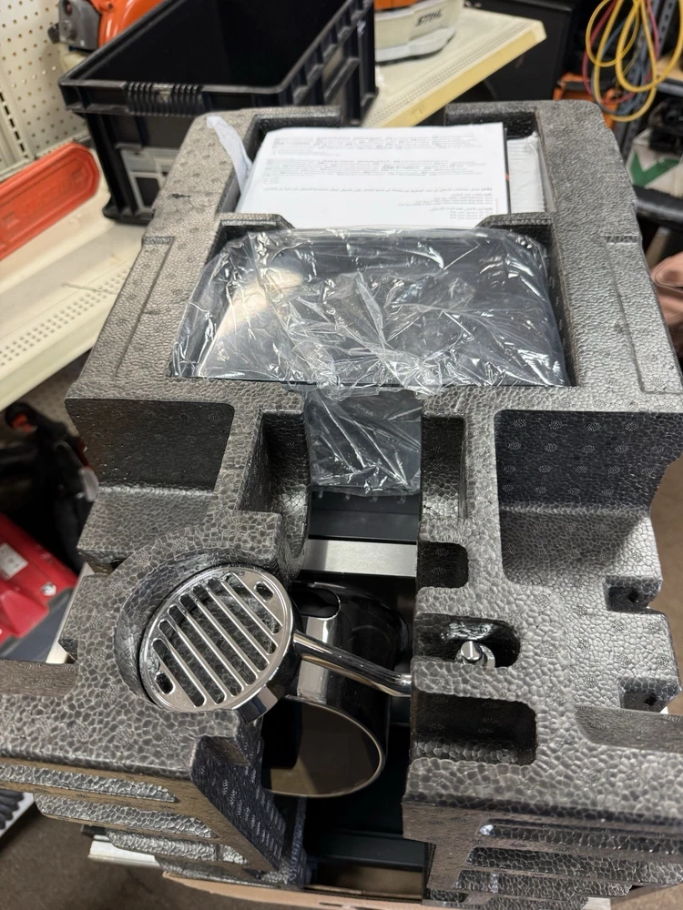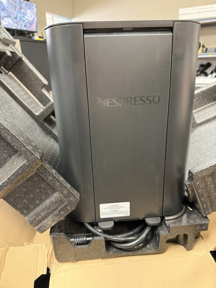 Excellent unused condition, open box. Only opened for photos and testing. Powers on. Includes drip tray, water tank, capsule storage drawer, cup support, top cup heater, water tank keys, and instructions. Does not include a water filter. Original box is torn, but item is undamaged.