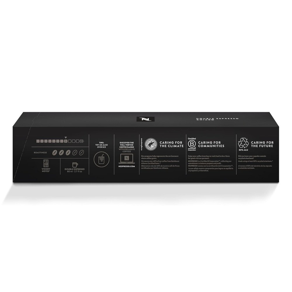 Nespresso Capsules Vertuo, Double Espresso Chiaro, Medium Roast Espresso Coffee About this item INTENSE ; WOODY:;Double Espresso Chiaro is intense, but those woody, earthy notes give this double shot coffee such balance that it remains approachable. DARK ROAST: We split roast the coffees in this espresso lungo. Double Espresso Chiaro’s washed Arabicas are roasted separately from the dry processed Arabica coffee beans - even though both get an intense and short roast. The two processes give the coffee’s distinct aromatic profiles - split roasting allows us to bring out the best of each coffee in this double espresso coffee.; Intensity 8. DOUBLE ESPRESSO CHIARO ESPRESSO BREWS 2.7 FL. OZ.: These Nespresso Vertuo pods are part of the Double Espresso range that will provide you with a 2.7 fl. oz. serving of espresso which will help you double up on your single espresso coffee SAVOR WITH MILK: This coffee with milk alone, surprisingly prominent notes of caramel jump to the fore and a thick, creamy texture develops. SUSTAINABILITY FIRST:;As a certified B Corporation,;Nespresso;meets the highest standards of verified social and environmental performance, joining a global movement using business as a force for good.;;espresso aluminum capsules are fully recyclable and guarantee coffee freshness - we provide different options for recycling your used aluminum coffee pods to fulfill our collective commitment to protecting the environment Ingredients Coffee Product Description Double Espresso Chiaro is made from South and Central American Arabicas, the balanced intensity best reveals a range of woody and earth notes. Very indulgent as a latte, this espresso unveils notes of blond caramel combined to a nice creamy texture.