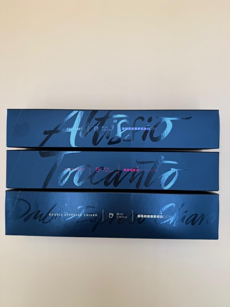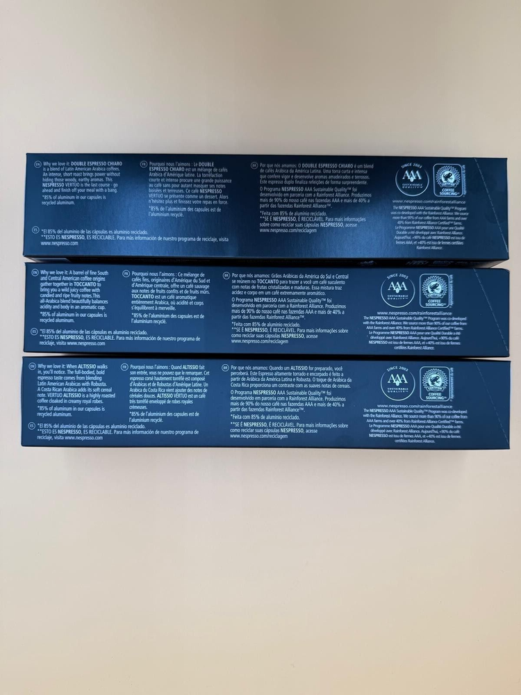 Savor the rich and aromatic flavors of Nespresso Vertuo, Altisso, and Toccanto, all in one convenient variety pack. This collection features 30 capsules (10 pods per flavor), meticulously crafted for Nespresso systems. Each selection promises a distinct taste, with Vertuo's bright and Tequila-like notes, Altissio's creamy and chocolatey profile, and Toccanto's balanced and caramel sweetness. Ideal for coffee enthusiasts and Nespresso lovers alike, this pack is a must-have for those who appreciate the finer nuances of a perfectly brewed espresso. Enjoy the ease of pod-and-capsule compatibility and the assurance of Nespresso's renowned quality in every cup. Expiration Dates: Altissio 3-31-25, Toccanto 4-30-25, Double Espresso Chiaro 3-31-25.