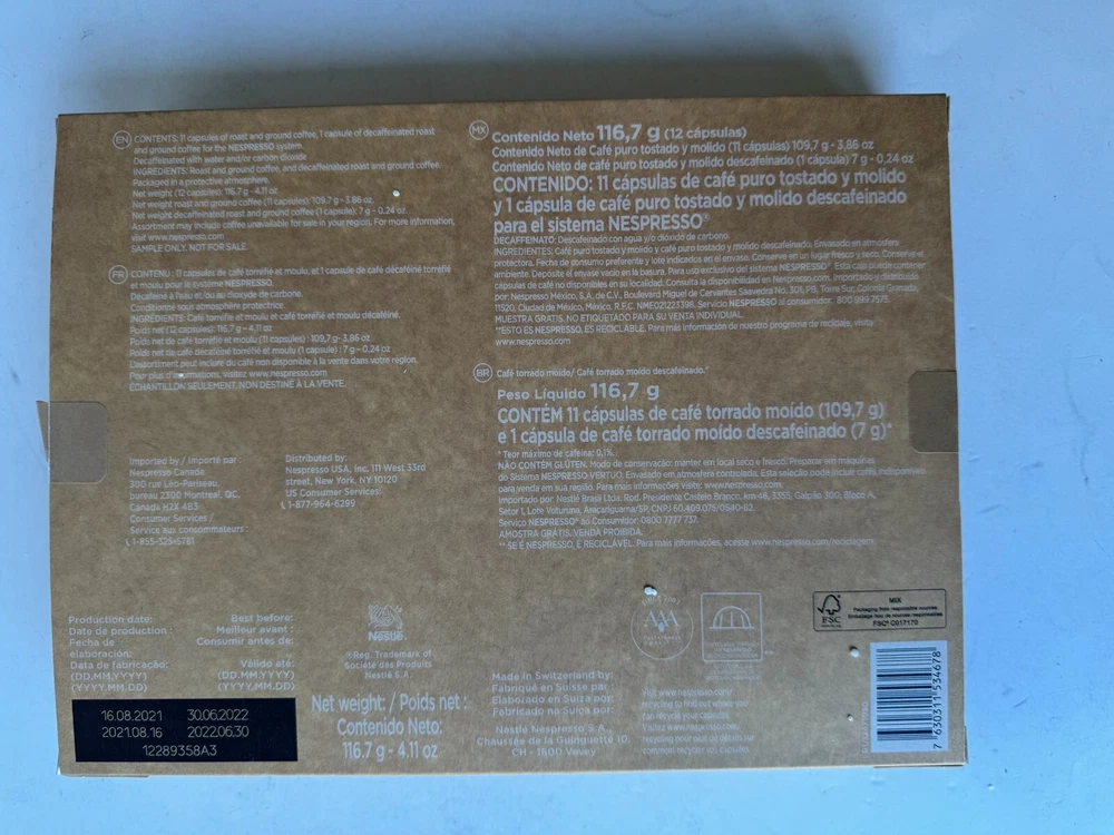 Product: Coffee Pod & Capsule Serving Size: 1 Cup Flavor: Almond, Caramel, Dark Roast Food Aisle: Pantry Food Specifications: Dairy Free, Gluten Free, Kosher Allergens: Celery, Milk UPC: 7630311534678 Type: Coffee Pod and Capsule Country/Region of Manufacture: Switzerland gtin13: 7630311534678 MPN: Does Not Apply Compatibility: Nespresso, Originalline Roast: Medium Brand: Nespresso