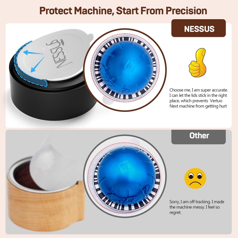 Nessus Reusable Vertuo Capsule Kit, [ALSeal EZ FIT] for Reusable Nespresso Pods with 100 Pcs Aluminum Foil Seal Lids, Holder, Brush, for Refilling Nespresso Vertuo Pods Reusable Vertuoline Pod Complete Kit: The Nessus reusable vertuo capsule kit includes a holder, 100 PCS food-grade aluminum Nespresso foil seals, and a cleaning brush.(Empty pod not included) With this kit, you can easily refill and reuse your vertuo pods, saving money and reducing waste. Perfect Size & Adhesion: Say goodbye to foil waste, weak coffee, and machine damage caused by ill-fitting seals. Our larger foil lids easily position reusable vertuo pods without covering the barcode. Plus, they feature food-grade adhesion that keeps your pods airtight and well-sealed, so you can pre-fill them and enjoy fresh coffee anytime. Sturdy & Clean: Don't settle for flimsy foil seals that tear and leave a mess. Our premium aluminum foil lids for Nespresso pods are extra thick, sturdy, and made with a unique process on the surface to prevent tearing. It allows you to create capsules without touching the adhesive areas, keeping your hands clean throughout the process. Easy to Refill: Refilling your vertuo reusable pods with the NESSUS refillable pods kit is simple and hassle-free. Just put the empty capsule into the holder, add your favorite coffee powder, and use the NESSUS foils to align on the edge of the capsule. Then, press the top cover of the holder to get a new capsule. Effective Solution: Our solution is tailored to extend the life of your Nespresso Vertuoline pods while reducing your environmental footprint. By reusing your Vertuoline pods instead of discarding them after one use, you can enjoy your favorite coffee blend and help protect our planet. Shipping We offer FREE shipping on all orders! We ship within Three business days of payment, usually sooner. We use a selection of shipping services such as UPS, FedEx, USPS etc. We only ship to the lower 48 states, no APO/FPO addresses or PO Boxes allowed. Local pickups and combined shipping options are not provided at this time. Return You can return a product for up to 30 days from the date you purchased it ONLY if it's in the original condition. The product cannot be used or open. Any product you return must be in the exact same condition you received it and in the original packaging. Please keep the receipt. Feedback Customer satisfaction is very important to us. If you have any problem with your order, please contact us and we will do our best to make you satisfied. Contact Us If you have any queries, please contact us via ebay. We usually respond within 24 hours on weekdays. Please visit our eBay store to check out other items for sale! Thank you for shopping at our store.