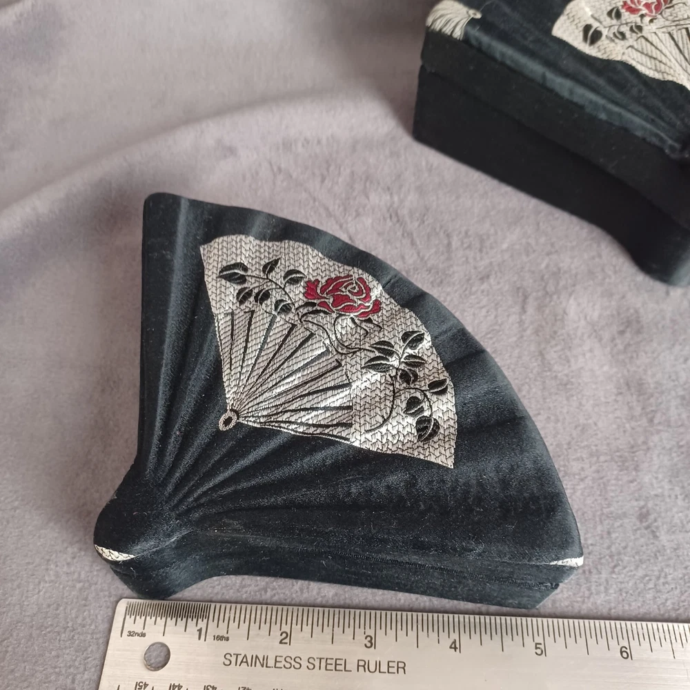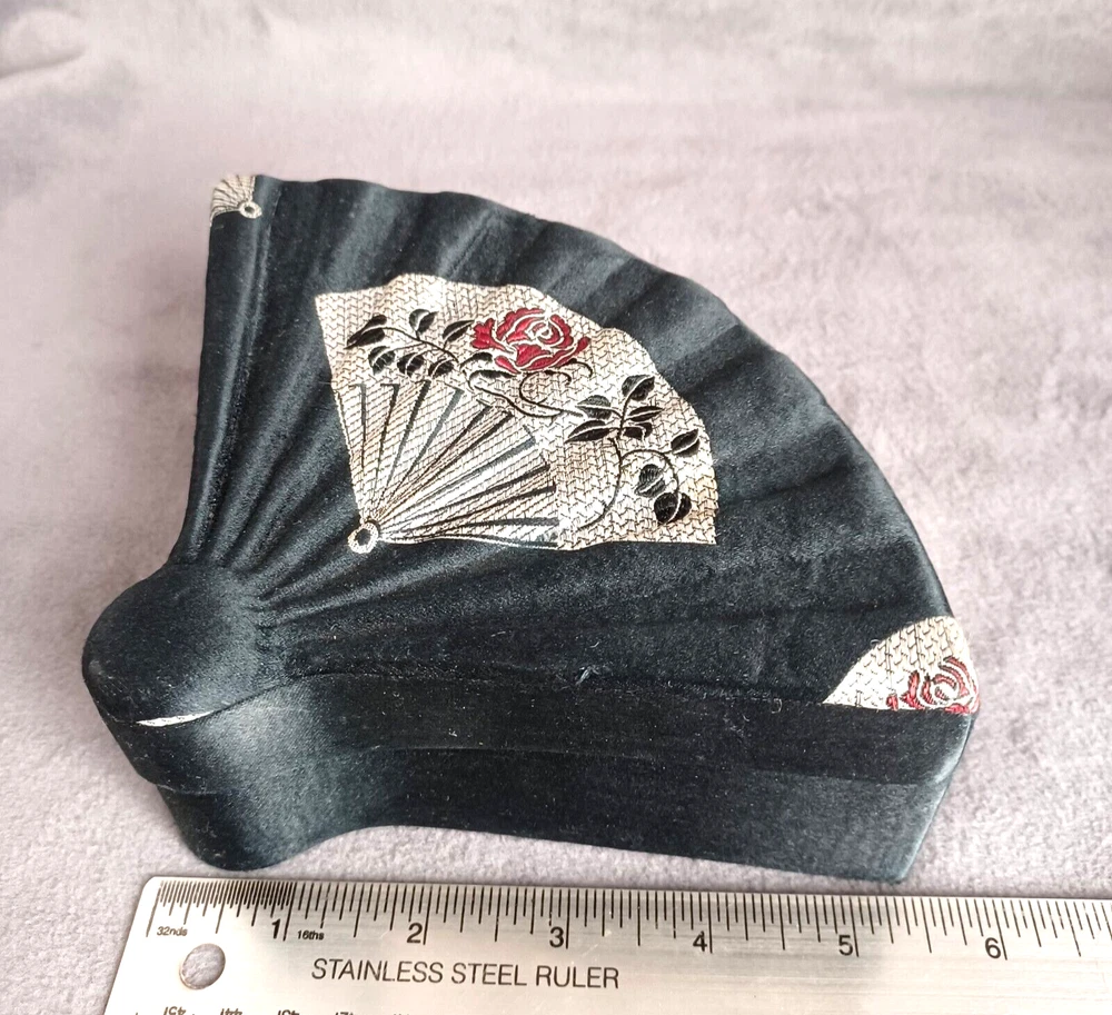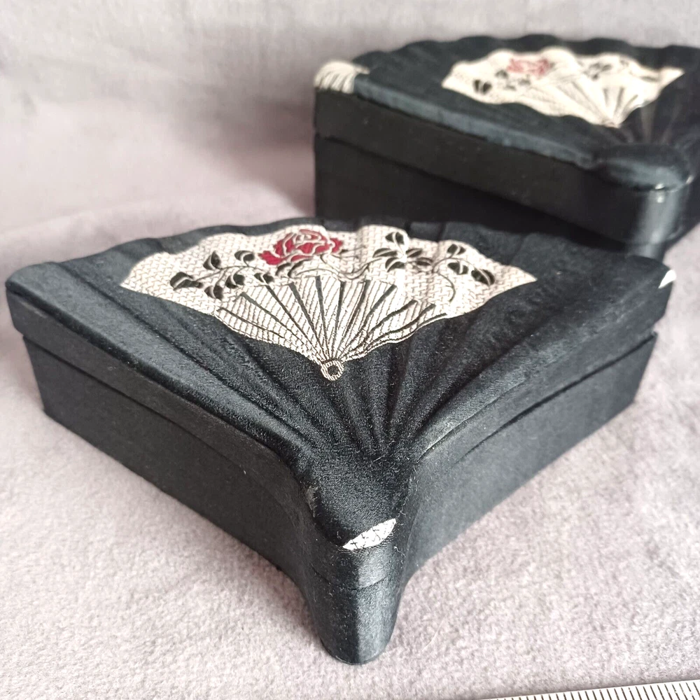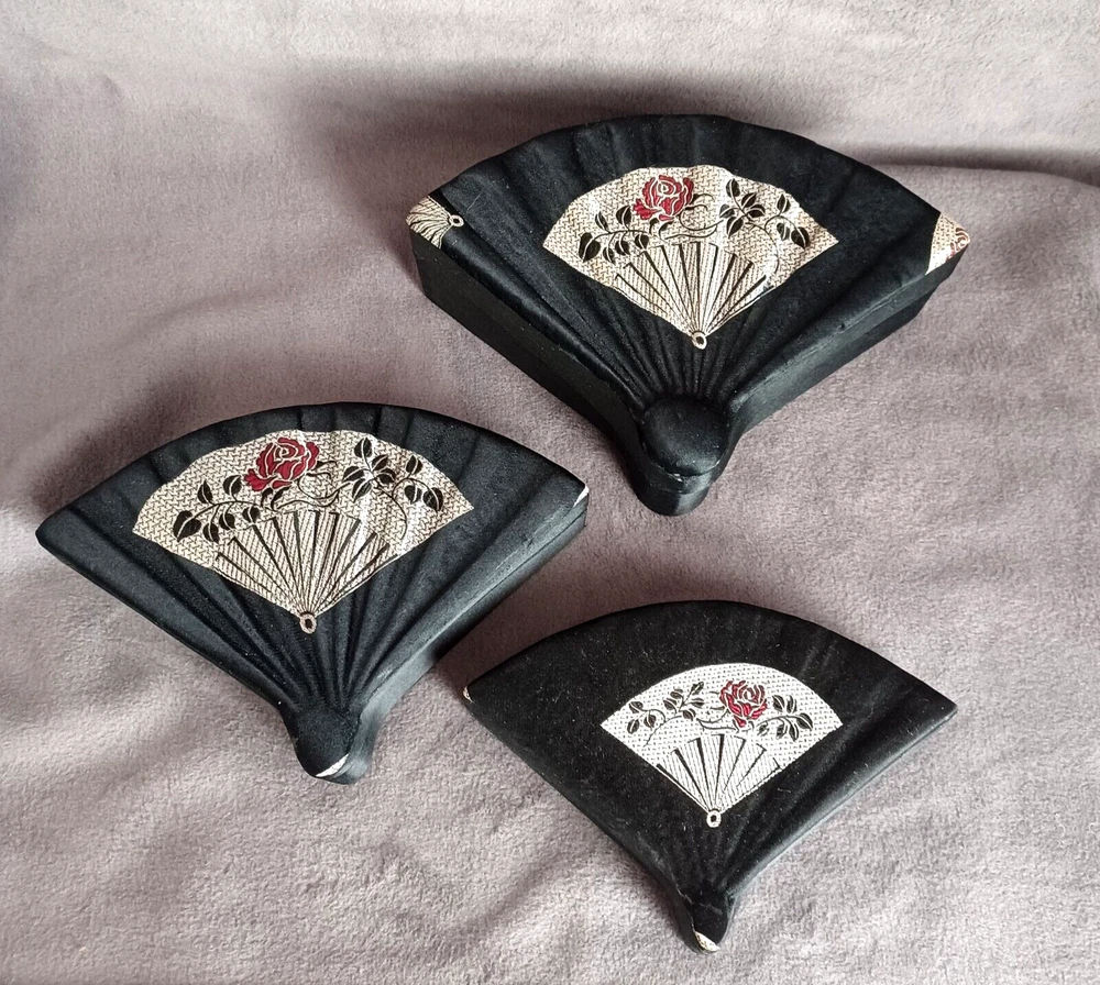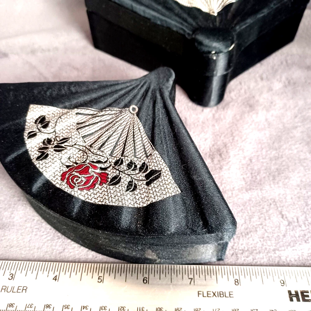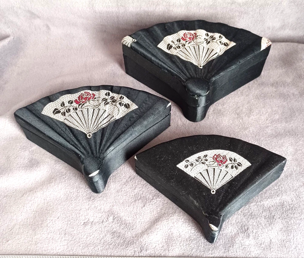 This beautiful set of 3 trinket boxes is a must-have for any collector of vintage and unique items. The intricate brocade design of a fan with a red rose adds a touch of elegance and sophistication to any room. The fan-shaped design is perfect for storing small items, such as jewelry or trinkets. Vintage Hand Made in China Signed. Rare Set. Small 6.5" Medium 7.5" Large 8.5" Height Nested 2.5"