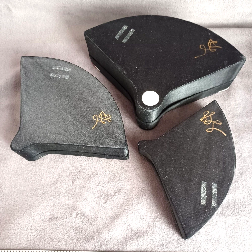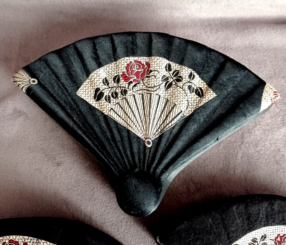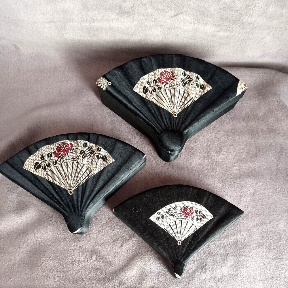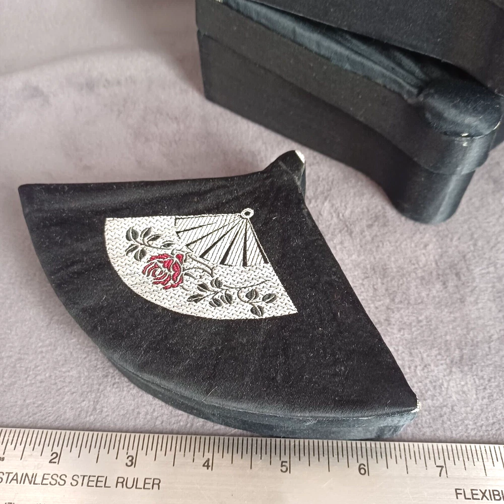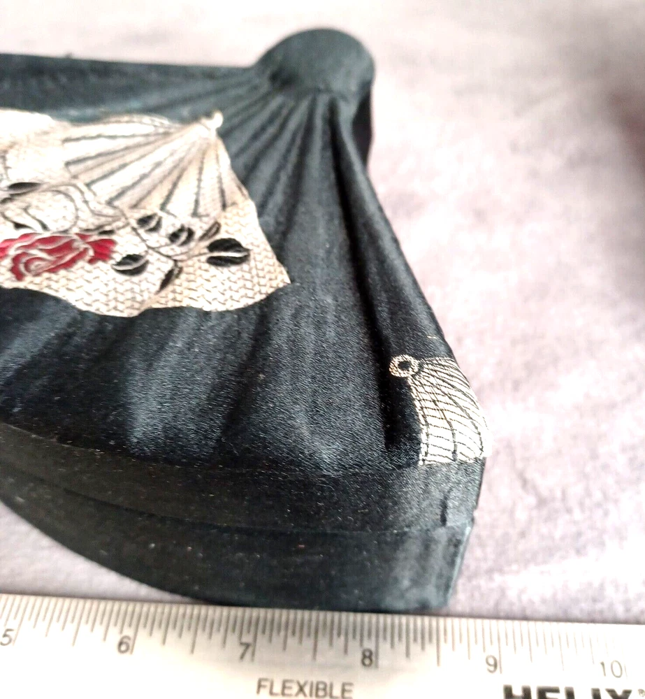 This beautiful set of 3 trinket boxes is a must-have for any collector of vintage and unique items. The intricate brocade design of a fan with a red rose adds a touch of elegance and sophistication to any room. The fan-shaped design is perfect for storing small items, such as jewelry or trinkets. Vintage Hand Made in China Signed. Rare Set. Small 6.5" Medium 7.5" Large 8.5" Height Nested 2.5"
