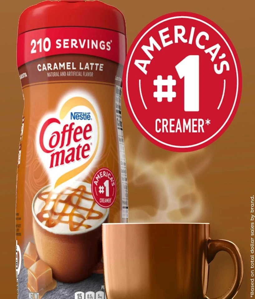 Product details Nestle Coffee mate Caramel Latte Coffee Creamer, 15 oz About this item Nestle Coffee mate Caramel Latte Powder Coffee Creamer is an ideal way to create a delicious cup of coffee perfection. Smooth and indulgent, this flavored caramel latte creamer creates a rich, velvety flavor. This Coffee mate creamer is a lactose free, gluten free and non dairy creamer. This affordable powdered creamer for coffee makes it easy to add the right amount of flavor every time, letting you easily transform your coffee into warm deliciousness. Whether it's your morning cup or afternoon pick-me-up, this powdered Coffee mate coffee creamer wakes up your cup. This shelf stable flavored coffee creamer makes it easy to enjoy caramel latte flavored Coffee mate anytime. One 15 oz canister of Nestle Coffee mate Caramel Latte Flavored Powder Coffee Creamer Flavored caramel latte non dairy creamer transforms every cup of coffee with its smooth, velvety flavor This gluten free creamer is also non dairy and lactose free This caramel latte flavored coffee creamer powder wakes up your cup Store flavored creamer in a cool, dry place Coffee mate powdered creamer makes it easy to pour, stir and enjoy; ready in an instant SNAP and EBT item in eligible states Specifications Food Condition Shelf-Stable Food Form Powders Container Type Bottle Container Material Canister Nutrient Content Claims Lactose-Free, Gluten-Free, Kosher, Cholesterol-Free Food Allergen Statements Contains: a milk derivative. Assembled Product Weight 1.08 lbs Brand Coffeemate