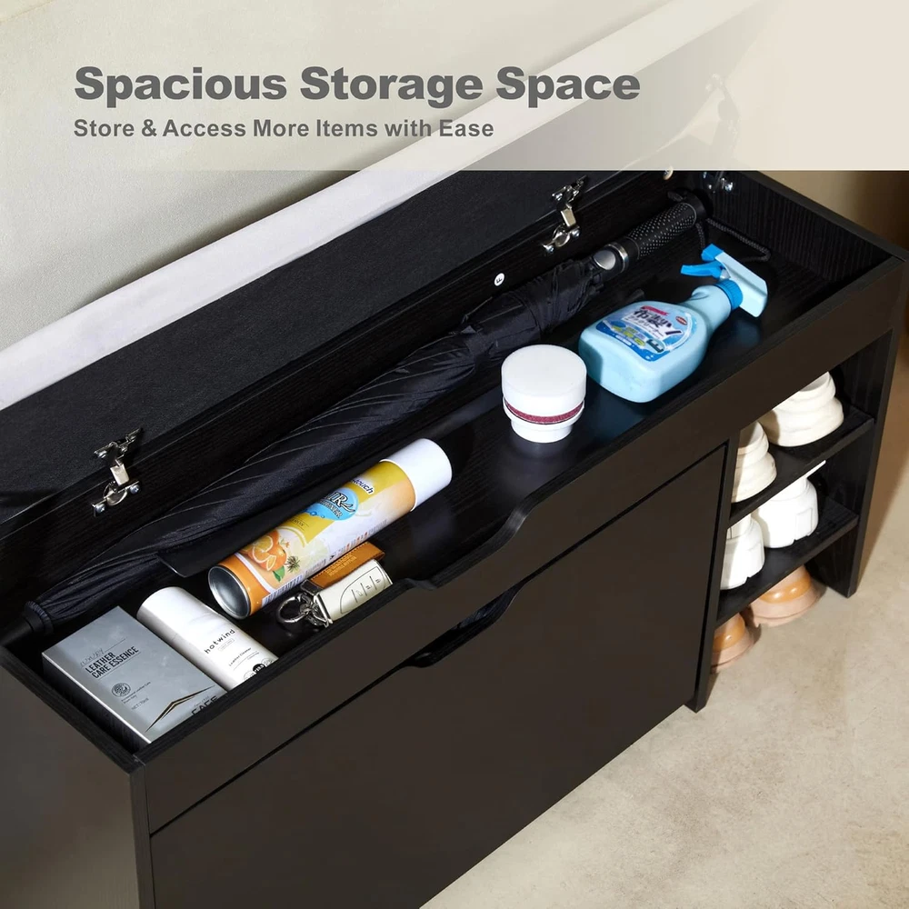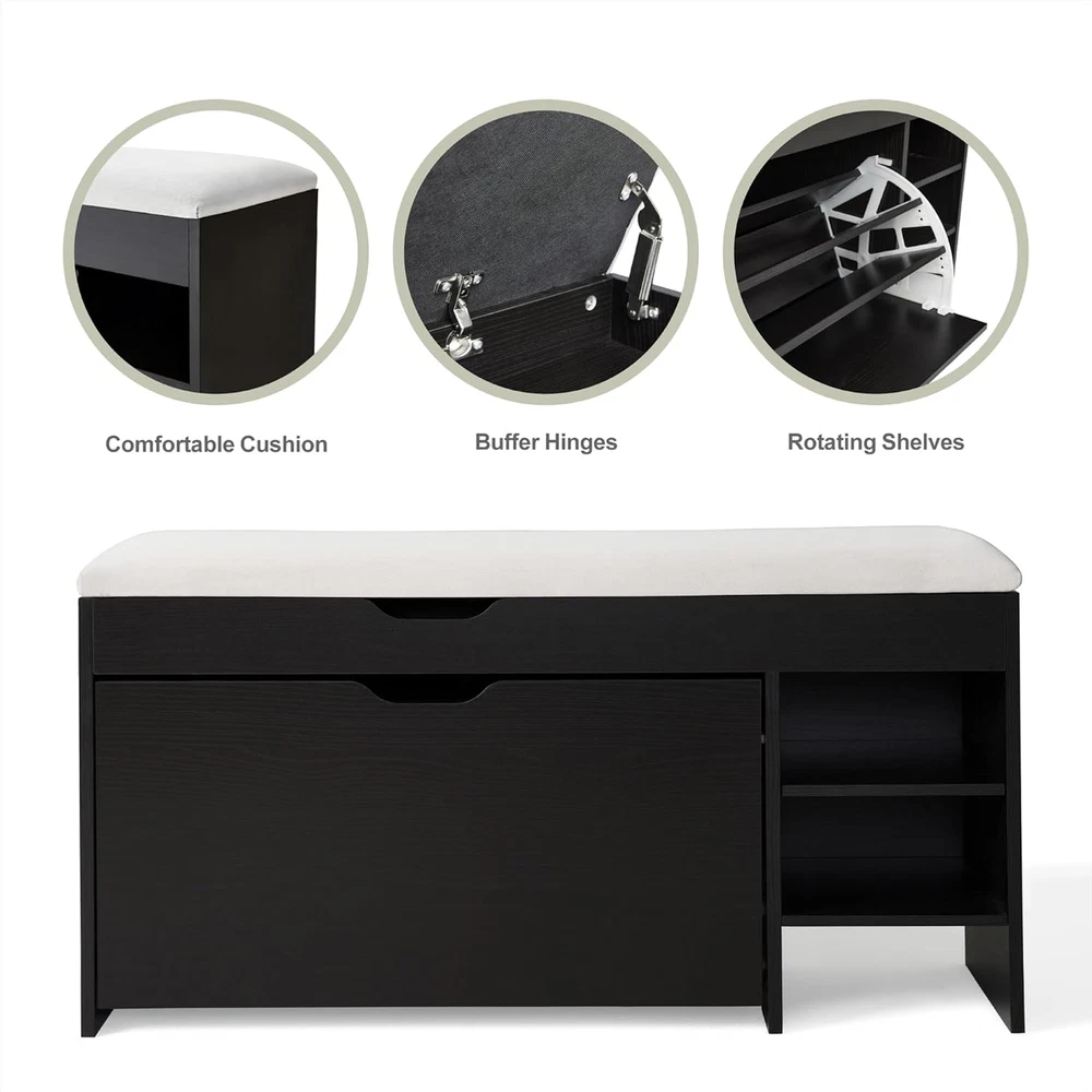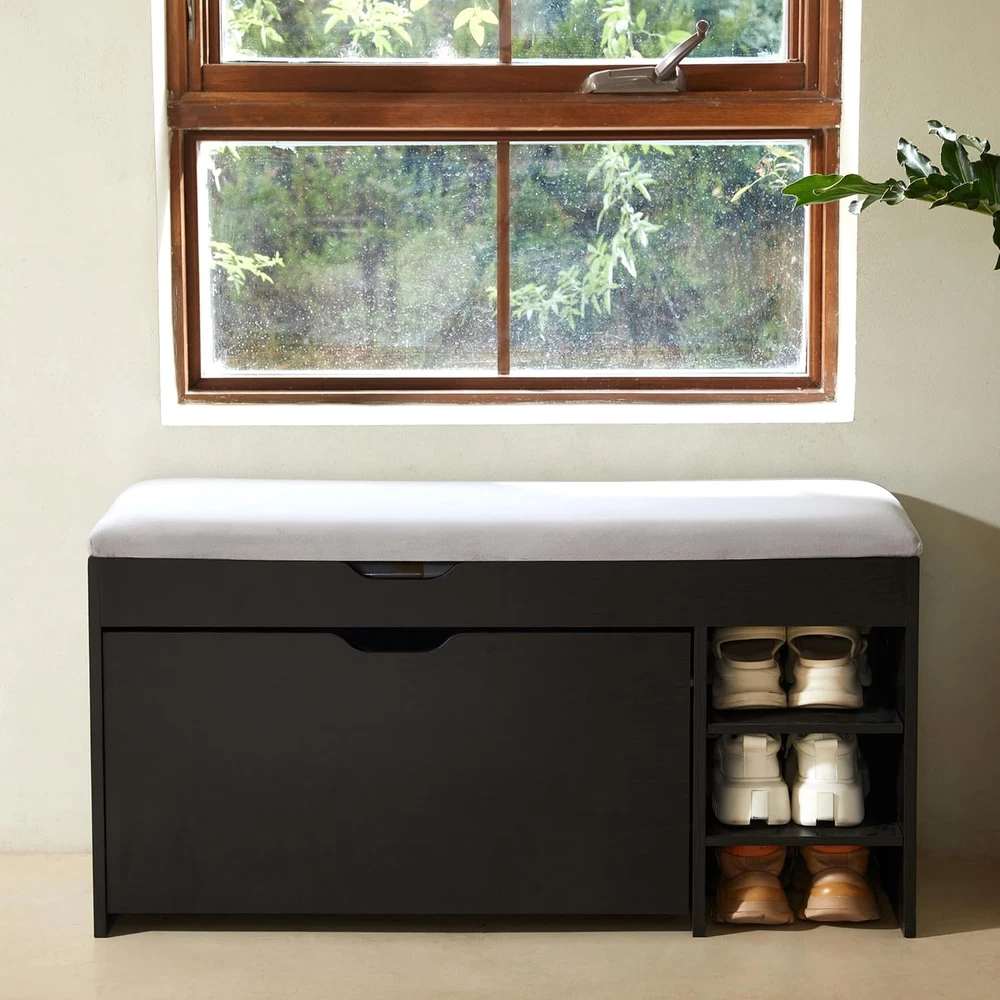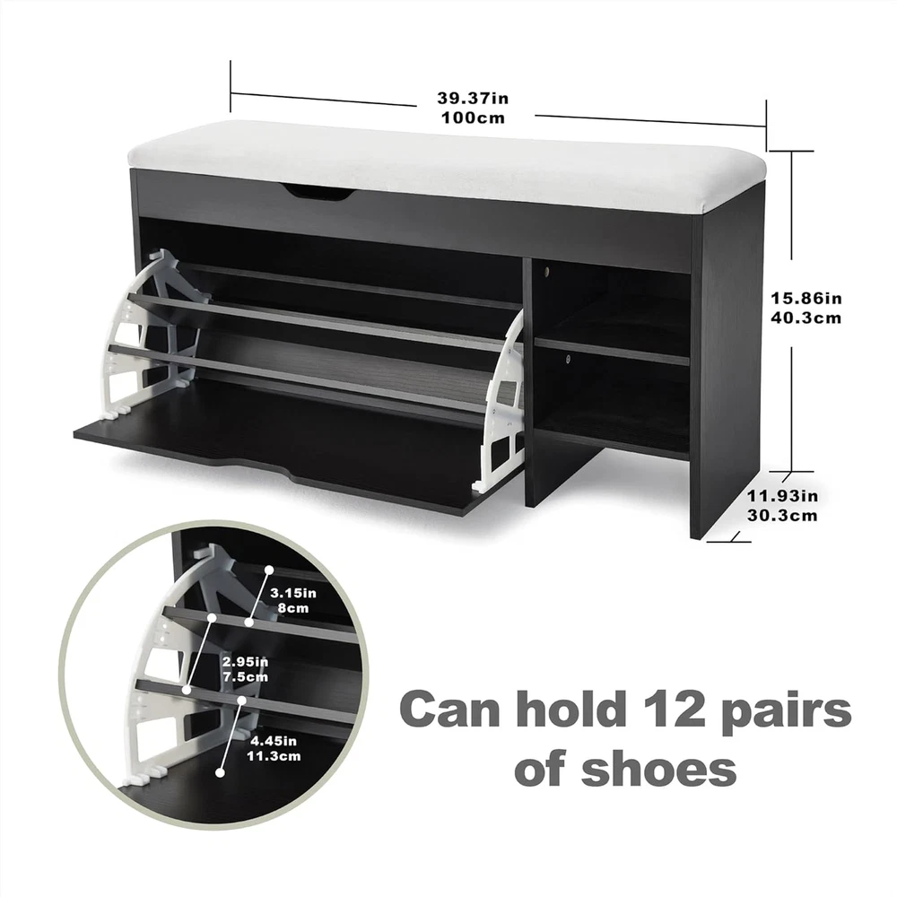 Store New Arrivals Add to Favorite View Feedback Contact Netstar 3-Tier Shoe Entryway Bench with Cushion, Shoe Rack Bench with Flip Drawer, Shoe Storage Bench with Lift Top Storage Box, Shoe Storage Organizer for Entryway, Hallway, Living Room, Black Description Style Traditional Color Black Furniture Finish Wood Country of Origin China Item Weight 39.2 pounds Material Wood Frame Material Wood Product Dimensions 39"D x 11"W x 20"H Note: If you find that the shoes cannot be placed completely inside the shelf during use, please adjust the arrangement of the shoes: place women's shoes on the first layer, men's shoes on the third layer, and the middle layer can hold slippers or children's shoes. If it still cannot be used, please remove the middle shelf and use it as a two-layer shoe stool. Smart Space-Saving Wonder: This modern freestanding shoe entryway bench boasts a clever flip-up design that's a breeze to open and close. Unlike regular shoe racks, this narrow gem can fit snugly into tight spaces, keeping your shoes dust-free and safe from pets and pesky bugs. Massive Capacity Shoe Storage: Our drawer shoe storage bench can hold up to 12 pairs of shoes. The drawers offer three levels of storage. The panels can be adjusted or removed with two notches, making it a breeze to accommodate flats, mid-boots, or heels of various heights and sizes. Luxurious Velvet Cushion: The shoe bench features a premium silky velvet cushion surface that has undergone rigorous testing, including a 4,000-time abrasion test. It resists peeling and color fading. The 3cm thick foam cushion is super resilient and supportive, and won't easily deform, giving you a lavish and comfy sitting experience when changing shoes. Entryway Bench with Lift-Top Storage: Lift the top of this shor rack bench, and you'll find a spacious storage cabinet perfect for stashing umbrellas, fedoras, small duffel bags, wallets, keys, and other odds and ends. The hinges on the locker are slow-drop hinges to prevent your hands from getting caught when closing the door. This bench with storage is an ideal addition to your entryway. All About the Large Capacity Shoe Bench: Dimensions: 39.37''W × 11.93''D × 15.86''H. Load Capacity: 300 lbs. This modern design shoe storage bench comes with an installation manual. All the boards and parts are clearly labeled. Simple construction means it's ready to use without the hassle of complex assembly. Use it in the entryway, front door, hallway, foyer, closet, patio, mudroom, living room, or bedroom. Its versatile design makes it a great fit for any space in your home. Product Description Safe and Secure Two safety hinges on the lid of this shoe storage bench make it safer to organize your items—no fingers get smashed or pinched anymore! Comfy Cushion The 3 cm / 1.18 inch high-density sponge pad features high elasticity, softness, breathability, and resistance to deformation, providing exceptional comfort when you sit on it. White Flip Stand Make the overall style no longer dull and add just the right modern flavor. ABOUT US We offer the best prices around on high quality products. Our E-store includes media such as books, movies, music and games while offering electronics, toys, sporting apparel, clothing, tools, general home, garden items and more. SHIPPING We are always working hard to ensure your package arrives as soon as possible. Please understand that some factors like weather, high postal traffic, and the performance of shipping companies are outside of our control. We offer free shipping to the lower 48 states and ship within 2 business days of payment, usually sooner. We do not accept P.O. Boxes. Please provide a physical address. For shipping outside of the continental USA, we only use eBay's Global Shipping Program.The item is shipped to KY and then sent to the rest of the world. International customers are responsible for all duties and taxes. Continue to check out in order to calculate costs for shipping the item to your country. Messages regarding eBay's Global Shipping Program MUST be directed at eBay EXCLUSIVELY. RETURNS We offer a 30-Day Return Policy on items which you are not completely satisfied with. You have the option for a full-refund or an exchange of the item. No returns are available on items shipped outside of the USA. PAYMENT We accept PayPal. CONTACT US This page content is yet to come Please ad us to your favorite seller and visit again later Thank You CUSTOMER SATISFACTION We try our very best to make sure every customer is completely satisfied. If there's a problem, message us! We're happy to help. WE ACCEPT Copyright © 2021 AutoDS. | All Rights Reserved