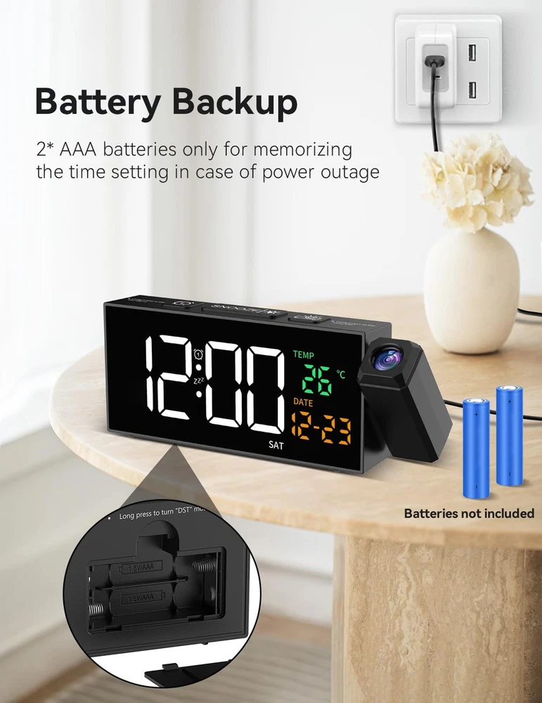 Netzu Projection Clock for Bedroom Ceiling, Alarm Clocks with 180° Black Product Details Brand: Netzu Color: Black Display Type: Digital Style: Modern Special Feature: Loud Alarm, Adjustable Brightness, Temperature Display, Projection Clock, Adjustable Volume Product Dimensions: 8.07"W x 3.07"H Power Source: Corded Electric Age Range (Description): Teenager Senior Room Type: Bedroom Shape: Rectangular Indoor/Outdoor Usage: Indoor Material: Plastic Frame Material: Plastic Are Batteries Included: No Mounting Type: Tabletop Alarm Clock: Yes Watch Movement: Quartz Number of Items: 1 Operation Mode: Electrical Dial Color: [PO] Possible Black Manufacturer: Netzu Item Weight: 10.9 ounces Item model number: 6210P Projection Alarm Clock - Project the time onto your wall or ceiling, ensuring you can easily check the time at any moment in your bedroom. With a clear projection distance of 1.6-11.4 feet and a 350° rotating arm for optimal positioning, you'll always have the time in sight.The projected image provides 4 brightness levels and can be flipped 180 ° to accommodate different sleep directions. Adjustable Volume and Sound Choices - This alarm clock features 10 delightful alarm tones to choose from, providing a pleasant start to your day. Additionally, it offers four adjustable volume levels, allowing you to set the perfect intensity for a gentle or more robust wake-up call. Manual DST Adjustment Feature - Simply hold down the DST button to move the alarm time forward by an hour when Daylight Saving Time starts, and backward by an hour when it ends. This convenient feature keeps your clock in sync with the changing seasons effortlessly. 5 Brightness Levels - This plug-in alarm clock offers 5 levels of brightness adjustment, allowing you to customize the display to suit any lighting condition. Whether you need a bright display during the day or a dim light at night, this clock provides the perfect level of illumination for your comfort.