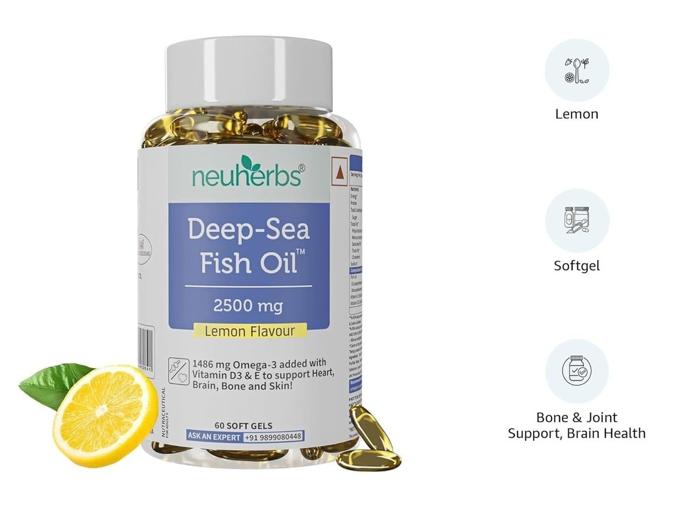 High strength formula: delivers 1486 mg omega-3 with 892 mg epa and 594 mg dha per serving Country of Origin: India Pure & safe: tested for heavy metals, free from cholesterol, preservatives, sugar, sodium, & gluten. Maximum Shelf Life 24 Months Vitamins: provides 10 mg of vit-e (100% rda) & vit-d3 200 iu (50% rda) for better skin & bone health Why go for Omega -3 Supplements : The body needs to get its Omega -3 from the food we eat, but as our diet lacks a good amount of fish, nuts and green leafy vegetables so it becomes important to improvise it with Omega-3 supplement We care: neuherbs provide you dedicated expert counseling & dietary guidance for better results No fishy burps: reflux- free formula with lemon flavor for better absorption of fatty acids. Item form: Soft gel. Material Features: Non Vegetarian