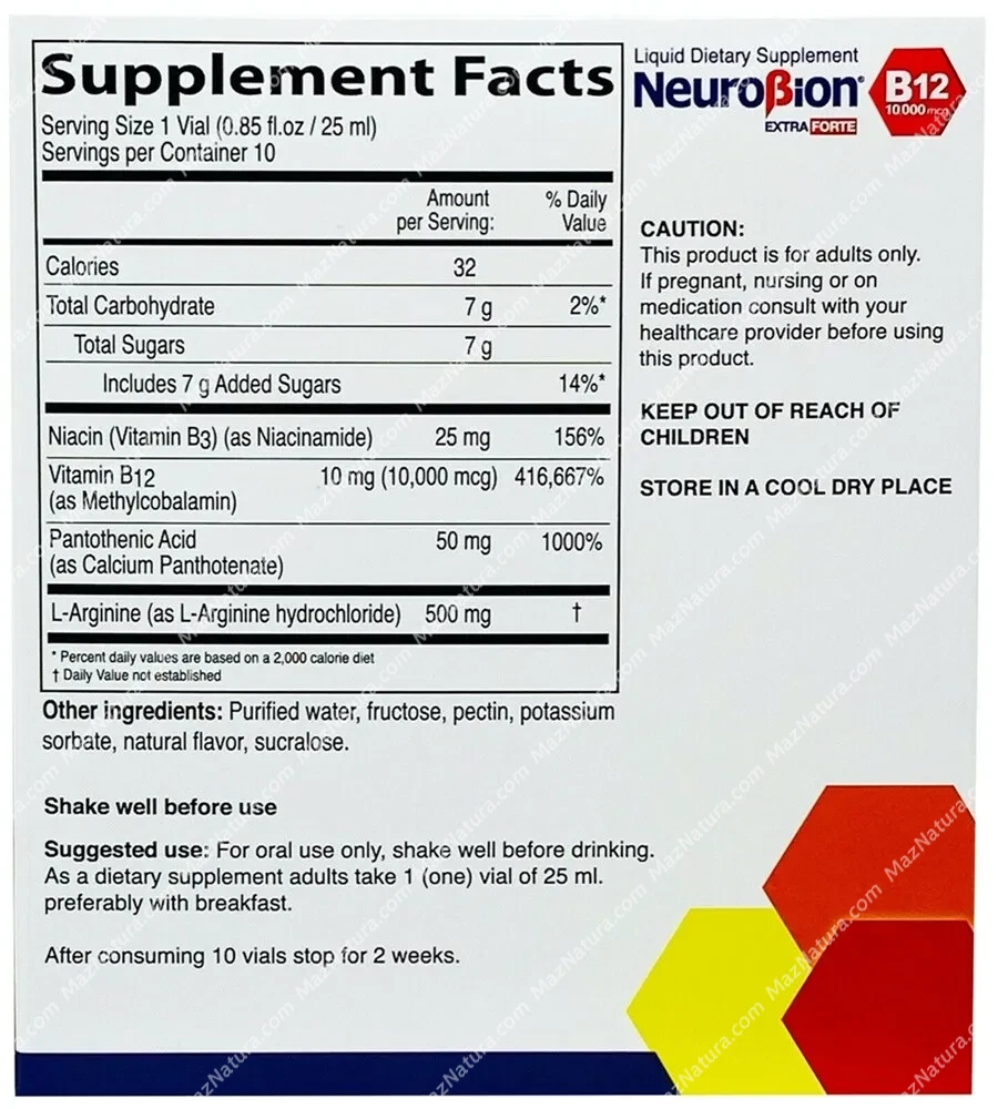 Neurobion B12 Extra Forte 10,000 Mcg Vitamin B12 Methylcobalamin Drinkable Vial ENHANCED ABSORPTION FOR MAXIMUM BENEFITS - FAST-ACTING RESULTS: With Neurobion Extra Forte B12's liquid formula, your body can absorb the powerful B vitamins faster and more effectively. Experience quick results as these supplements provide the energy your body needs to conquer the day. SUPPORTS YOUR ACTIVE LIFESTYLE - STAY AHEAD OF THE GAME: Whether you're an athlete, a working professional, or a multitasking supermom, Neurobion Extra Forte B12 have got your back! Boost your energy levels and keep your immune system strong, helping you perform at your best and stay on top of your game, no matter what challenges life throws your way. Made from carefully selected ingredients. NEUROBION EXTRA FORTE B12 ENERGY VIALS: Feel revitalized and energized throughout the day with Neurobion Extra Forte B12 Energy Vials! Packed with a potent 10,000 mcg of Vitamin B12, these liquid supplements provide a quick boost to your energy levels, making sluggish days a thing of the past. Say goodbye to fatigue and hello to newfound vitality! TRUSTED NEUROBION QUALITY - YOUR HEALTH IN RELIABLE HANDS: Choose Neurobion for the utmost assurance in quality and effectiveness. Our time-tested supplements are specially formulated to meet your health needs and address vitamin deficiencies. Feel confident knowing that you're taking supplements from a trusted brand that cares about your well-being. Are the perfect vitamin supplement for the development of body and mind. Invest in your health today!