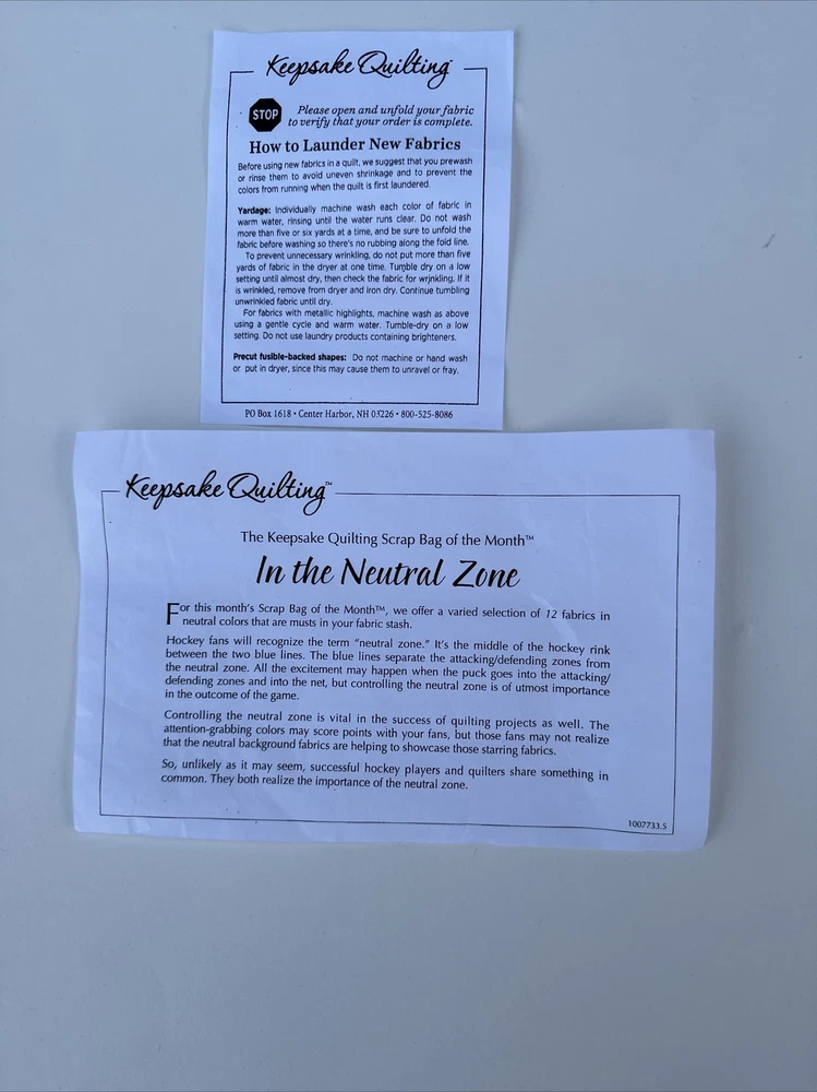 In the Neutral Zone Scrap Of The Month by Keepsake Quilting 3 yards (12) 9 1/4" x 44/45. NEW!!! Please see photos for condition and colors. I do have many block of the month packages all beautiful. I have to downsize my stash do to my health. I will be posting many many items I have quilted for over 45 years. I will combine shipping. TThank you for looking. T 121