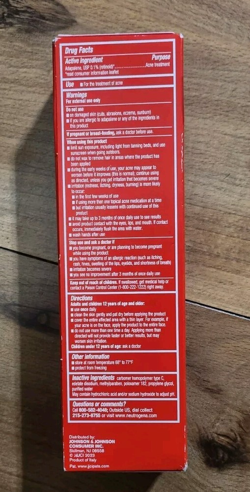 Main Purpose: Acne, Blackheads, Clogged Pores, Enlarged Pores, Excessive Oil Expiration Date: 06/2025 Body Area: Arm, Chest, Face, Head, Neck, Nose, Cheeks, Forehead Type: Gel Volume: 1.6 fl oz Brand: Neutrogena Department: Adult Product Line: Acne Treatment Size: Regular Features: Oil-Free, Paraben-Free, Perfume-Free, Phthalate-Free, Dermatologist Developed & Tested Skin Type: All Skin Types Ingredients: Adapalene Gel, Retinoid Formulation: Gel UPC: 0070501067659 Active Ingredients: Adapalene Gel gtin13: 0070501067659