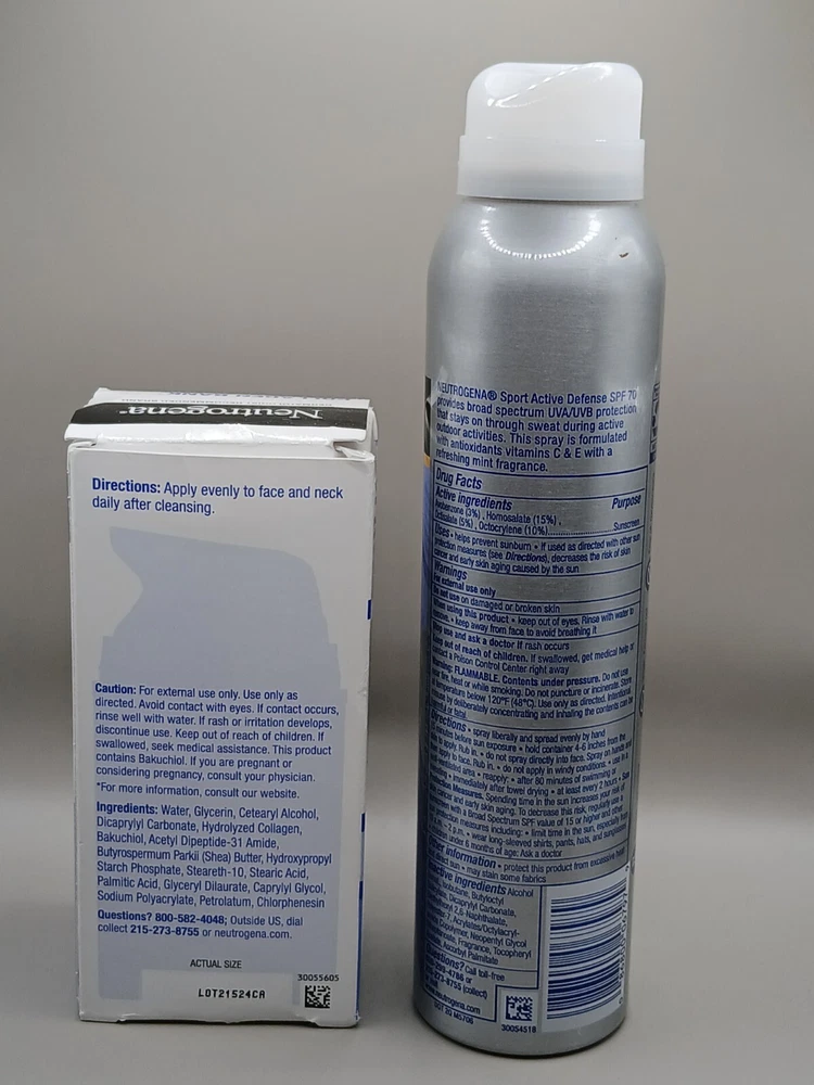 Holiday Bundle Offer with Great Price Product One Description :- Neutrogena Collagen Bank Moisturizer 2 fl. oz | Bakuchiol, Glow & Plump Skin (NEW) is a skincare product designed to boost skin's natural collagen production while promoting a glowing, plump complexion. Here are the key features and benefits of this product: Key Features: Collagen Boosting : Formulated with ingredients that help support the skin's natural collagen production, enhancing skin firmness and reducing the appearance of fine lines and wrinkles. Bakuchiol : Contains bakuchiol , a plant-based alternative to retinol, which helps improve skin texture, reduce signs of aging, and provide gentle rejuvenation without irritation. Glow & Plump : This moisturizer works to hydrate and plump the skin, giving it a radiant, youthful glow. Suitable for All Skin Types : The lightweight, non-greasy formula is ideal for daily use on all skin types, including sensitive skin. 2 fl. oz Size : This size offers a convenient amount for regular use, providing long-lasting results. Benefits: Boosts collagen production for firmer, more youthful-looking skin. Reduces the appearance of fine lines and wrinkles. Provides hydration and a healthy glow. Gently rejuvenates skin with bakuchiol, suitable for sensitive skin. Usage: Apply a generous amount to clean, dry skin, massaging gently in an upward motion. Use daily, both morning and night, for best results. For enhanced results, use alongside a sunscreen during the day, as consistent use of moisturizers that stimulate collagen can make skin more sensitive to sun exposure. Product Two Description :- Neutrogena Sport Active Defense SPF 70 Sunscreen Spray with Helioplex (5oz) is a high-performance sunscreen designed to provide broad-spectrum protection against sun damage during outdoor activities. Here are the key features and benefits of this product: Key Features: High SPF 70 Protection : Provides broad-spectrum protection against both UVA and UVB rays, helping to prevent sunburn and long-term skin damage. Helioplex Technology : Uses Helioplex , a stable sunscreen technology that enhances UVA protection for long-lasting defense. Sport-Ready : Specifically formulated for active use, this sunscreen is designed to be sweat-resistant and water-resistant for up to 80 minutes, making it ideal for sports and outdoor activities. Quick-Drying & Non-Greasy : The spray formula is lightweight, fast-absorbing, and non-greasy, offering a comfortable finish. 5oz Size : Convenient, travel-friendly size for easy application on the go. Benefits: Provides high-level sun protection for active lifestyles. Sweat- and water-resistant for outdoor activities. Quick-drying and non-greasy formula for ease of use. Convenient spray format for easy, even application. Usage: Shake well before use. Spray generously and evenly on exposed skin 15 minutes before sun exposure. Reapply at least every 2 hours, or after swimming, sweating, or towel drying. For best results, use in combination with other sun protection methods like wearing protective clothing and seeking shade.