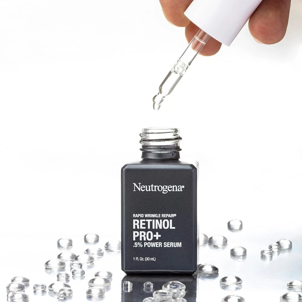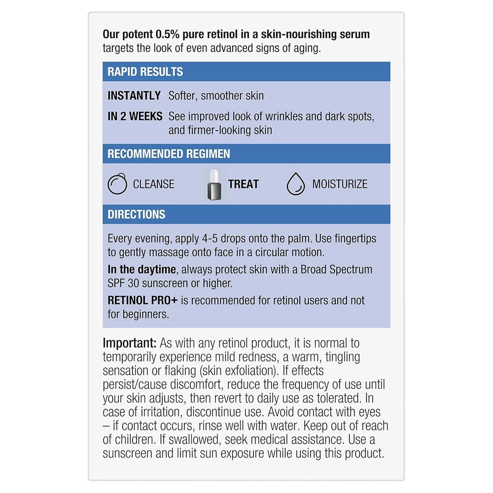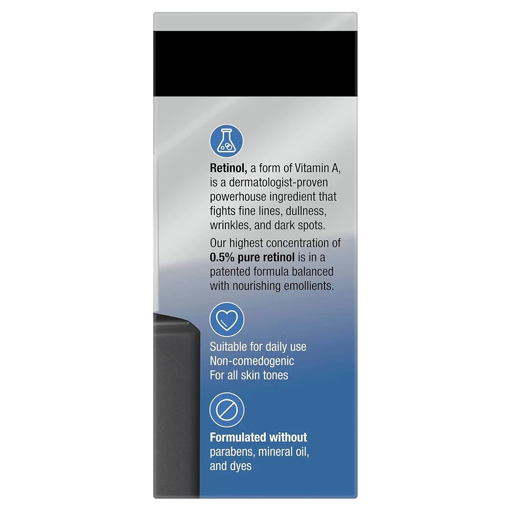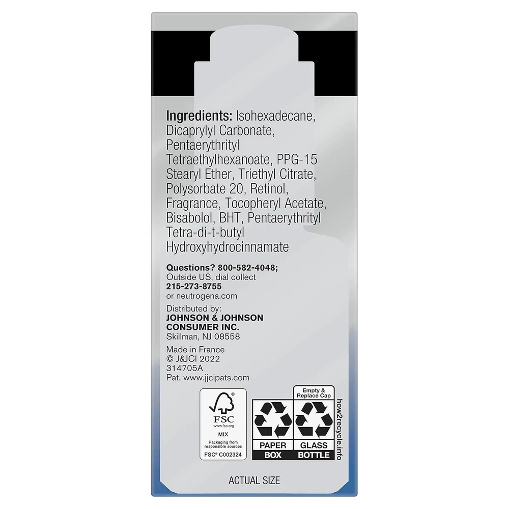 Dermatologist recommended brand. New look! 0.5% Power serum. Our highest concentration targets the look of even deep wrinkles & stubborn dark spots. Our potent 0.5% pure retinol in a skin-nourishing serum targets the look of even advanced signs of aging. Rapid Results: Instantly - Softer, smoother skin. In 2 Weeks - See improved look of wrinkles and dark spots, and firmer-looking skin. Recommended Regimen: Cleanse; Treat; Moisturize. Retinol, a form of Vitamin A, is a dermatologist-proven powerhouse ingredient that fights fine lines, dullness, wrinkles, and dark spots. Our highest concentration of 0.5% pure retinol is in a patented formula balanced with nourishing emollients. Suitable for daily use. Non-comedogenic. For all skin tones. Formulated without parabens, mineral oil, and dyes. neutrogena.com. how2recycle.info. www.fsc.org. Questions? 800-582-4048; Outside US, dial collect 215-273-8755 or neutrogena.com. FSC: Mix - Packaging from responsible sources. www.fsc.org. Made in France.