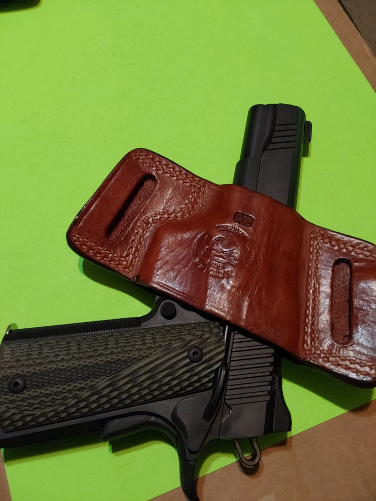 NEVADA GUN LEATHER 1911 STYLE R/H HOLSTER AS PICTURED I HAVE MY 1911 KIMBER 9MM FOR PICTURE PURPOSES ONLY. SHIPPED USPS GROUND ADVANTAGE IN BUBBLE ENVELOPE