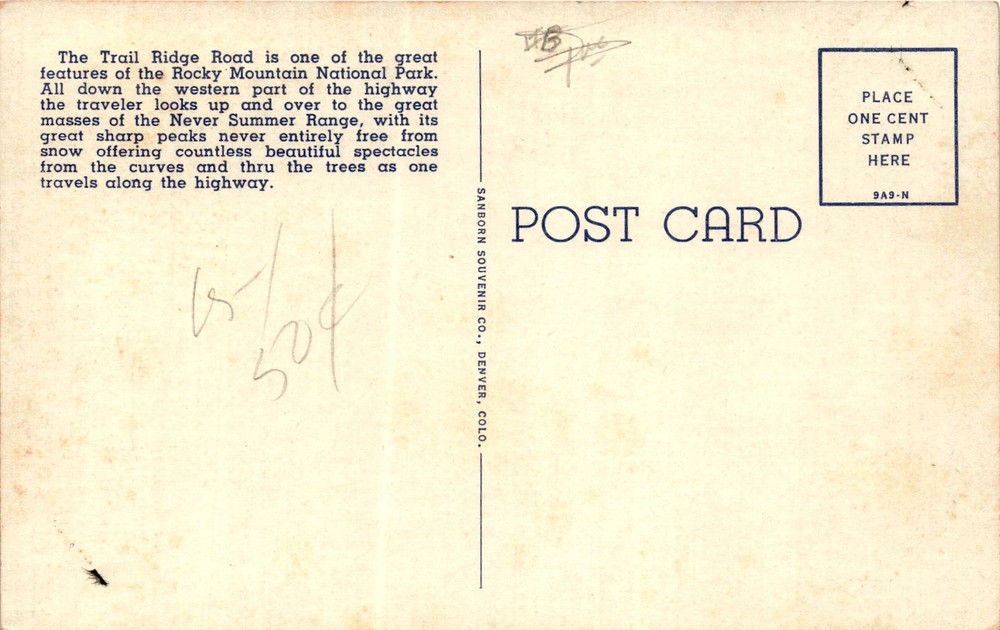 MAKE AN OFFER. THE MORE YOU BUY THE BETTER DEAL I WILL ACCEPT The postcard depicts the Never Summer Range as seen from the western slope of the Trail Ridge Road in Rocky Mountain National Park, Colorado. The Trail Ridge Road is highlighted as a significant feature of the park, offering stunning views of the Never Summer Range. The range is described as having sharp peaks that are often snow-capped, providing beautiful spectacles for travelers along the highway.