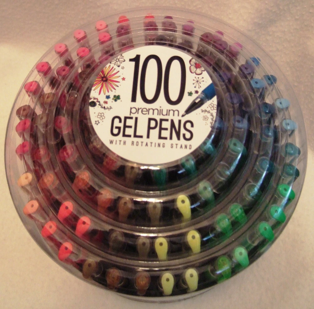 New 100 Gelwriter Pens Gel Writer Storage Rack Set Glitter Neon Metallic Pastel New 100 Gelwriter Pens Gel Writer Storage Rack Set. Features: Acid-free archival quality ink Quick drying and fade resistant ink Latex-free comfort grips Water resistant Check safe Round Rotating Pen Stand Ink Styles: Basic Metallic Neon Neon Glitter Pastel Colored Glitter Get this great bargain today! This item is BRAND NEW. All items are described as best as possible. This item comes from a smoke-free home. Feedback will be left after buyer's satisfaction notification to seller. Check out my other items ! Be sure to add me to your favorites list !