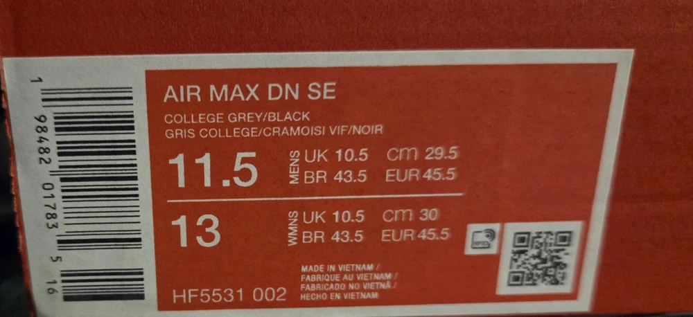 Shoe Shaft Style:Low TopUK Shoe Size:10.5US Shoe Size:11.5Season:Spring, SummerPerformance/Activity:Running & JoggingStyle:SneakerFeatures:BreathableOutsole Material:RubberColor:RedProduct Line:Nike Air MaxYear Manufactured:2025Pattern:GradientModel:Nike Air Max DNRelease Year:2025Brand:NikeSilhouette:Nike Air Max DN SE College Grey Bright CrimsonClosure:Lace UpUpper Material:MeshEU Shoe Size:45.5Shoe Width:StandardStyle Code:HF5531-002Type:AthleticDepartment:MenOccasion:Activewear, Casual