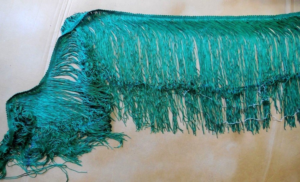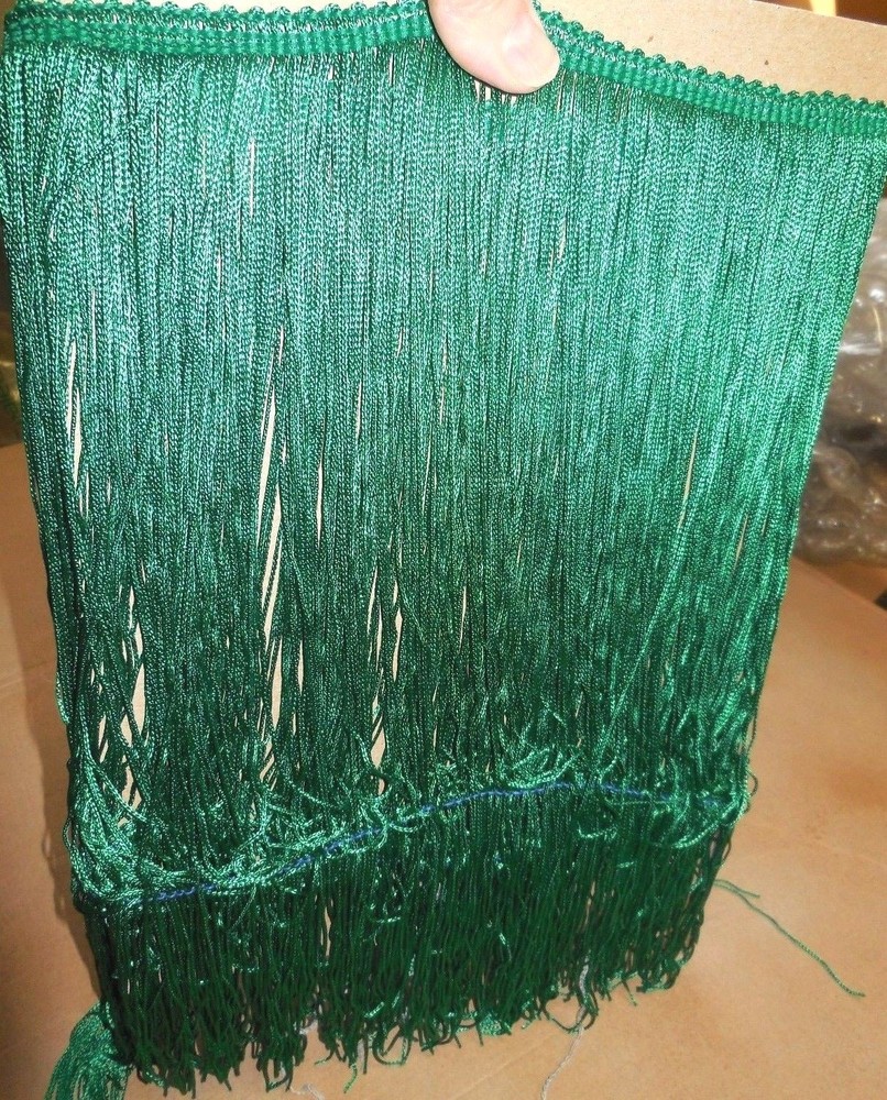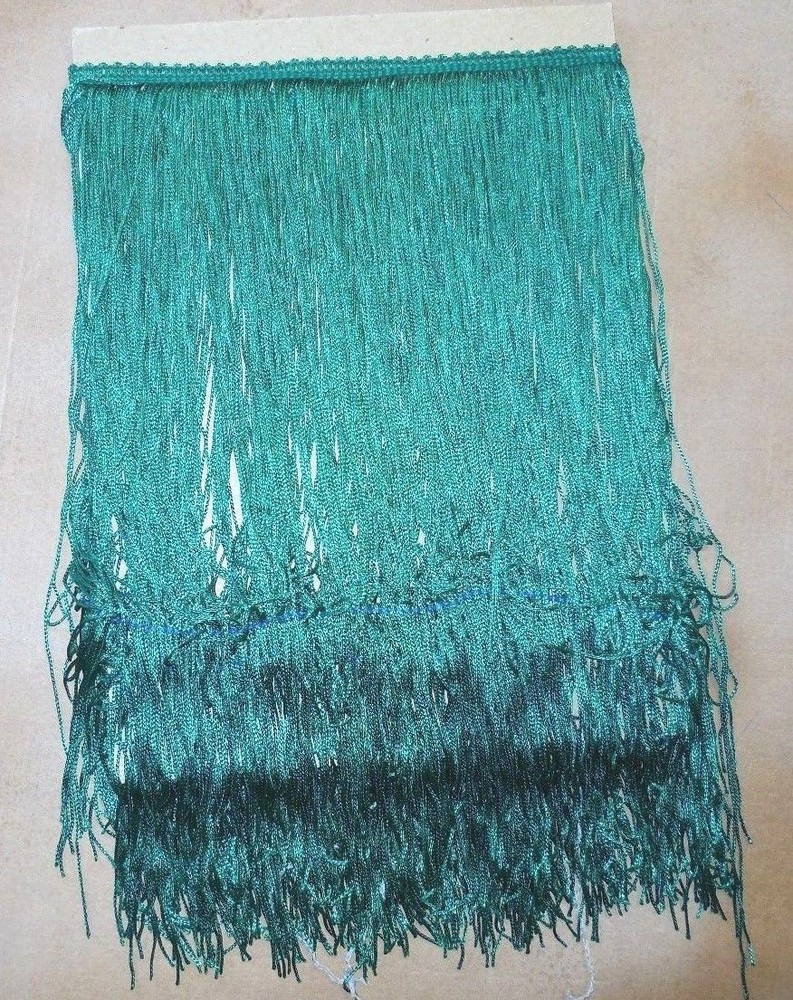 New 14" Chainette Fringe in Dark Emerald. This is a 50" piece of this beautiful shade of green that can be made into fringe skirts. About halfway down the fringe there is a contrasting thread that keeps the fringe from tangling while storing and sewing (and this thread can make it hang unevenly until it's removed after sewing it to the garment). You just pull it off after sewing it and the fringe will hang evenly.Raw goods that can be cut and sewn (or pinned) into skirts. offc/dnscbnt/grngrbx because of the guaranteed handling program, if you want to buy more than one of my items, please use the "add this to my cart" feature so you can shop without paying for items one at a time as you buy. If you do buy more than one item, normally we are able to combine anyway and we will refund extra shipping if your purchase falls within a promotional category. I have tens of thousands of dance costume items, check out our other listings! We happily combine shipping, just add the items to your cart and hit the "request an invoice from the seller" We will invoice you with actual shipping