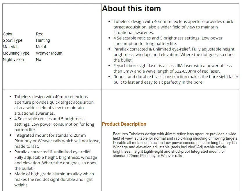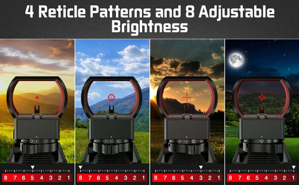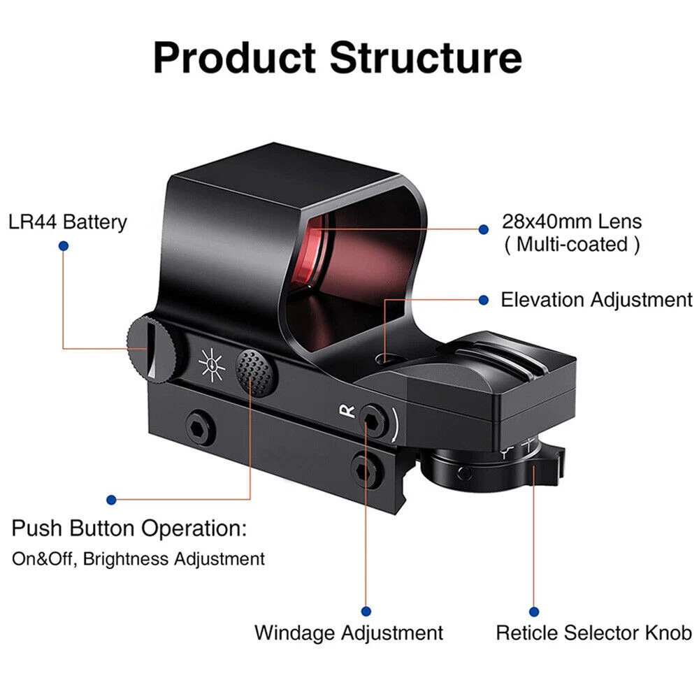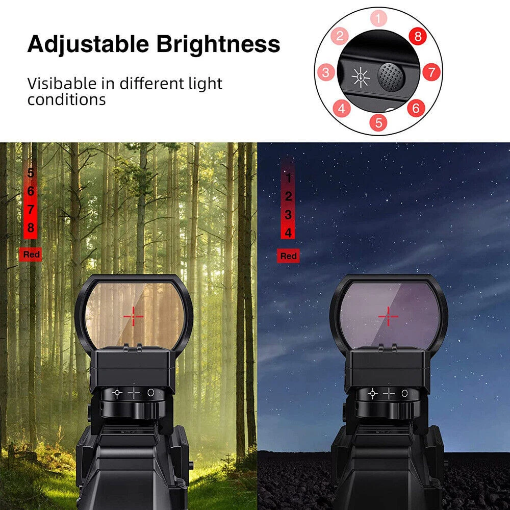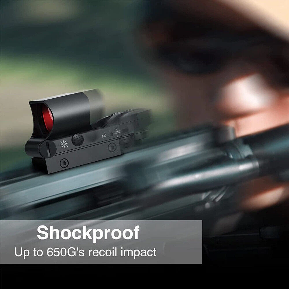 You may also like 1000X Microscope 8LED Camera Magnifier Digital for Scalp Detector Skin Analyzing 72.35 USD Free shipping 4.3'' Infrared Night Vision Rifle Scope Hunting Sight recordable Camera IR Torch 137.15 USD Free shipping 5000rpm Mini Electric Table Saw Adjustable Speed Angle Desktop Circular Cutter 162.85 USD Free shipping Boxing Training Music Electronic Boxing Wall Target Combat Smart Bluetooth APP 140.39 USD Free shipping IR Night Vision Rifle Scope Video Record Hunting Tool Optical Sight Camera 850nm 209.21 USD Free shipping Shockwave Decepticon BAIWEI TW1028 Simplified Version Deformabl Robot 200mm Toys 41.67 USD Free shipping New 48L Motorcycle Top Box Rear Storage Luggage Scooter Tail Box Waterproof Case 285.76 USD Free shipping New Wireless Guitar Transmitter Receiver Audio System 6.5/3.5MM Plug 2.4Ghz ISM 59.39 USD Free shipping 1080P IR Night Vision Monocular 5X Zoom Telescope Hunting Digital Camera &Tripod 146.57 USD Free shipping Universal Belt Pulley Geared Motor Low Noise Geared Motor High Torques 12V 250W 146.57 USD Free shipping New USB Powered Massager IR Vibration Heating For Shoulder hip bone Pain Relief 125.27 USD Free shipping Spinal Air Traction Back Belt Decompression Lumbar Waist Heating Brace Support 106.91 USD Free shipping Beauty SPA Tool Facial Skin Peeling Oxygen Water Spray Jet Hydro Exfoliating 125.27 USD Free shipping Cold Laser Red Light Infrared Therapy Device Muscle Arthritis Pain Relief 808 nm 194.39 USD Free shipping New 20mm Rail Tactical Red Dot Sight Holographic Reflex Scope for Hunting Rifle Product Feture 【More Accuracy】 Fully multi-coated red lenses of our reflex sights enhance image clarity and increase light transmission during low light situations. The 40mm reflex lens with tubeless design provides a wider field of view (15.8m@100m), parallax corrected & unlimited eye-relief, improving the accuracy of holographic sights. 【4 Tactical Reticle Options】 Illuminated reflex sights with 4 bright reticle selections provide various choices to meet different occasions. Red-Dot, Circle/Dot, Crosshair/Dot and Crosshair/Circle/Dot combinations are all in one sight, co-witnesses with your existing metal sights. 【8 Brightness Settings】 With 8 levels of brightness adjustment, red dot sight can be adjusted to fine tune your eyeshot from sunlight to dusk. The push-button design makes brightness adjustment easier. Press the button for 3 seconds to turn it off. 【Easy to install】 Reticle sight with standard 20mm mounting base installs conveniently on the picatinny rail, using included Allen wrenches. Compact battery compartment makes battery replacement easy. 【Durability】 This open reflex red dot sight with precise windage and elevation adjustments is easy to zero and holds zero well, enduring repeated use. Note: This item has a wake-up function. If it remains stationary for 4 minutes, the light will automatically turn off, Mainly used in response to unexpected situations, picking up the sight does not require turning it on again and returns to its last use state. Parameter Style: Tactical Material: Aluminum Mounting Type: Picatinny Mount Obj. Aperture: 28mmx40mm Magnification: 1x Field of View: 15.8m@100m Eye Relief: Unlimited Finish: Black Matte Dimensions: 92x43x60mm/3.6x1.7x2.3in Dot Color: Red Reticle Type: 4 Different Reticle Patterns Battery Type: 2x batteries (included) Note: This item has a wake-up function. If it remains stationary for 4 minutes, the light will automatically turn off, Mainly used in response to unexpected situations, picking up the sight does not require turning it on again and returns to its last use state. Package includes: 1x Red Dot Sight 2x Battery 2x Allen key 1x Cloth