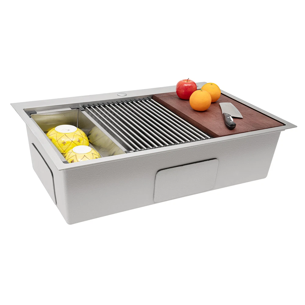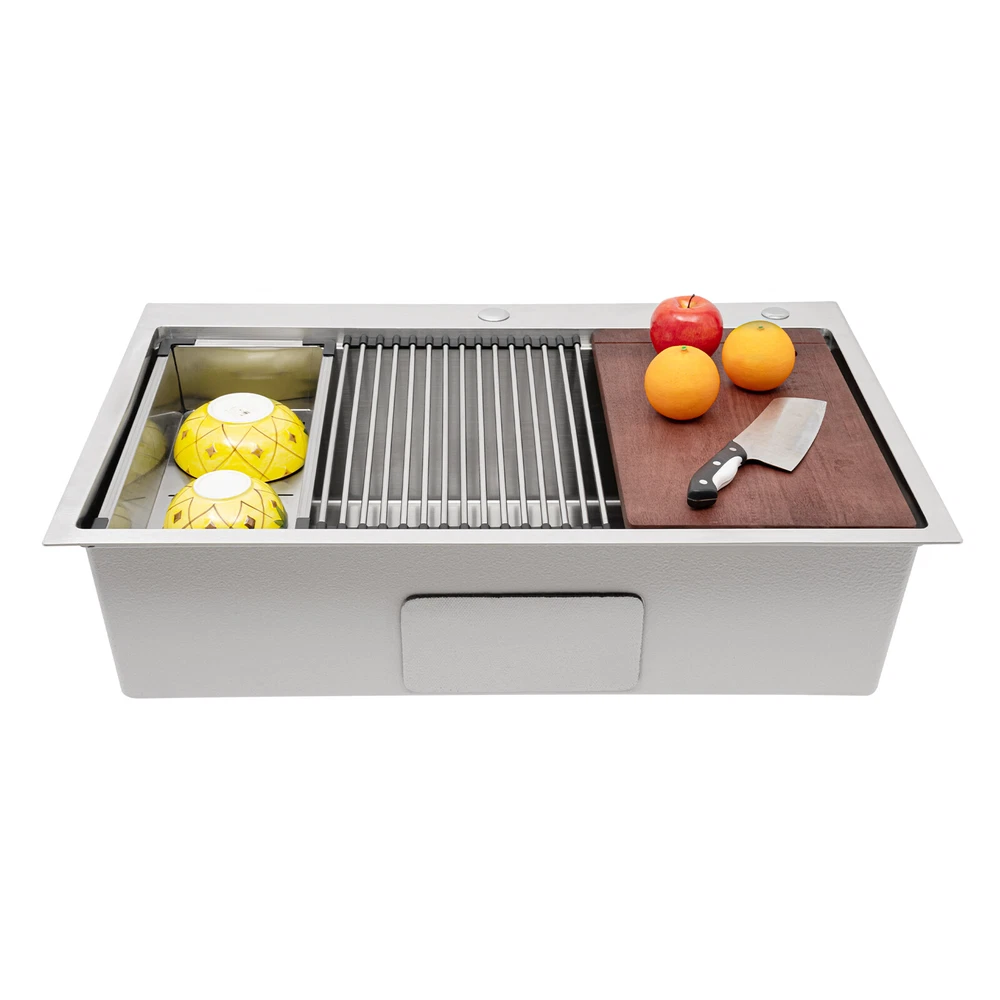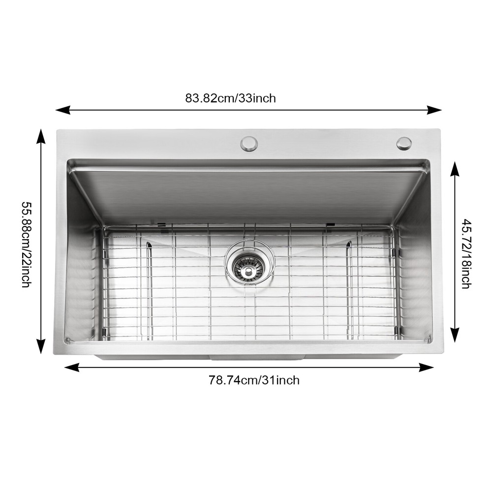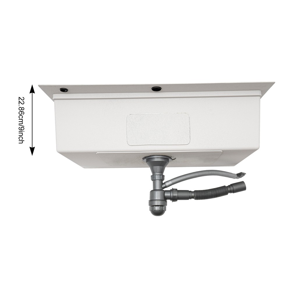 Specification Material: 304 Stainless Steel, 201 Stainless Steel, Rubber, Wood Process: Wire Drawing Color: Silver Style: Modern Shape: Rectangular Assembly Required: Yes Panel Thickness: 3mm/ 0.12in Exterior Size: 83.82*55.88 cm/ 33*22in Internal Size: 78.74*45.72 cm/ 31*18in Depth: 22.86cm/ 9in Drain Pipe Length: 75cm/ 29.53in Overflow Pipe Length: 45cm/ 17.72in Downspout Diameter: 110mm/ 4.33in Pre-drilled Hole Diameter: 30mm/ 1.18in, 28mm/ 1.1in Gross Weight: 14.5kg/ 31.97 lbs Package Size: 87.3*59.3*26.5 cm/ 34.37*23.35*10.43in Package Included 1* 304 Stainless Steel Sink 1* Cutting Board 1* Colander 1* Bottom Grid 1* Roll-Up Dish Drying Rack 1* Strainer 1* Drain Pipe 1* Overflow Pipe All Accessories for Installation New 33"x22" Single Bowl Undermount Workstation Kitchen Stainless Steel Sink SALE Welcome to our store^-^ Description This 304 stainless steel sink adopts a wire drawing process, with exquisite workmanship, which is wear-resistant and corrosion-resistant. Its enlarged and deepened sink not only alleviates splashing problems but also increases space utilization for washing large quantities of cookware. It can not only be used as a traditional sink but also can hold a cutting board for chopping vegetables and meat. With it, you can enjoy a more convenient and healthier life. Specification Material: 304 Stainless Steel, 201 Stainless Steel, Rubber, Wood Process: Wire Drawing Color: Silver Style: Modern Shape: Rectangular Assembly Required: Yes Panel Thickness: 3mm/ 0.12in Exterior Size: 83.82*55.88 cm/ 33*22in Internal Size: 78.74*45.72 cm/ 31*18in Depth: 22.86cm/ 9in Drain Pipe Length: 75cm/ 29.53in Overflow Pipe Length: 45cm/ 17.72in Downspout Diameter: 110mm/ 4.33in Pre-drilled Hole Diameter: 30mm/ 1.18in, 28mm/ 1.1in Gross Weight: 14.5kg/ 31.97 lbs Package Size: 87.3*59.3*26.5 cm/ 34.37*23.35*10.43in Package Included 1* 304 Stainless Steel Sink 1* Cutting Board 1* Colander 1* Bottom Grid 1* Roll-Up Dish Drying Rack 1* Strainer 1* Drain Pipe 1* Overflow Pipe All Accessories for Installation Key Features Build to Last: The premium 304 stainless steel and 201 stainless steel, as well as the exquisite wire drawing process, make this product bright, wear-resistant, heat-resistant, corrosion-resistant, and not easy to rust and deform, ensuring a long service life. Large Sink Size: It is large (31*18*9 inches) and can accommodate a large number of plates, dishes, and pots at once. Moreover, it prevents splashing when washing fruits and vegetables. Humanized Design: The anti-condensation coating prevents condensation in the sink and thus prevents moisture in the kitchen cabinets. The rubber soundproof mats on the surrounds and bottom reduce noise. Additionally, the rear drain design effectively increases the utilization of cabinet space underneath the sink. Multi-functional: Designed with steps at the front and back, this sink converts into a work platform where you can place a cutting board, roll holder, and colander to save space and increase efficiency. Quick Drainage: It has a sloping bottom and an X-shaped water guide for good drainage, effectively preventing water from accumulating inside. In addition, the 4.33-inch large-diameter downspout allows water to drain quickly and efficiently. Easy Installation: The simple structure and complete set of mounting accessories allow for fast and accurate installation. In addition, different mounting methods can meet your different needs. Easy to Clean: The smooth surface and round corner allow you to easily clean it without leaving dead corners of dirt accumulation. Details Double Pre-drilled Holes: You can install a faucet(not included) on one hole and a soap dispenser(not included) or water purifier faucet on the other as needed to make cleaning easier. Thickened Panel: The 3mm thickened panel can provide better support and load-bearing force for the sink. Useful Strainer: The rounded center carry handle helps to easily lift the sink strainer basket for quick draining, making cleaning easier. Drain Pipe: It can be bent freely to suit the installation position, reducing restrictions on use. Arcs Shape: The rounded and smooth edges not only add to the aesthetics of the product but also improve the safety of use. Application This product can be widely used in homes, restaurants, laundry rooms, basements, bars, kitchens, food trucks, dessert shops, coffee shops, hotels, garages, gardens, pet shops, etc. for cleaning tableware, vegetables, fruits, pets, etc. Notes Please allow the slight color difference caused by the shooting light and the 1-3 cm error due to manual measurement, and make sure you do not mind before ordering. Payment Delivery details Terms of sales About us Contact us Payment We accept ebay payment 。 Fees such as import duties, taxes are not included in the item price or shipping costs. These charges are the buyer's responsibility. Delivery details Shipping: 2-9 working days to: USA Terms of sales We maintain high standards of excellence and strive for hundred percent customer satisfaction. Feedback is very important to us. We hope that you contact us immediately before you give neutral or negative feedback, so that we can address your concerns. It is impossible to address issues if we do not know about them! About us Your satis faction is our ultimate goal. We work hard to earn your trust and future business. Our certified technicians have tested each item before shipping. The unit comes with 1 year limited warranty on all manufacturing defects. a) If you receive a defective item, you may return it or ask for a discount. Please contact us within 14 days after you receive the package. b) What you returned must be intact and in its original packaging as re? u. Customer is responsible for shipping costs of the returned item. c) We will cover the cost of shipping back t with the shipping rate indicated in the registration page. We will send you a new unit or refund the full payment you paid. Thank you. Contact us Busine