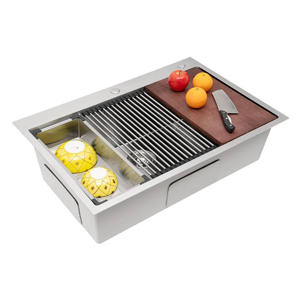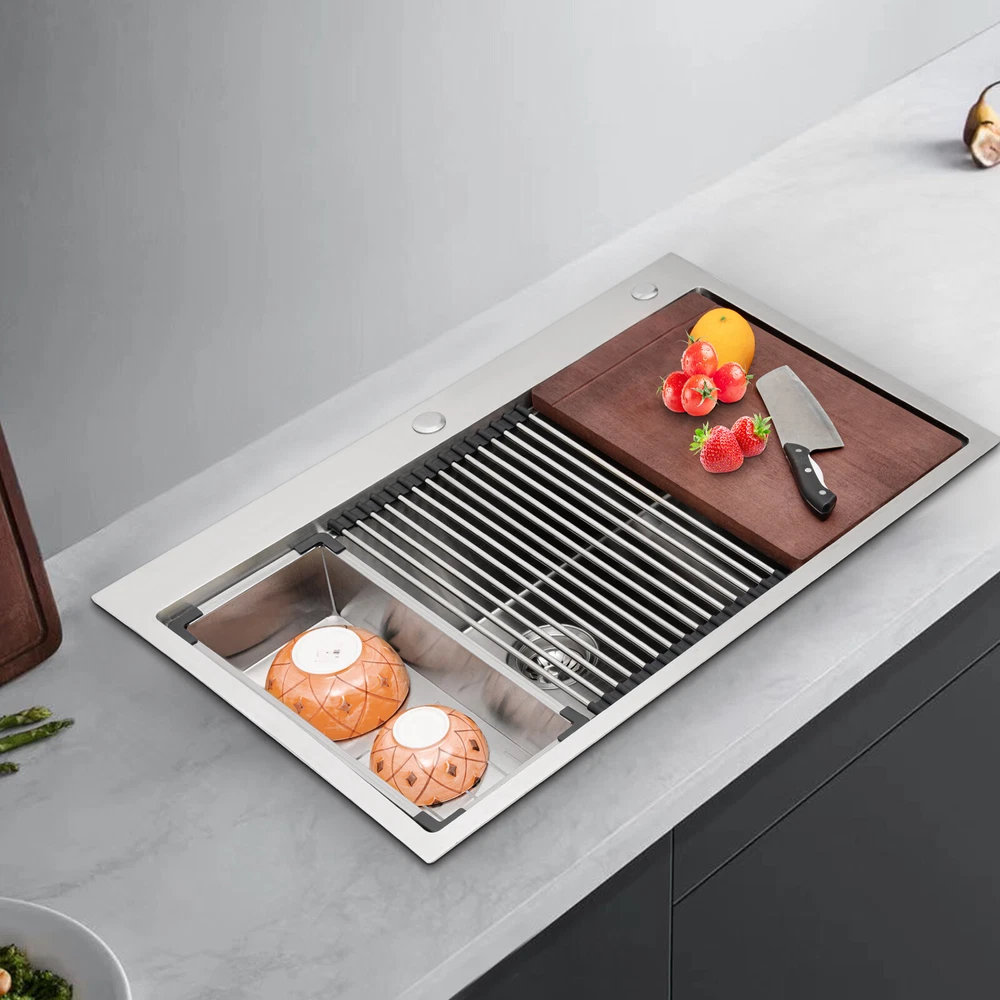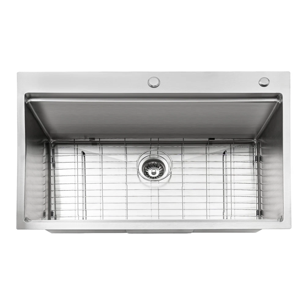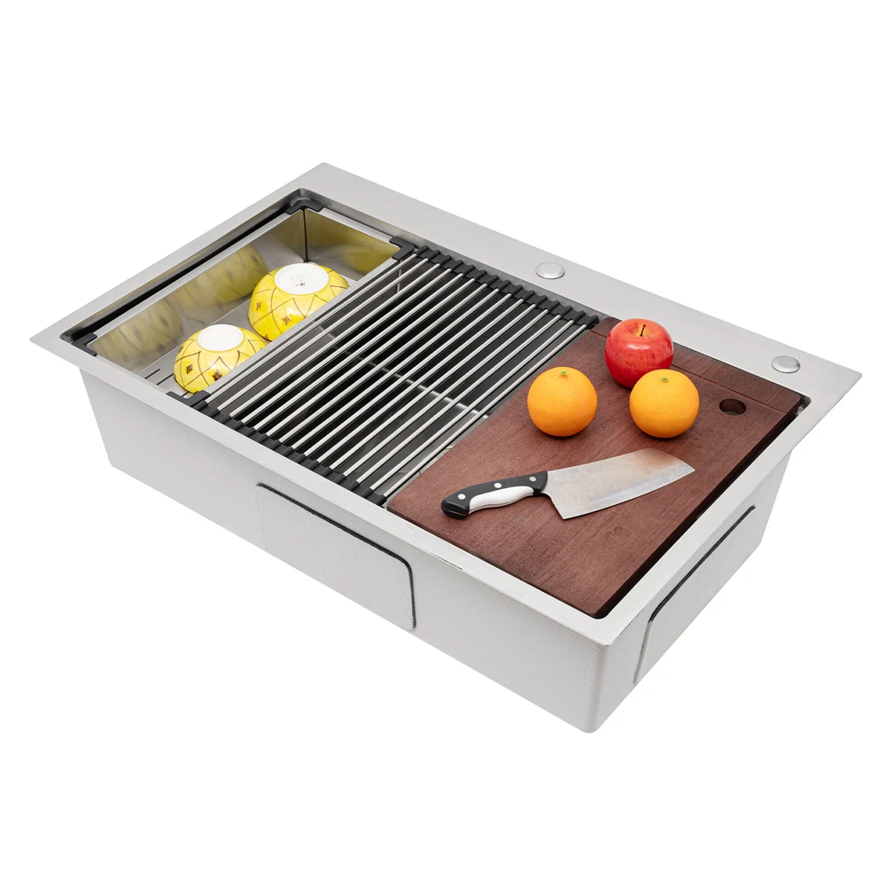 Specification Material: 304 Stainless Steel, 201 Stainless Steel, Rubber, Wood Process: Wire Drawing Color: Silver Style: Modern Shape: Rectangular Assembly Required: Yes Panel Thickness: 3mm/ 0.12in Exterior Size: 83.82*55.88 cm/ 33*22in Internal Size: 78.74*45.72 cm/ 31*18in Depth: 22.86cm/ 9in Drain Pipe Length: 75cm/ 29.53in Overflow Pipe Length: 45cm/ 17.72in Downspout Diameter: 110mm/ 4.33in Pre-drilled Hole Diameter: 30mm/ 1.18in, 28mm/ 1.1in Gross Weight: 14.5kg/ 31.97 lbs Package Size: 87.3*59.3*26.5 cm/ 34.37*23.35*10.43in Package Included 1* 304 Stainless Steel Sink 1* Cutting Board 1* Colander 1* Bottom Grid 1* Roll-Up Dish Drying Rack 1* Strainer 1* Drain Pipe 1* Overflow Pipe All Accessories for Installation New 33"x22" Single Bowl Undermount Workstation Kitchen Stainless Steel Sink SALE Welcome to our store^-^ Description This 304 stainless steel sink adopts a wire drawing process, with exquisite workmanship, which is wear-resistant and corrosion-resistant. Its enlarged and deepened sink not only alleviates splashing problems but also increases space utilization for washing large quantities of cookware. It can not only be used as a traditional sink but also can hold a cutting board for chopping vegetables and meat. With it, you can enjoy a more convenient and healthier life. Specification Material: 304 Stainless Steel, 201 Stainless Steel, Rubber, Wood Process: Wire Drawing Color: Silver Style: Modern Shape: Rectangular Assembly Required: Yes Panel Thickness: 3mm/ 0.12in Exterior Size: 83.82*55.88 cm/ 33*22in Internal Size: 78.74*45.72 cm/ 31*18in Depth: 22.86cm/ 9in Drain Pipe Length: 75cm/ 29.53in Overflow Pipe Length: 45cm/ 17.72in Downspout Diameter: 110mm/ 4.33in Pre-drilled Hole Diameter: 30mm/ 1.18in, 28mm/ 1.1in Gross Weight: 14.5kg/ 31.97 lbs Package Size: 87.3*59.3*26.5 cm/ 34.37*23.35*10.43in Package Included 1* 304 Stainless Steel Sink 1* Cutting Board 1* Colander 1* Bottom Grid 1* Roll-Up Dish Drying Rack 1* Strainer 1* Drain Pipe 1* Overflow Pipe All Accessories for Installation Key Features Build to Last: The premium 304 stainless steel and 201 stainless steel, as well as the exquisite wire drawing process, make this product bright, wear-resistant, heat-resistant, corrosion-resistant, and not easy to rust and deform, ensuring a long service life. Large Sink Size: It is large (31*18*9 inches) and can accommodate a large number of plates, dishes, and pots at once. Moreover, it prevents splashing when washing fruits and vegetables. Humanized Design: The anti-condensation coating prevents condensation in the sink and thus prevents moisture in the kitchen cabinets. The rubber soundproof mats on the surrounds and bottom reduce noise. Additionally, the rear drain design effectively increases the utilization of cabinet space underneath the sink. Multi-functional: Designed with steps at the front and back, this sink converts into a work platform where you can place a cutting board, roll holder, and colander to save space and increase efficiency. Quick Drainage: It has a sloping bottom and an X-shaped water guide for good drainage, effectively preventing water from accumulating inside. In addition, the 4.33-inch large-diameter downspout allows water to drain quickly and efficiently. Easy Installation: The simple structure and complete set of mounting accessories allow for fast and accurate installation. In addition, different mounting methods can meet your different needs. Easy to Clean: The smooth surface and round corner allow you to easily clean it without leaving dead corners of dirt accumulation. Details Double Pre-drilled Holes: You can install a faucet(not included) on one hole and a soap dispenser(not included) or water purifier faucet on the other as needed to make cleaning easier. Thickened Panel: The 3mm thickened panel can provide better support and load-bearing force for the sink. Useful Strainer: The rounded center carry handle helps to easily lift the sink strainer basket for quick draining, making cleaning easier. Drain Pipe: It can be bent freely to suit the installation position, reducing restrictions on use. Arcs Shape: The rounded and smooth edges not only add to the aesthetics of the product but also improve the safety of use. Application This product can be widely used in homes, restaurants, laundry rooms, basements, bars, kitchens, food trucks, dessert shops, coffee shops, hotels, garages, gardens, pet shops, etc. for cleaning tableware, vegetables, fruits, pets, etc. Notes Please allow the slight color difference caused by the shooting light and the 1-3 cm error due to manual measurement, and make sure you do not mind before ordering. Payment Delivery details Terms of sales About us Contact us Payment We accept ebay payment 。 Fees such as import duties, taxes are not included in the item price or shipping costs. These charges are the buyer's responsibility. Delivery details Shipping: 2-9 working days to: USA Terms of sales We maintain high standards of excellence and strive for hundred percent customer satisfaction. Feedback is very important to us. We hope that you contact us immediately before you give neutral or negative feedback, so that we can address your concerns. It is impossible to address issues if we do not know about them! About us Your satis faction is our ultimate goal. We work hard to earn your trust and future business. Our certified technicians have tested each item before shipping. The unit comes with 1 year limited warranty on all manufacturing defects. a) If you receive a defective item, you may return it or ask for a discount. Please contact us within 14 days after you receive the package. b) What you returned must be intact and in its original packaging as re? u. Customer is responsible for shipping costs of the returned item. c) We will cover the cost of shipping back t with the shipping rate indicated in the registration page. We will send you a new unit or refund the full payment you paid. Thank you. Contact us Busine