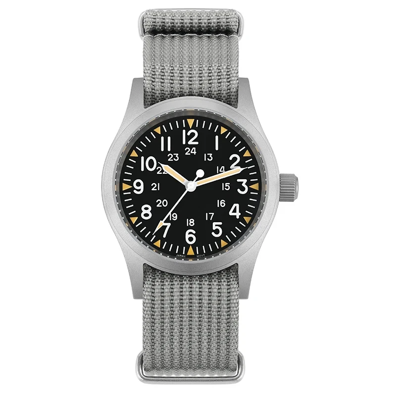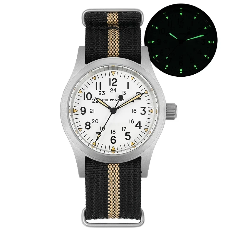 New 38Mm Watch Quartz Movement Field Watches Domed Sapphire Crystal Wristwatch This product data sheet is originally written in English. Militado ML05 38mm Vintage Watch VH31 Quartz Movement Field Watches Domed Sapphire Crystal With High Clear AR Coating Wristwatch Militado ML05 38mm 빈티지 시계 VH31 쿼츠 무브먼트 필드 시계 돔형 사파이어 크리스탈 고투명 AR 코팅 손목 시계 Buyers Wearing Watches Product Parameter Model: ML05 Field Movement: VH31 [Sweep Seconds Quartz] Crystal: Top Hat Domed Sapphire Crystal With High Clear AR Coating Case: 38mm diameter, sand blast Lug to Lug length: 47.5mm Thickness: 10.5mm Lug to lug width: 20mm Lug:drilled lug hole Bezel: Fixed Luminous: Super C3 Green Bracelet: Khaki Black or Green Nylon Strap Crown: Screw Down Water Resistant: 10Bar=100 meters Warranty: 2 Year 제품 매개변수 모델: ML05 필드 무브먼트: VH31 [스윕 세컨드 쿼츠] 크리스털: 높은 투명도 AR 코팅이 된 탑햇 돔형 사파이어 크리스탈 케이스: 직경 38mm, 샌드 블라스트 러그 간 길이: 47.5mm 두께: 10.5mm 러그 간 너비: 20mm 러그: 드릴로 뚫은 러그 홀 베젤: 고정 발광: 슈퍼 C3 그린 브레이슬릿: 카키 블랙 또는 그린 나일론 스트랩 크라운: 나사 고정 방수: 10Bar=100미터 보증: 2년 Militado ML05 38mm Vintage Watch VH31 Quartz Movement Field Watches Domed Sapphire Crystal With High Clear AR Coating Wristwatch Militado ML05 38mm 빈티지 시계 VH31 쿼츠 무브먼트 필드 시계 돔형 사파이어 크리스탈 고투명 AR 코팅 손목 시계 Buyers Wearing Watches Product Parameter Model: ML05 Field Movement: VH31 [Sweep Seconds Quartz] Crystal: Top Hat Domed Sapphire Crystal With High Clear AR Coating Case: 38mm diameter, sand blast Lug to Lug length: 47.5mm Thickness: 10.5mm Lug to lug width: 20mm Lug:drilled lug hole Bezel: Fixed Luminous: Super C3 Green Bracelet: Khaki Black or Green Nylon Strap Crown: Screw Down Water Resistant: 10Bar=100 meters Warranty: 2 Year 무브먼트: VH31 [스윕 세컨드 쿼츠] 크리스털: 높은 투명도 AR 코팅이 된 탑햇 돔형 사파이어 크리스탈 케이스: 직경 38mm, 샌드 블라스트 러그 간 길이: 47.5mm 러그 간 너비: 20mm 러그: 드릴로 뚫은 러그 홀 브레이슬릿: 카키 블랙 또는 그린 나일론 스트랩 방수: Brand Does not apply Department Does not apply band material type Nylon display type Arabic numeral markers hign-concerned chemical none feature Water Resistant band length 17 style simple clasp type Buckle origin Mainland China movement VH31 [Sweep Seconds Quartz] water resistance depth 10Bar case material STAINLESS STEEL case thickness 10.5 boxes & cases material Plastic model ML05 case shape Round dial window material type Sapphire Crystal item type Quartz Wristwatches crystal Domed Sapphire Crystal With High Clear AR Coating case 38mm diameter luminous Super C3 Green crown Screw Down water resistant 10Bar=100 meters choice yes semi_choice yes Type Does not apply