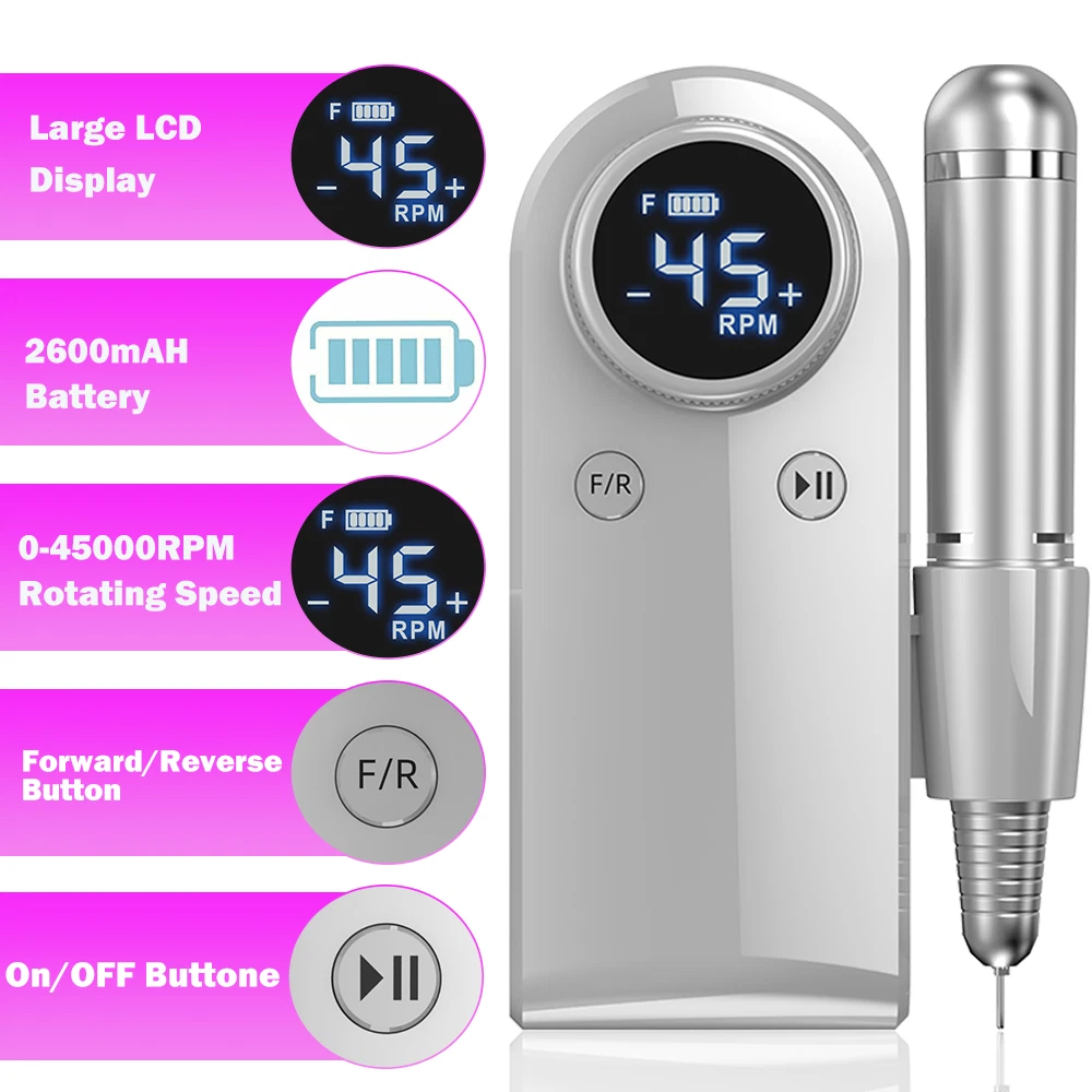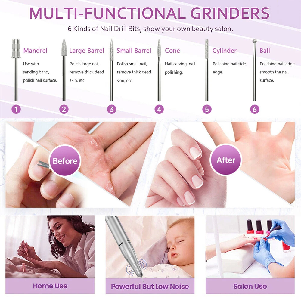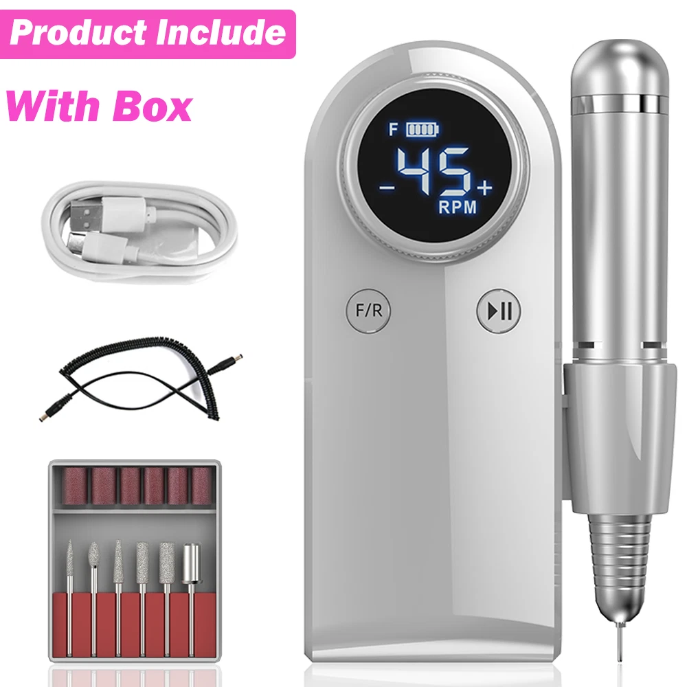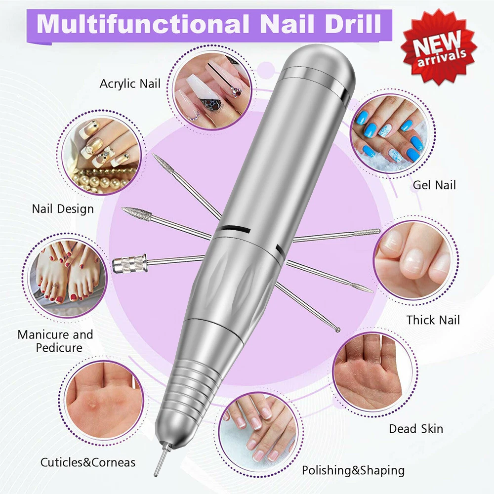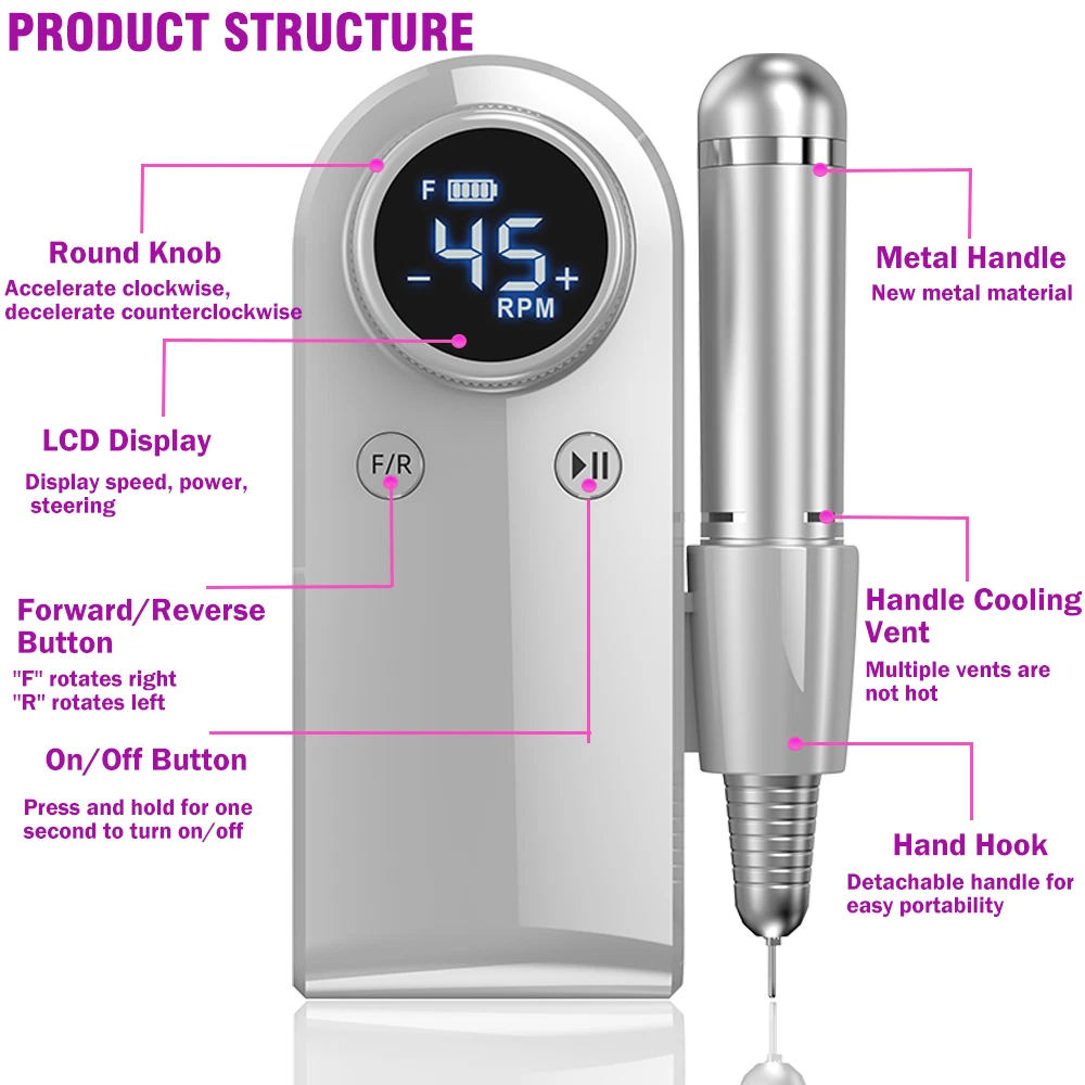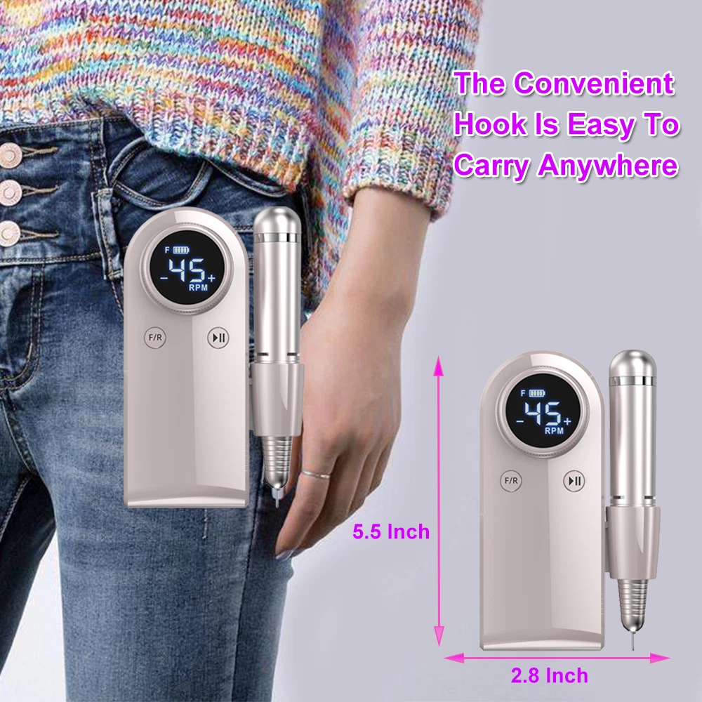Features : 1. Rechargeable & Portable: The nail drill built in 2600mAH battery. After about 2 h charged, this electric file can use without plugging in the outlet and lasts 8-10 hour operation time. With its compact size and light weight, it can be easily to carry, convenient for you to use it anytime, anywhere. Portable clips at the rear of the body, can be hung in a belt or placed in a bag or box. 2. Adjustable speed and LED Screen : 0-45000RPM high speed and you can control the speed by a rotary switch on the top of machine. The LCD display can clearly show you the speed and the power status. 3. Low heat/vibration/noise handpiece: The special material and ample ventilation holes design enable it to have excellent heat dissipation function. Good quality makes it extremely quiet and smooth with slight vibration when doing nail care. 4. Multi-function and F/R direction : Electric Nail Drill Machine comes with 6pcs interchangeable nail drill bits (3/32”) for easily grinding, carving, cutting, polishing, removing gel polish and cuticles for both nails and natural nails. And the design with Forward and Reverse rotation directions are suitable for right hand or left hand use. 5. All-in-one Pack: comes with a plastic holder to for the handpiece, has a cradle to secure the handpiece from falling off the desk during operation; 6 drill bits, 6 sanding bands; Technical Specification : Color: Cl a ssic Gold / Classic Green/ Pearl White Dimension: 5.5 * 2.8 * 0.98 inch Rotary Speed: 0~45,000 RPM Power: 18W Charge Time: 1 Hours Working Time: 15 Hours Battery Capacity: 4000mAH Input Voltage Range: AC 100-240V/50-60(Hz) Output Voltage: DC 15V/2A Package Includes : 1 x Portable Nail Drill Machine 1 x Handpiece 1 x USB Charger 6 x Drill Bits 6 x Sanding bands 1 x User Manual
