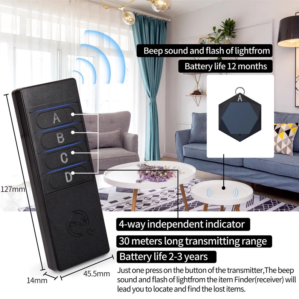 You may also like 60pcs Dial Feet Stickers Watch Movement Repairment Spare Parts Watchmaker Tool g 20.99 USD Free shipping A380 Qantas Australian Civil Airliner Aircraft Plane Aviation Model With Stand j 12.99 USD Free shipping RCA to HDMI Converter, Composite to HDMI Adapter Support 1080P PAL/NTSC A 16.99 USD Free shipping 1 Set Luminous Watch Hands For NH35/NH36 Watch Movement Replacement Parts 10.69 USD Free shipping Tri-band N9 MINI GSM AUDIO LISTENING BUG 2x SENSITIVE MICROPHONE Ear Bug Device 17.99 USD Free shipping 21,600bph Date At 6 Automatic Mechanical Watch Movement w/ Stem for NH35 NH35A 63.99 USD Free shipping Product Description New 4-in-1 Wireless 75-80db Alarm Key Finder Anti Lost Wallet Tag Tracker Features: 1. Press And Beep Saves The App: Key Finders That Make Noise Work Via Radiofrequency And Need No App. Simply Press The Coded Button On The Transmitter, And The Corresponding Receiver Will Beep And Flash All At Once, Helping You To Find The Item Easily You Attach It To. While The Phone Dies For The Key Finder Locator App Every Now And Then, But The Wireless Key Finder Have 12 Months Long Standby Time 2. Loud Beeper, 120ft Remote Distance: With As Loud As 75-85db Beeping Volume, Even People With Poor Hearing Are Able To Locate The Lost Items Easily. Rf Wave Of The Tracking Device For Keys Can Penetrate Through Walls, Floors, Cushions, Etc. Helping You Track Down Items As Far As 30-50 M(Tested In Open Area). The Distance Being Well Able To Cover Whole Area Of Your Apartment, It' S Very Helpful As A Lost Keys Tracker, Or Tracker For Wallet, Phones, Glasses And Hiding Pets. 3. Indoor & Outdoor Use: With The Portable Size And Light Weight, The Tracker Tags Are Suitable For Both Indoor And Outdoor Use, Like When You Want To Call Back The Pet From The Yard Or Find Your Luggage In Travel. With 4 Double-Sided Sticker And 4 Key Rings Included, You Can Stick The Receiver To The Tv Remote Control, Glasses, Ear Pods, Or Attach It To Keychain, Backpack, Pets, Kids, Etc. For Mobile Phone, A Protective Cover And Lanyard Is Needed. For Wallet, Just Cast The Receiver Inside. 4. Handy And Considerate: The Transmitter Is Self-Standing, No Extra Holder Needed. Simply Set The Find My Keys Device On Top Of The Table Or Other Places Where You Remember Easily. 2 AAA Batteries Are Needed For The Transmitter. (Battery Is Not Included) Specifications: Beeping Sound: 75-80db Receiver Dimensions: 39mm* 35mm* 8mm Transmitter Dimensions: 127mm* 45.5mm* 14mm Working Frequency: 433.92mhz Operating Voltage: DC2V-3.6V Operating Temperature: -10°C~ 60°C Shell Material: ABS Circuit Board Material: Double-Sided FR4 Industrial Grade Board Receiver Sensitivity: < -113 dbm Working Distance: 30-50m (In Open Area) Transmitter Battery: 2* AAA Batteries (Batteries Not Included) Battery For Each Receiver: 1* Cr2032 Battery(Battery Included) Package Includes: 1x Transmitter 4x Receiver 4x Key Ring 4x Double-Sided Sticker 1x Adhesive Hooks Notes: 1. Sound Is Louder If You Keep All Doors Open When Finding Items In Other Rooms. 2. Actual Standby Time Depends On Use Frequency And Your AAA Battery Power Volume. 3. Long Time Storage In The Warehouse May Lower The Battery Power. Please Reach Out To Us In This Case. 4. Please Set It At Places Beyond The Reach Of Children. Shipping Contact Us We ship most of our orders within 24 hours, and may up to 48 hours from US Warehouse. In 2-5 working days, you will receive your items. Sometimes due to problems with our transportation company system, your shipping information may be delayed to update. We recommend that you try again after 3-4 days. If you still haven't checked the shipping information, you can contact us by ebay message. If you have any questions, our Customer Service staffs welcome you to email us. We strive to answer all questions and resolve any problems as quickly as possible. You can contact us 7*24, we will reply at the first time, and we will surely solve your problems. Note: 1.We try our best to reply to your emails as soon as possible, however, due to high volume of daily incoming emails and time zone difference, we may not be able to reply your emails immediately. Please allow 1 business days for us to response. If you do not receive any reply from us, please check your email ensuring your mailbox has not reached full size. 2.Due to some ISP SPAM filter settings, you may not be able to receive our replies; if you have problems receiving our emails, you may need to use a different email account to contact us. 3.Please give us the opportunity to resolve any problem. We understand the concerns and frustrations you might have, and will try our best to resolve the issues. Please email us before leaving any negative feedback or open any dispute on PayPal. 4.We care about our valued customers, and will always try to help you. So if you have any problems, please e-mail us immediately. Shipping We ship most of our orders within 24 hours, and may up to 48 hours from US Warehouse. In 2-5 working days, you will receive your items. Sometimes due to problems with our transportation company system, your shipping information may be delayed to update. We recommend that you try again after 3-4 days. If you still haven't checked the shipping information, you can contact us by ebay message. Contact Us If you have any questions, our Customer Service staffs welcome you to email us. We strive to answer all questions and resolve any problems as quickly as possible. You can contact us 7*24, we will reply at the first time, and we will surely solve your problems. Note: 1.We try our best to reply to your emails as soon as possible, however, due to high volume of daily incoming emails and time zone difference, we may not be able to reply your emails immediately. Please allow 1 business days for us to response. If you do not receive any reply from us, please check your email ensuring your mailbox has not reached full size. 2.Due to some ISP SPAM filter settings, you may not be able t