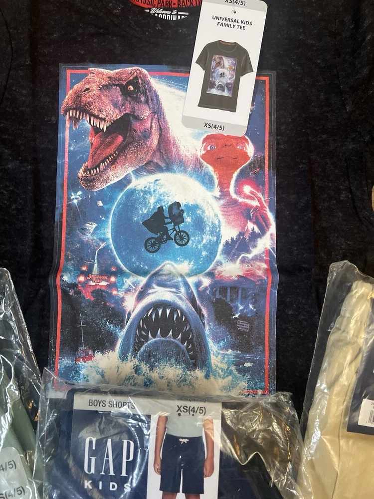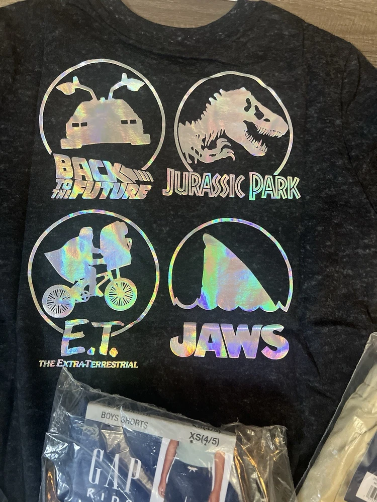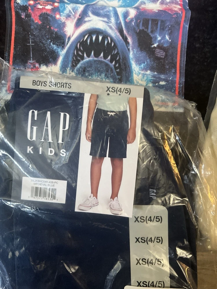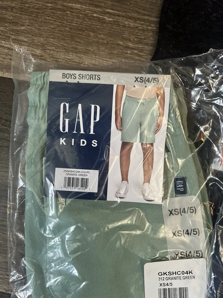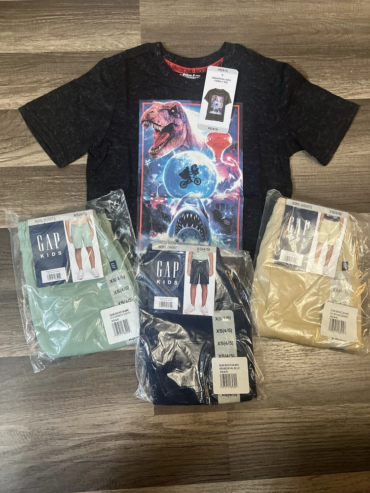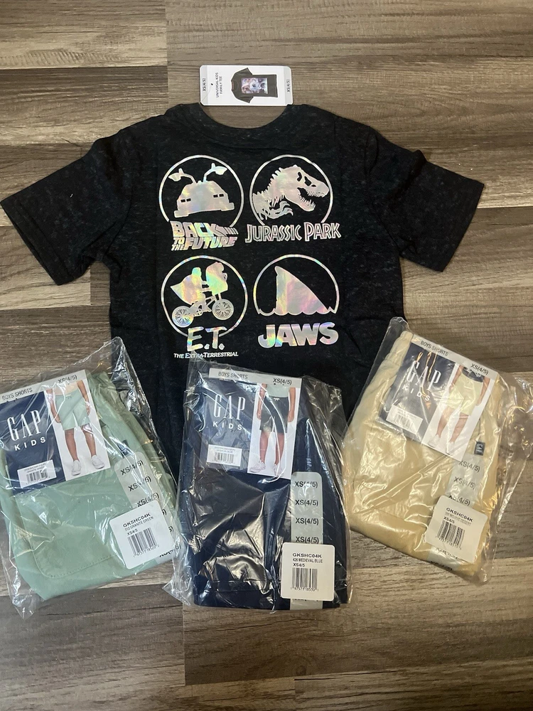 4pc New Gap Kids Shorts & shirt Lot kids youth size XS(4/5) This lot includes New with tag Gap Kids Mojave Desert shorts kids youth size XS (4/5) New with tag Gap Kids Granite Green shorts kids youth size XS (4/5) New with tag Gap Kids Medieval blue shorts kids youth size XS (4/5) New with tag Jurassic world tee kids youth XS This 4-piece lot includes a pair of shorts and a shirt from Gap, in a Mojave desert, gray, medieval blue, and granite green color with a casual style. The shorts are perfect for school or casual occasions, while the shirt is versatile enough to wear with or without the shorts. The size is a Youth XS (4/5) and the fabric wash is medium. The brand is Gap, and the shorts are designed with a regular fit for boys. The shirt is also designed for boys, and the style is casual with a touch of character. The vintage is "No". This lot is perfect for parents looking to update their child's wardrobe with stylish and comfortable clothes.