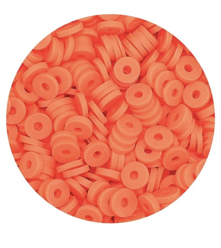 The product is a set of new 6mm vinyl heishe polymer clay African rondelle beads in an orange-red color. The beads have a 2mm hole size and are made of clay material. They are shaped like rondelles and each bead measures 6mm in size. Ideal for crafts and jewelry making projects.