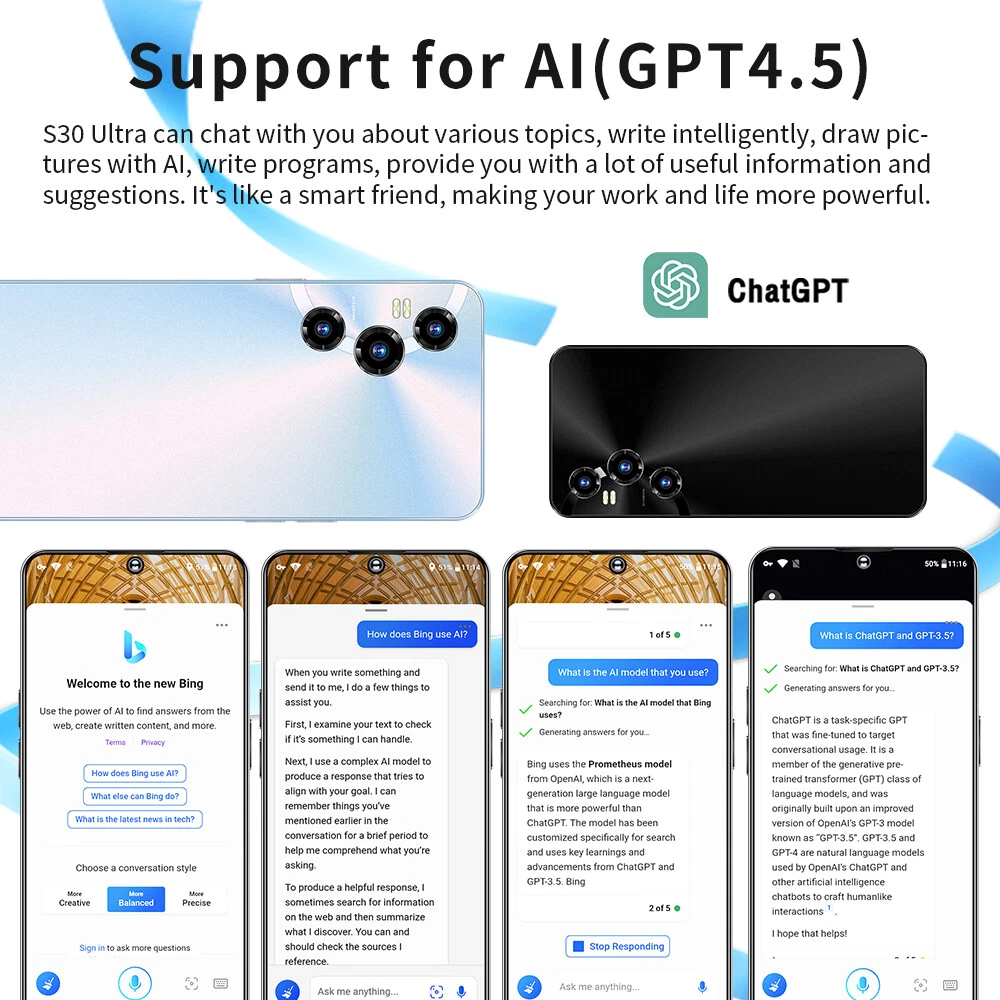 S30 Ultra 5G Smartphone 7.3" 16GB+1TB Android Mobile Phone Dual SIM OTG Type C Factory direct sales, better quality but lower price is our target and mission! Features: - 7.3inch FHD Display The S30Ultra delivers the viewing experience you always wanted, With a massive 93% screen-to-body ratio on a 7.3"inch screen. - 50MP Front Camera Clear and Stylish Selfie The S30Ultra world-leading 50MP front camera turns your every selfie into a work of art experience greater brightness, color vibrancy, clarity and dynamic range. Even in the dimmest light, whenever you need it, your S30Ultra is right there with you, capturing every moment with crystal-clear precision, Turn your selfies into masterpieces and shine in every photo. - 108MP Rear HD camera The S30Ultra features a 108MP camera combination. The main camera sports a large f/1.8 aperture and 1.28um pixels, This strong combination boosts photo-sensitivity in backlight or low light, Just point and shoot, and S30Ultra will make sure your pictures remain clear and bright. - Face Access The S30Ultra also supports facial recognition upon activation,S30Ultra scans your facial features and unlocks instantaneously accessing your phone has never been so easy, or so fun. - Powerful Performance The Snapdragon 8 gen2 mobile platform with 10mm process technology makes young people who love the young and other popular games. The game is on and lower. - Android 13.0 The new interactive design makes the operation simple and simple, the use of the mobile phone is so simple and straightforward, everything is handy. - Dual SIM card supports TF card Dual card dual standby, card slot does not distinguish between the main and the deputy, supporting the worlds 50 major communication carrier networks Specification: 1.Model No.:S30Ultra 2.Platform : Snapdragon 8 gen2, Deca Core (Latest 10 Core) 3.Standby: Dual sim dual standby 4.Screen: 7.3HD+ Full Display 1440*3200 5.Speaker: 1511 Box Speaker 6.Frequency: GSM850/900/1800/1900MHz, 3G:WCDMA850/1700/1900/2100MHz *4G:TDD(B38\B40\B41),FDD (B1\2\3\4\5\7\8\20\28A\28B) *5G 7.Vibration: Support 8.Colors: Black,White 9.Memory: 8GB RAM+256GB ROM 10.Multi Media: MP3/MP4/3GP/FM Radio/Bluetooth 11.Camera: 50MP+108MP 12.Multi Function: Full screen, Face recognition, Dual SIM,OTG, Wi-Fi, GPS,Gravity Sensor, Alarm ,Calendar ,Calculator ,Audio recorder ,Video recorder, WAP/MMS/GPRS, Image viewer,E-Book,World clock,Tasks card, rear flash 13.Languages: Muti-language support 14.Others: Android OS 13.0 System 15.Battery: 8000mAh Lithium-ion battery 16.Ultra unibody 17.TypeC input Packing list: 1 x Smartphone 1 x Charger Adapter 1 x Headphones 1 x User Manual 1 x phone case 1 x Protection film 1x OTG input