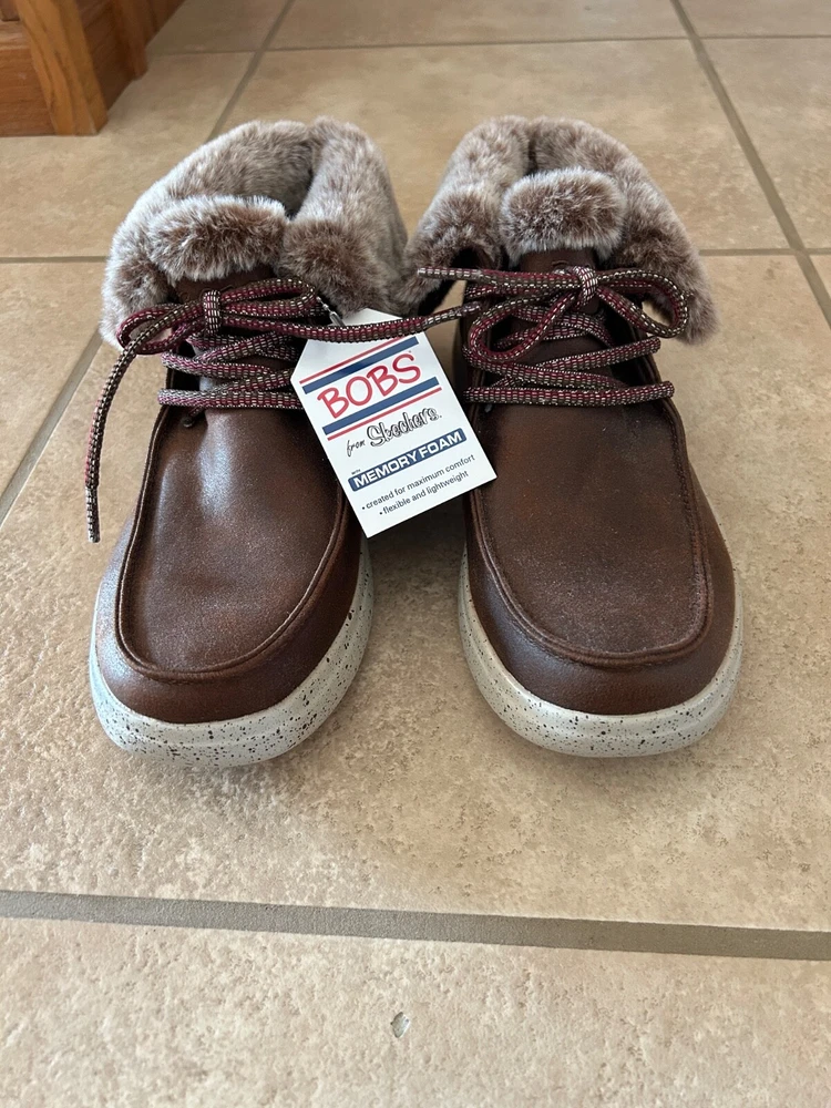 You will be both in style and dressed for comfort with these Skechers Women's BOBS Skipper Hang Glider Boots in brown. The listing is for women's size 9. Designed with a smooth leather-textured microfiber upper material and a lace-up ankle boot design with a moc toe, these boots are perfect for any occasion. The plush faux-fur fold-down collar adds a touch of elegance,w hile the rubber outsole provides great traction and durability. These ankel boots feature a chenille lining, cushioned midsole with speckle color details, and memory foam insole for extra comfort. The low heel height and flat heel style make them perfect for walking or standing for long periods of time. With a solid pattern and accents like fur trim and logo, these boots are sure to make a statment. Don't miss out on this great addition to your shoe collection. Please note: Items are from smoke-free and pet-free home. Alaska & Hawaii residents - please contact me for shipping quote, as shipping is usually a little higher than to the 48 contiguous states. International buyers - Please note: Import duties, taxes and charges are not included in the item price or shipping charges. These charges are the buyer's responsibility. Please check with your country's customs office to determine what these additional costs will be prior to bidding/buying. Track Page Views With Auctiva's Counter